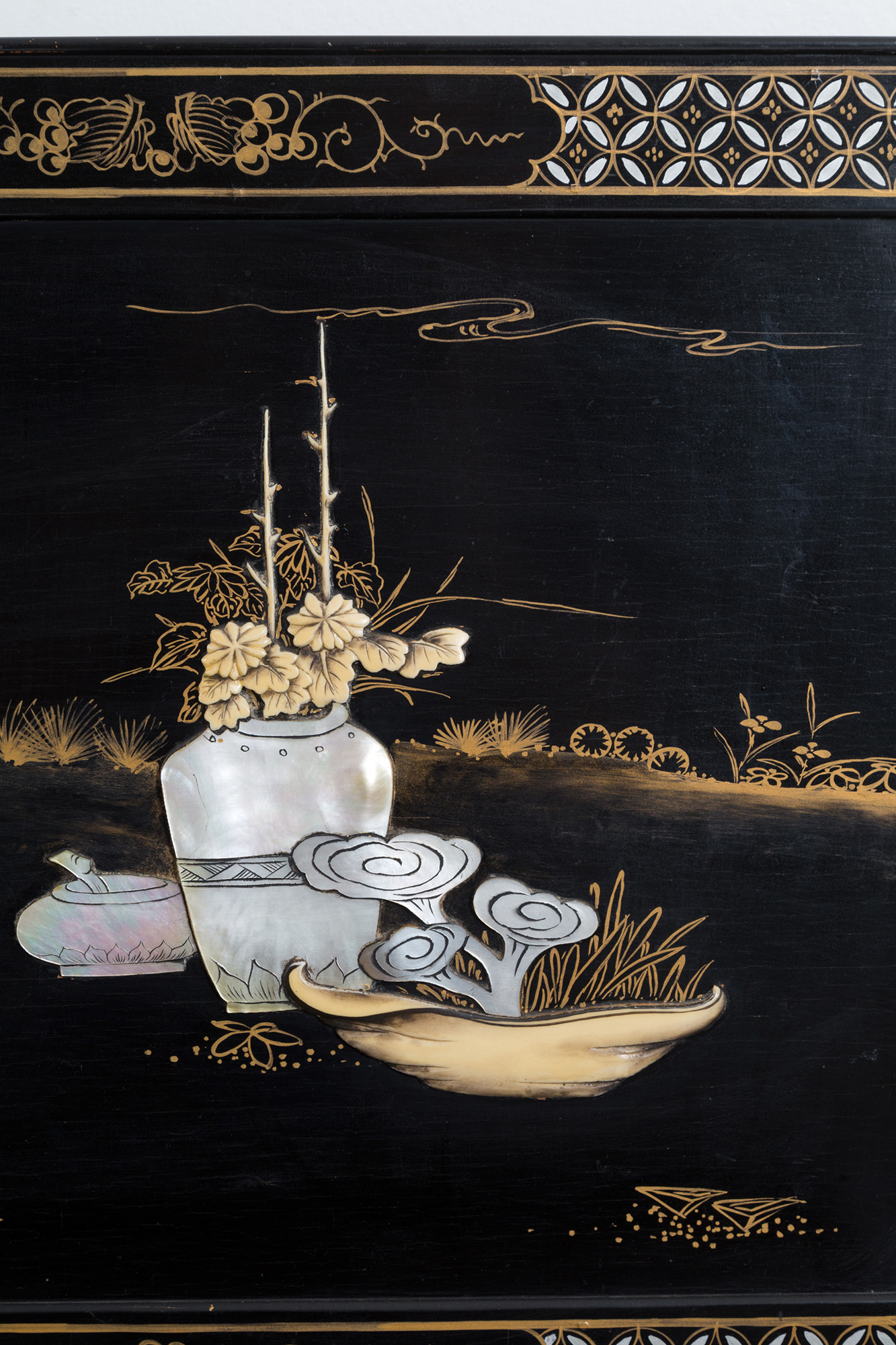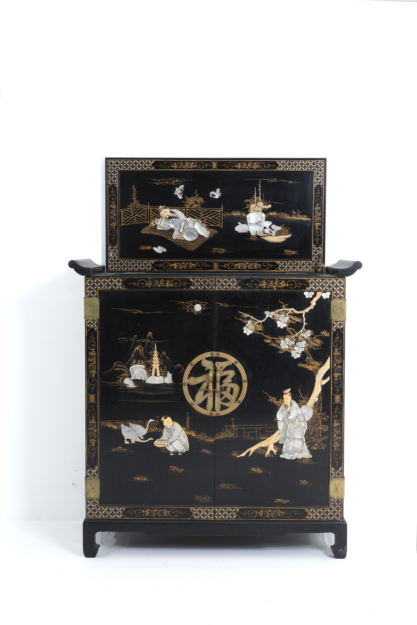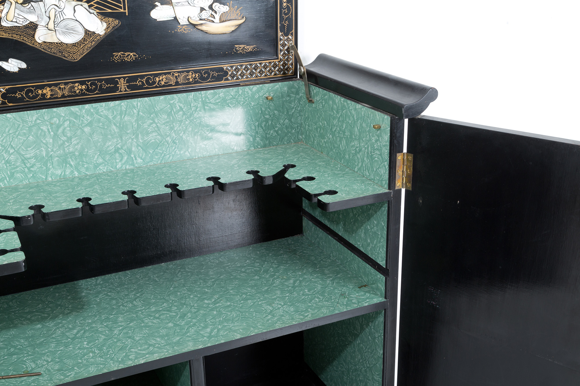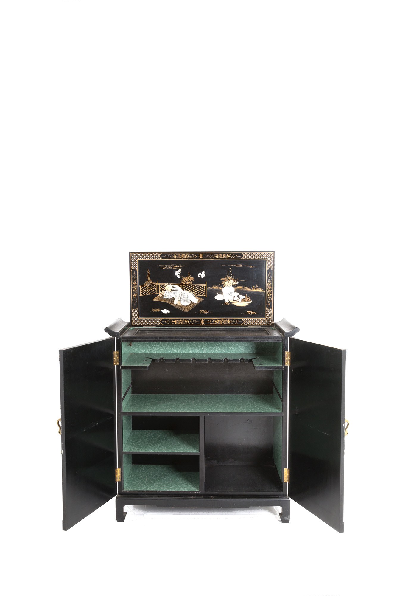 Mobile bar in legno laccato nero con applicazioni in avorio, madreperla e bronzo dorato con scene di vita orientali. Piano apribile. Fine XIX secolo. Mis. Lung. cm. 105 Alt. cm. 105 Prof. cm. 45 ca.