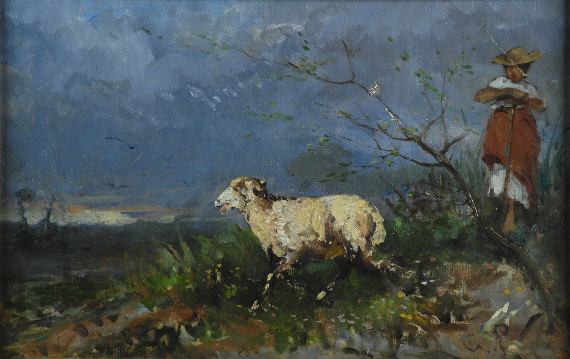 GIUSEPPE PALIZZI (Lanciano, 1812 - Parigi, 1888). Dipinto olio su tela raff. ''PAESAGGIO CON PASTORELLA E PECORA''. Siglato in basso a destra. In cornice. Restauri. Mis. Lung. cm. 49 Alt. cm. 33 ca.