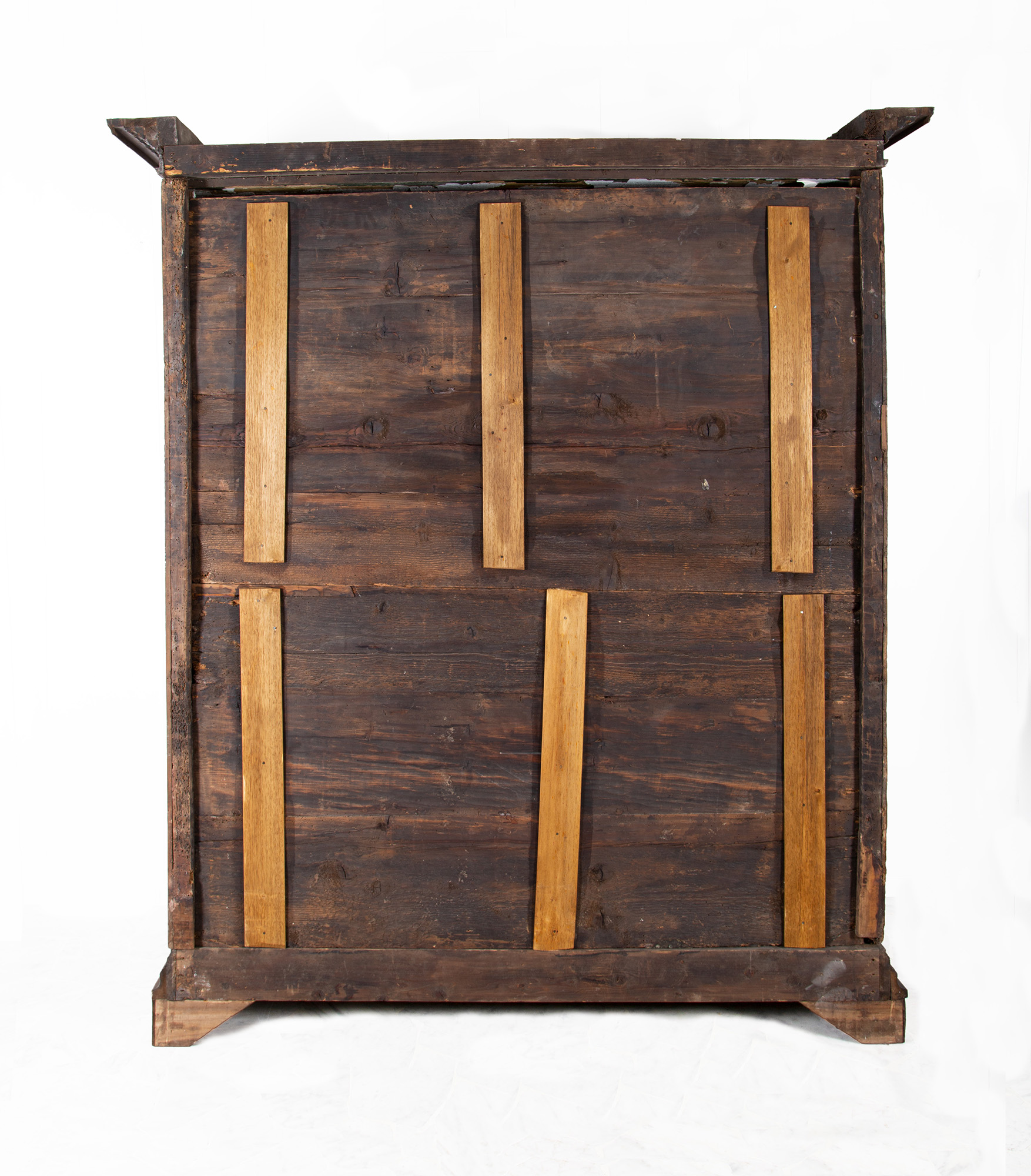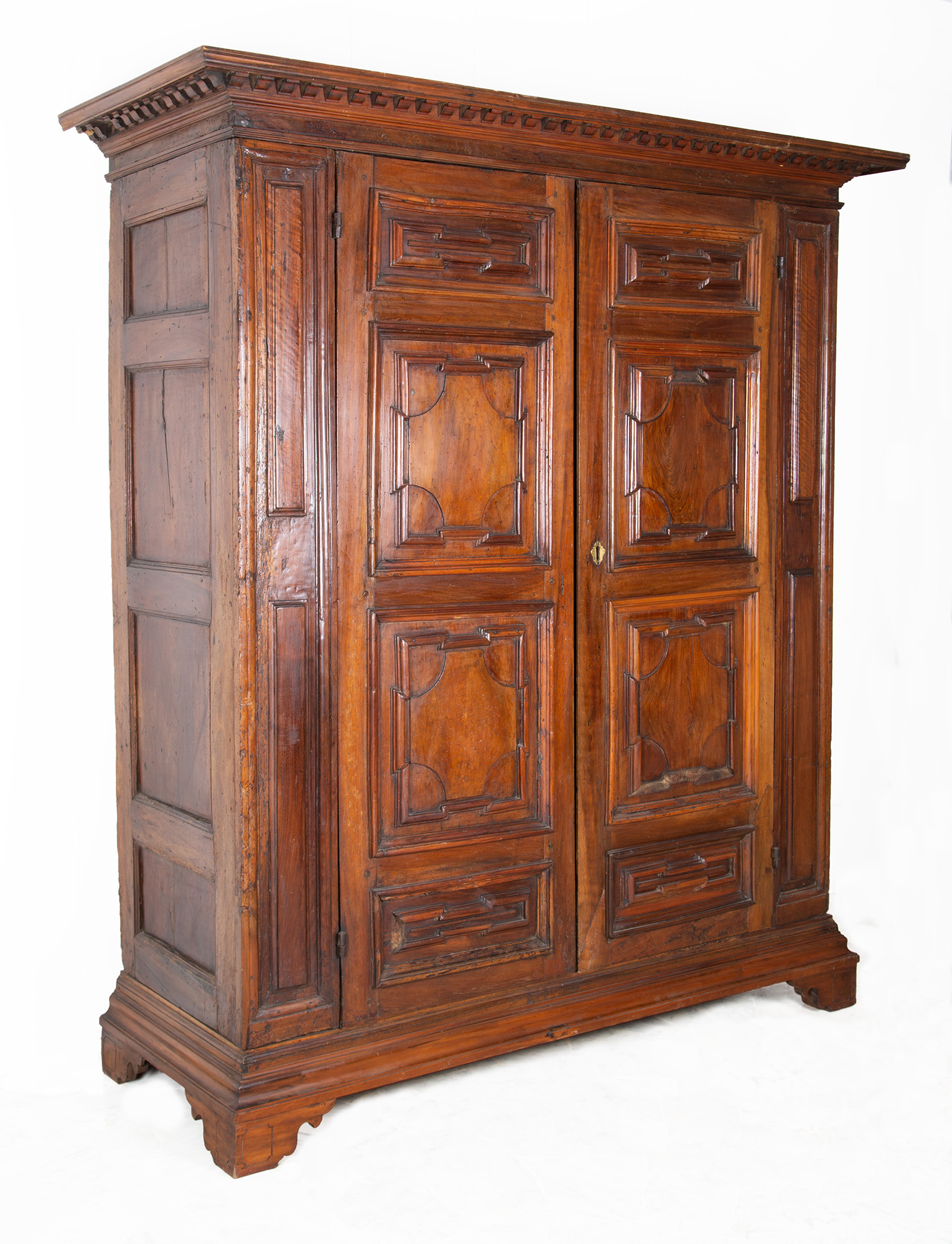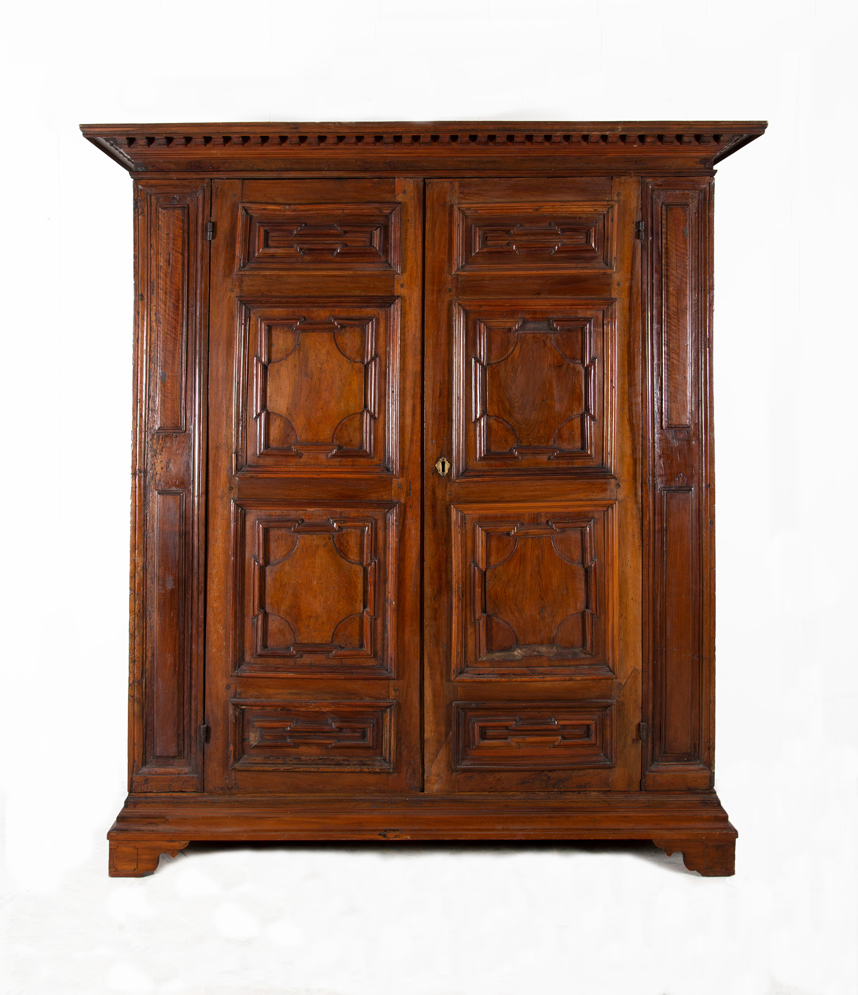 Armadio in noce a due ante pannellate. Italia settentrionale. Fine XVII secolo. Lievi difetti e restauri. Mis. Lung. cm. 196 Alt. cm. 221 Prof. cm. 76 ca.