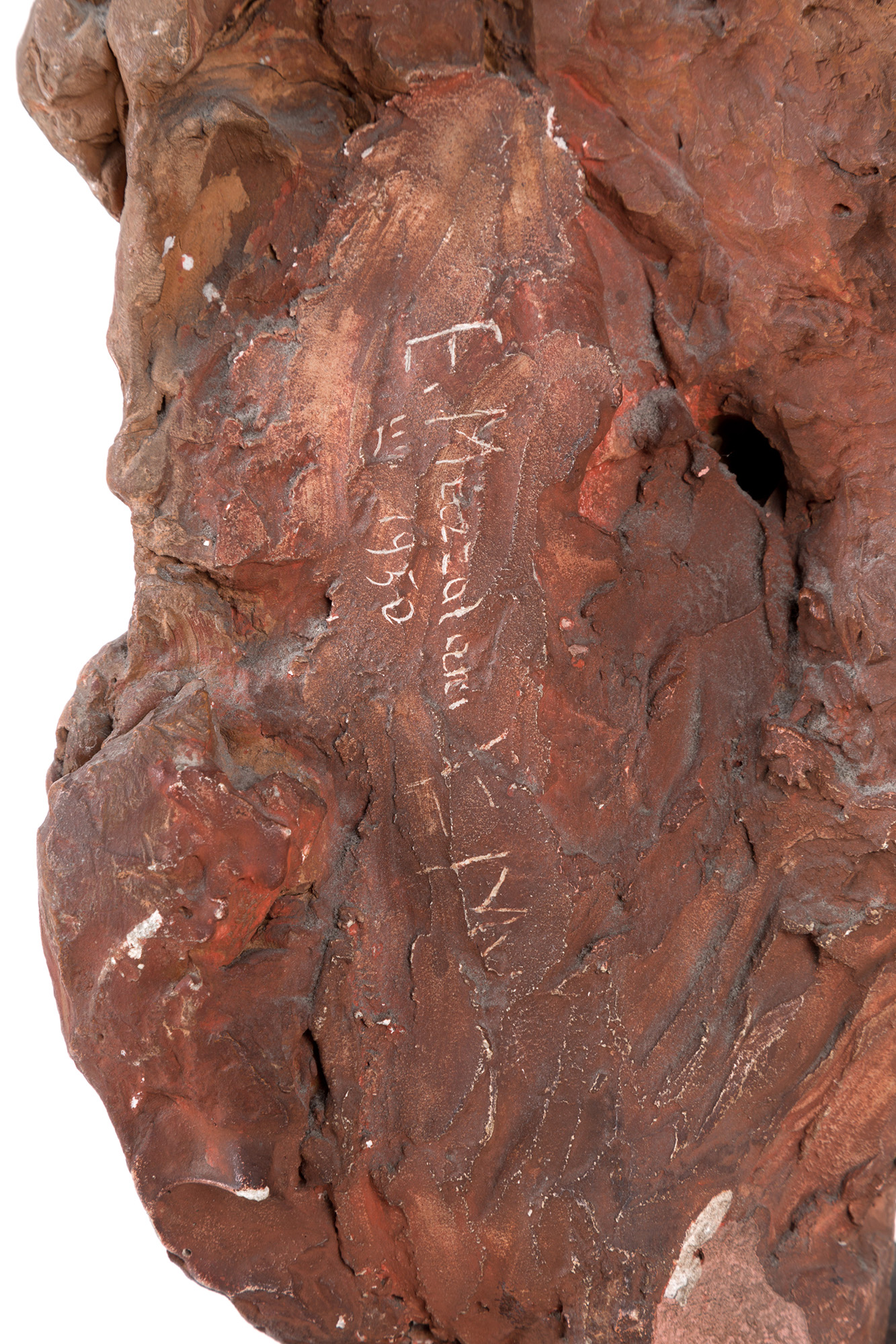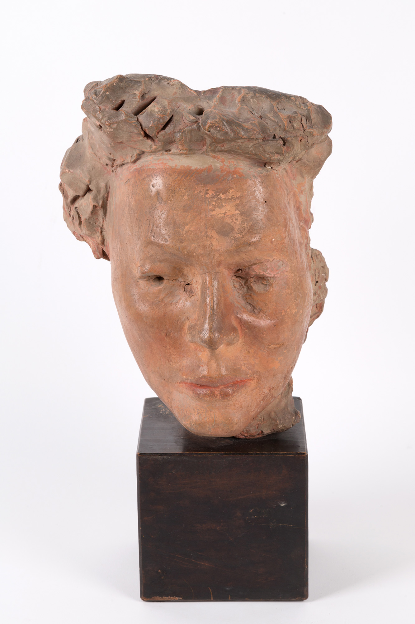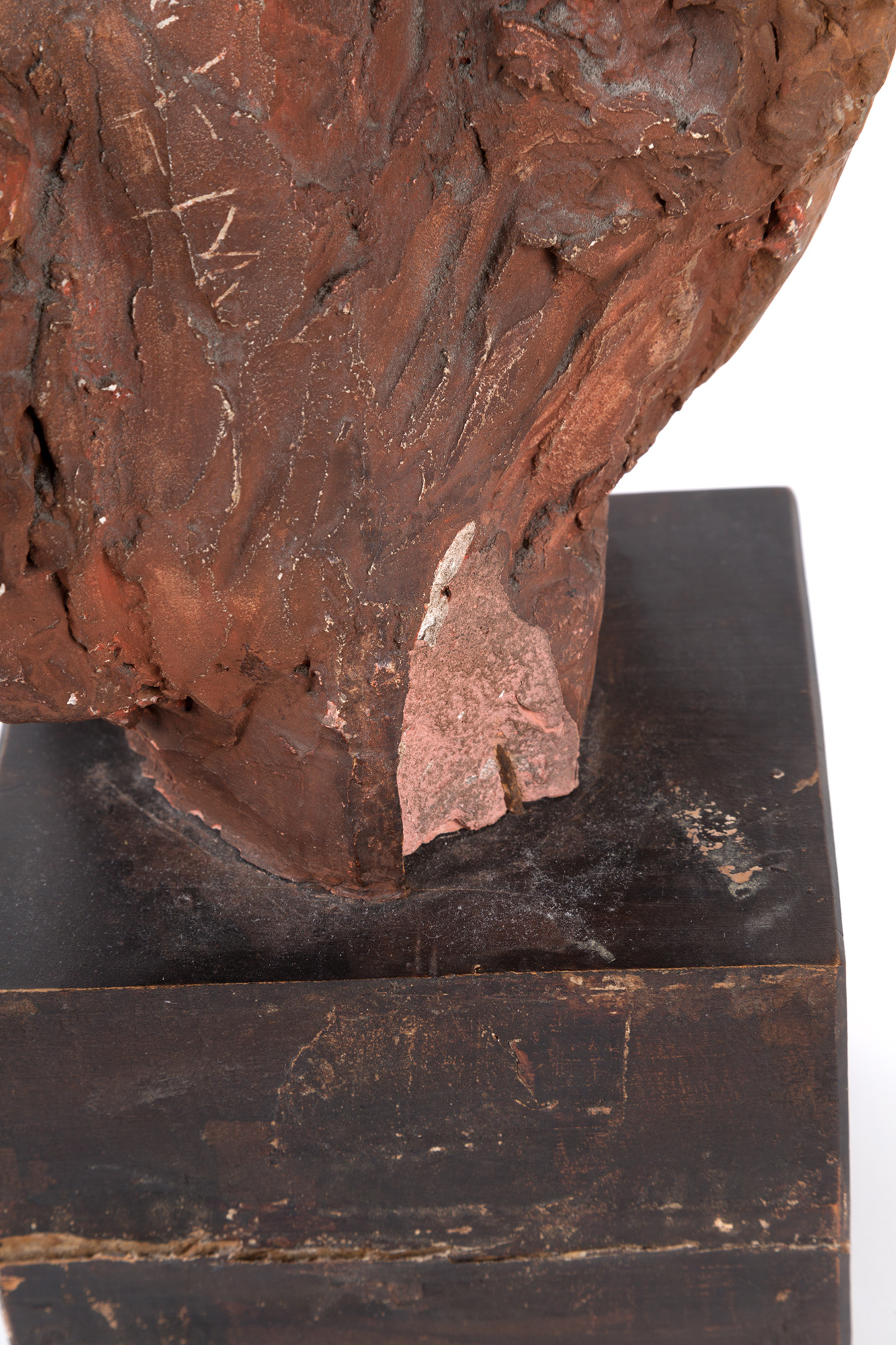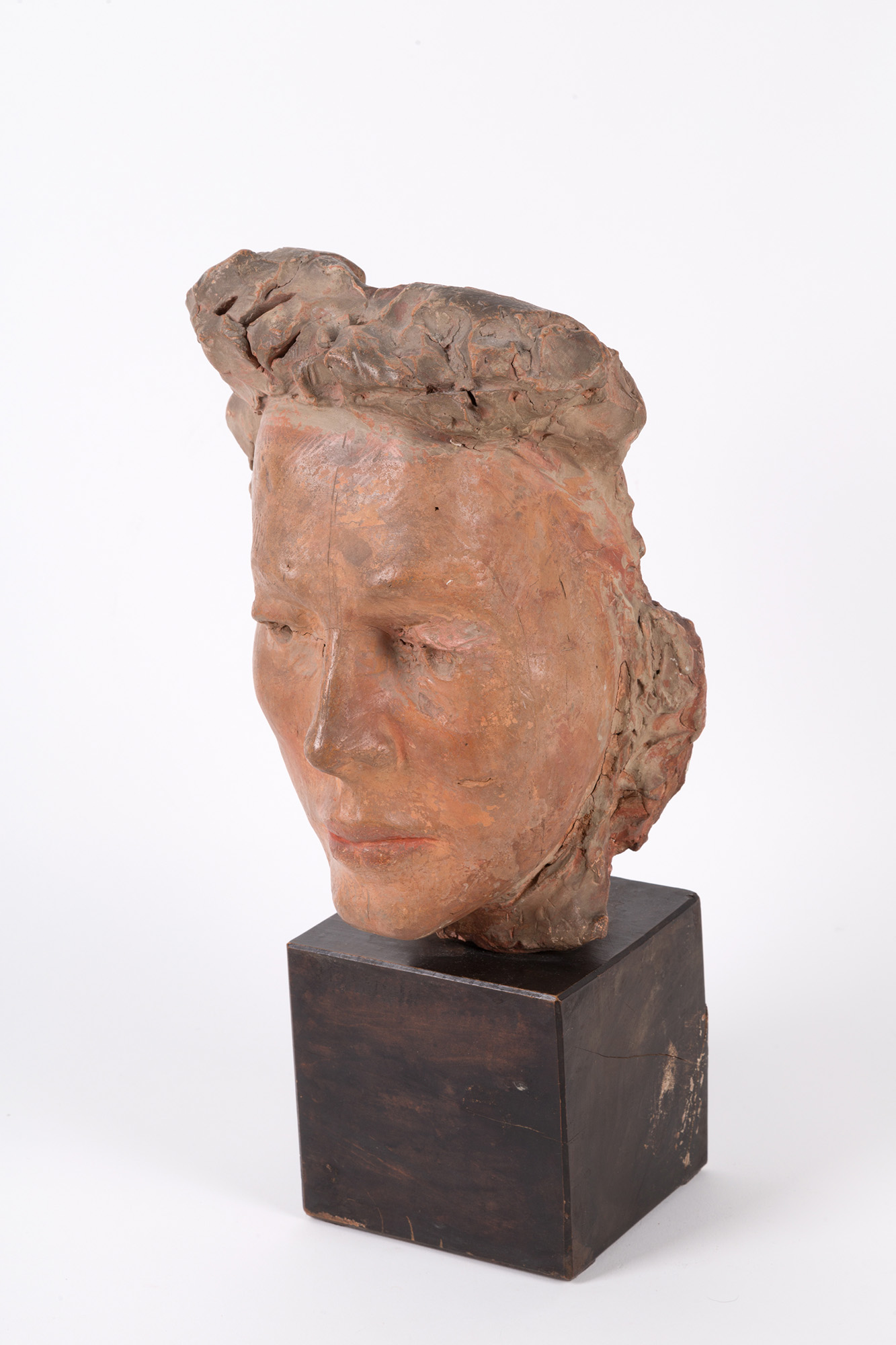 ENRICO MAZZOLANI (Senigallia, 1876 - Milano, 1968). Scultura raff. ''TESTA'' in terracotta su base di legno dipinta. Firmata E. MAZZOLANI sul retro. 1950. Difetto. Mis. Lung. cm. 20 Alt. cm. 39 Prof. cm. 17 ca.