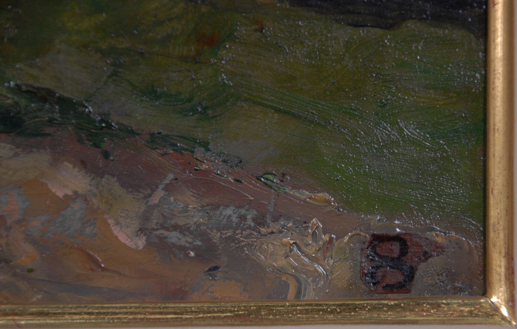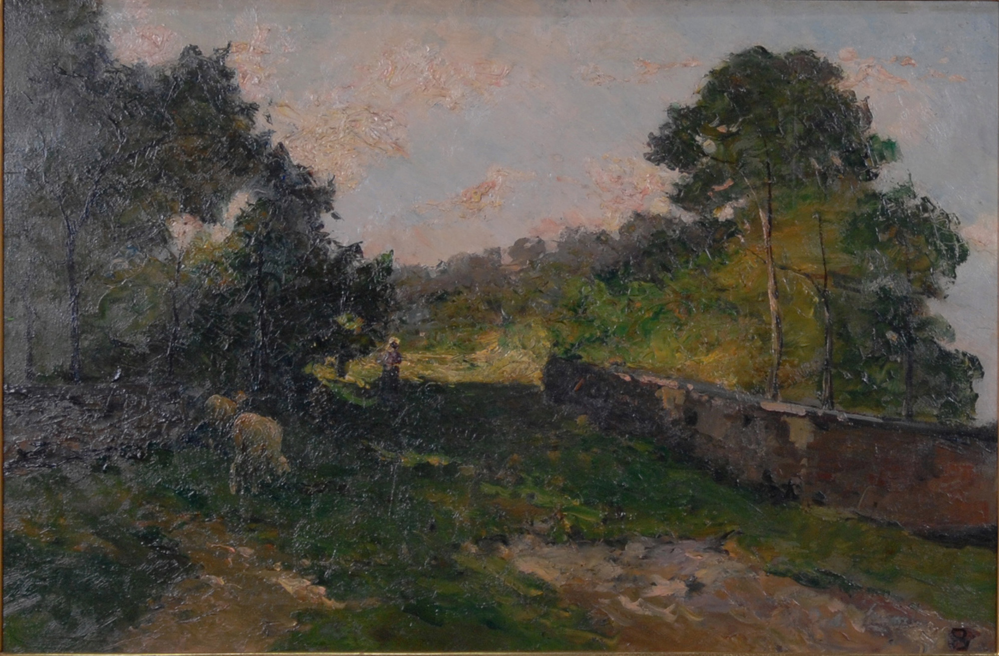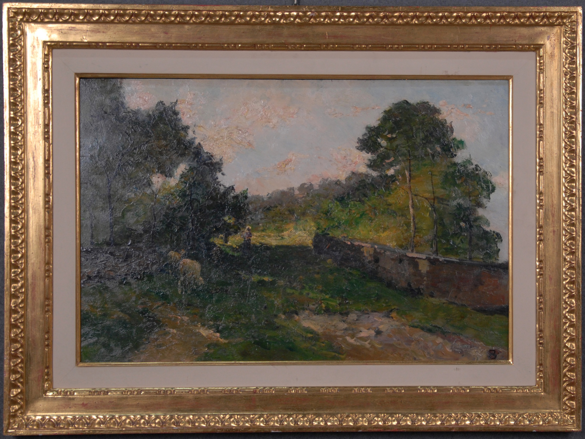 GIUSEPPE GHEDUZZI (Attr.) (Crespellano, 1889 - Torino, 1957). Dipinto olio su tavoletta raff. ''PAESAGGIO CAMPESTRE CON PASTORELLI E PECORE''. Marcato 8 in basso a destra. In cornice. Mis. Lung. cm. 60 Alt. cm. 40 ca.