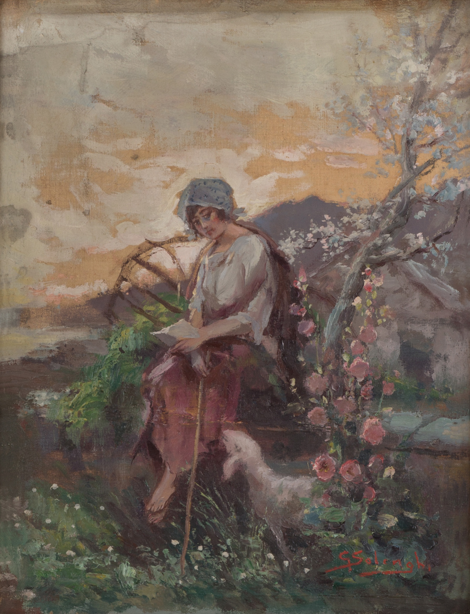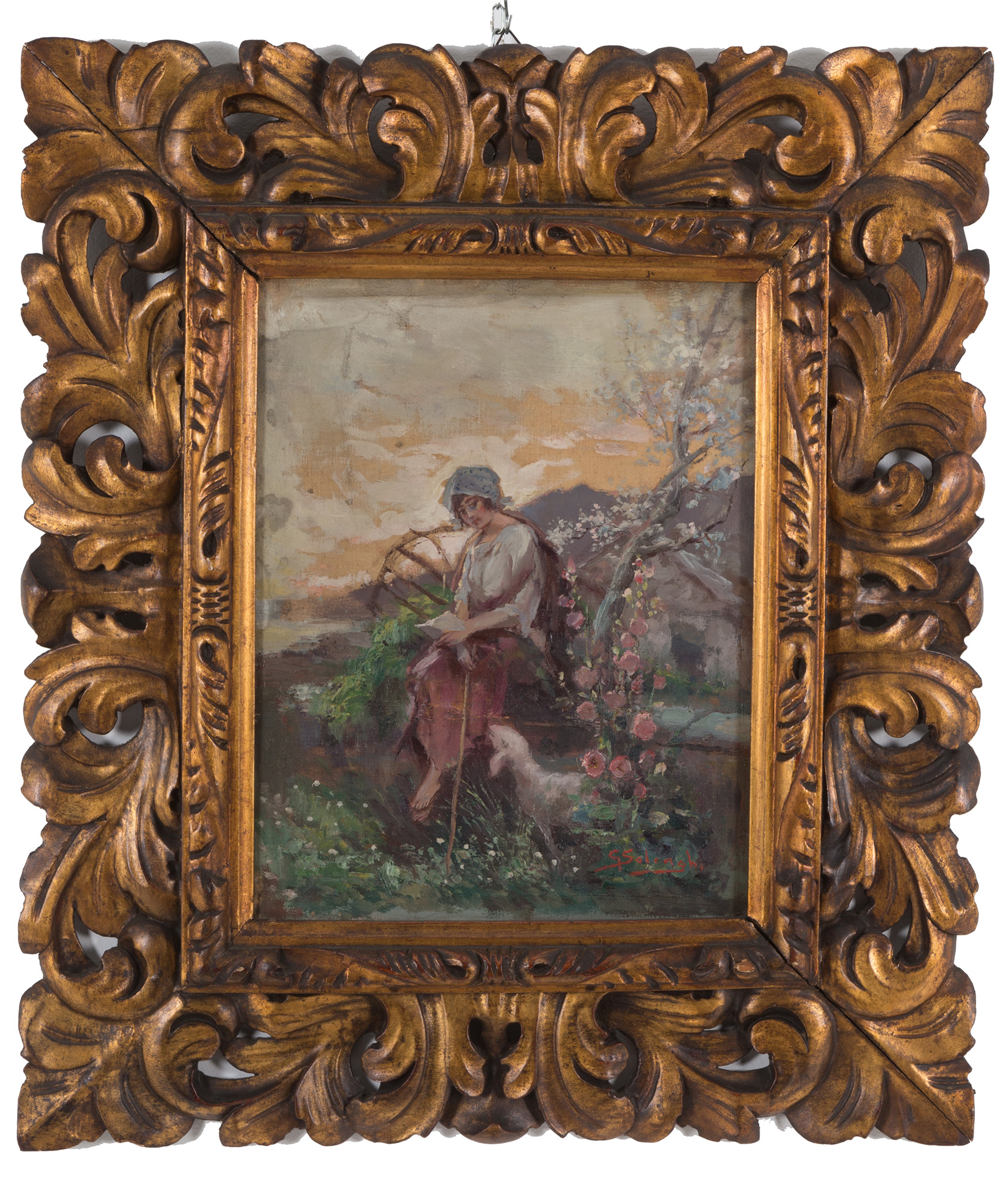 GIUSEPPE SOLENGHI (Milano, 1879 - Cernobbio, 1944). Dipinto olio su tela raff. ''FANCIULLA CON PECORELLA''. Firmato in basso a destra. In cornice intagliata e dorata. Mis. Lung. cm. 33 Alt. cm. 42 ca.