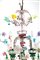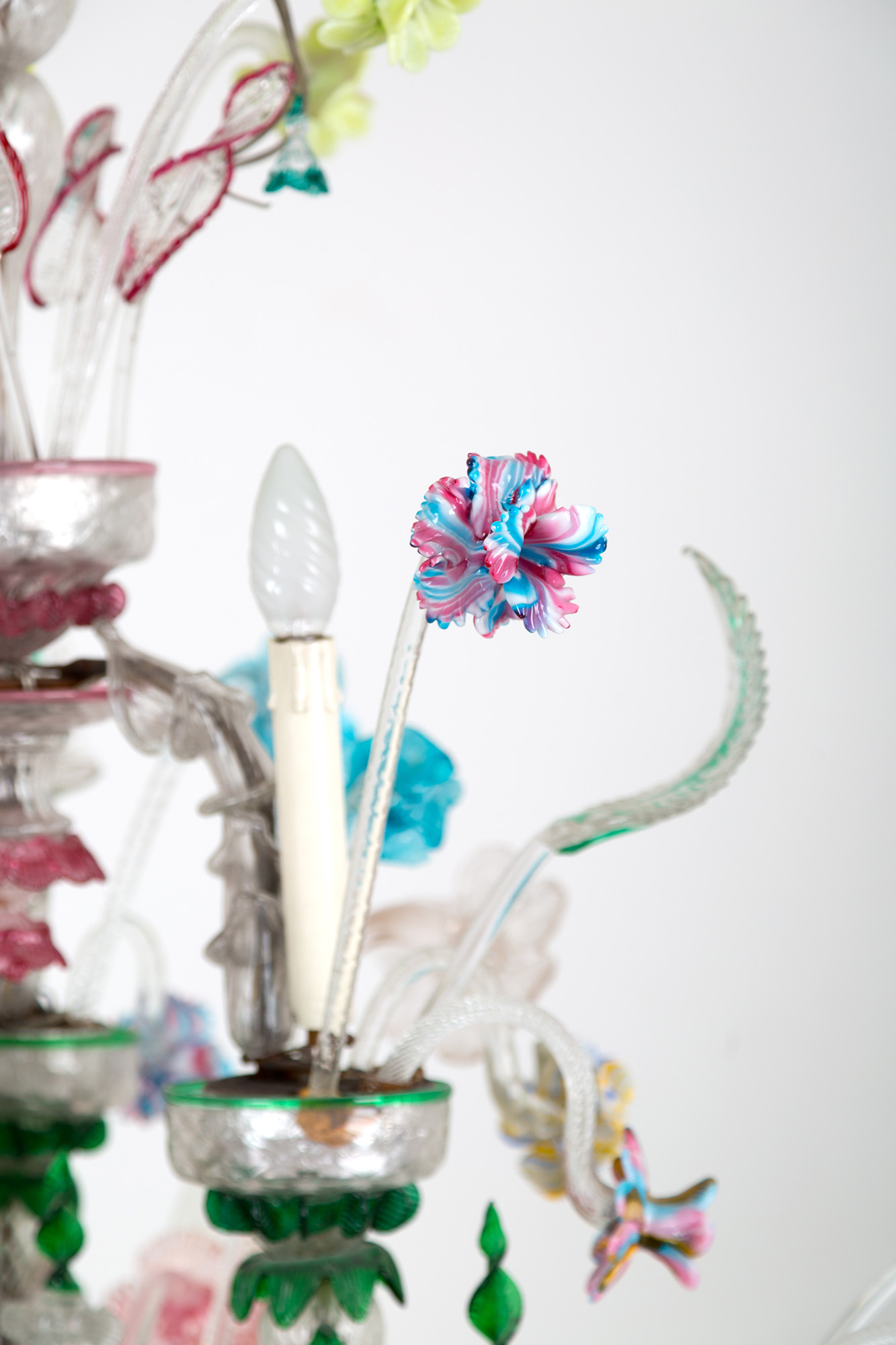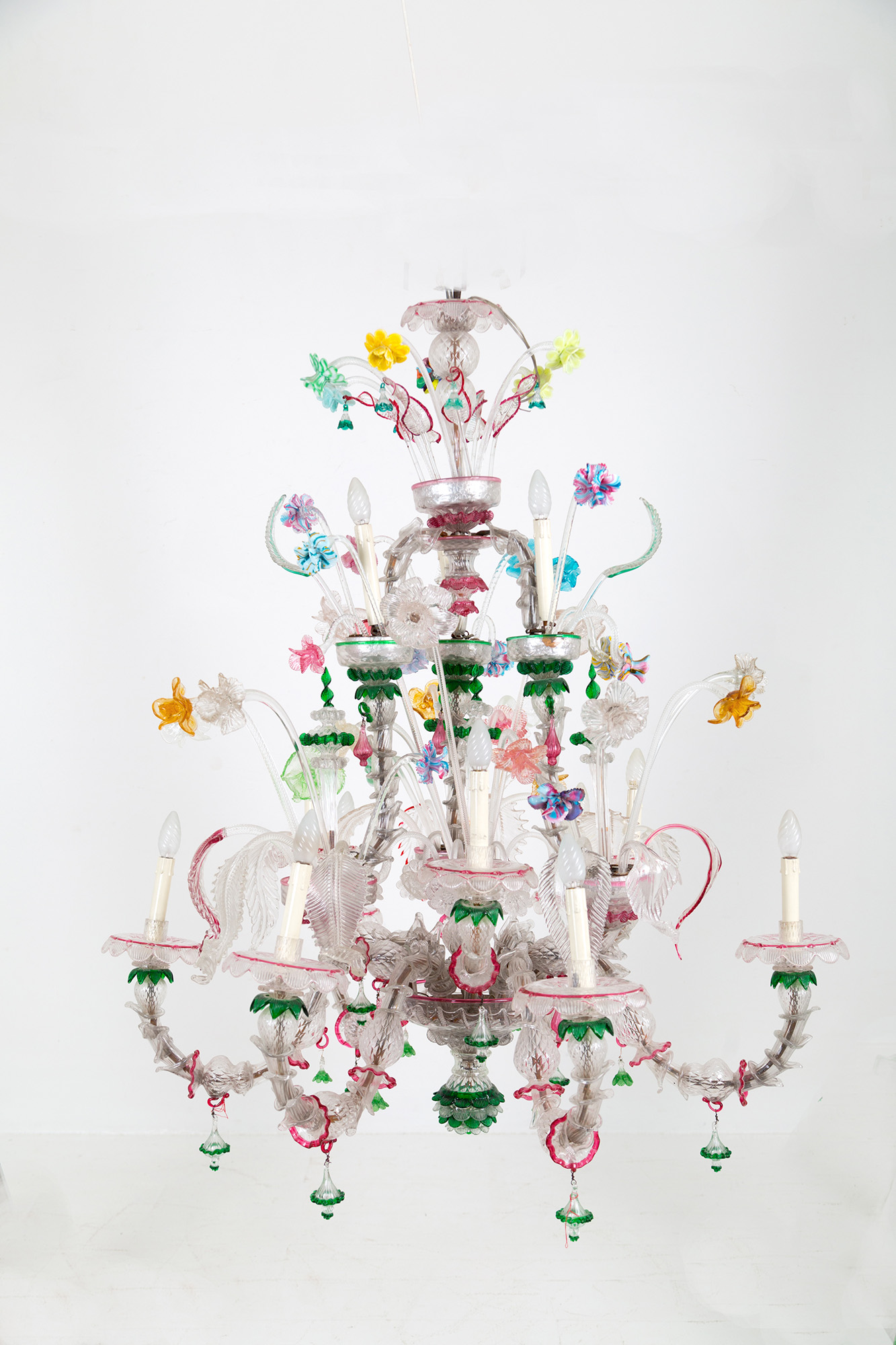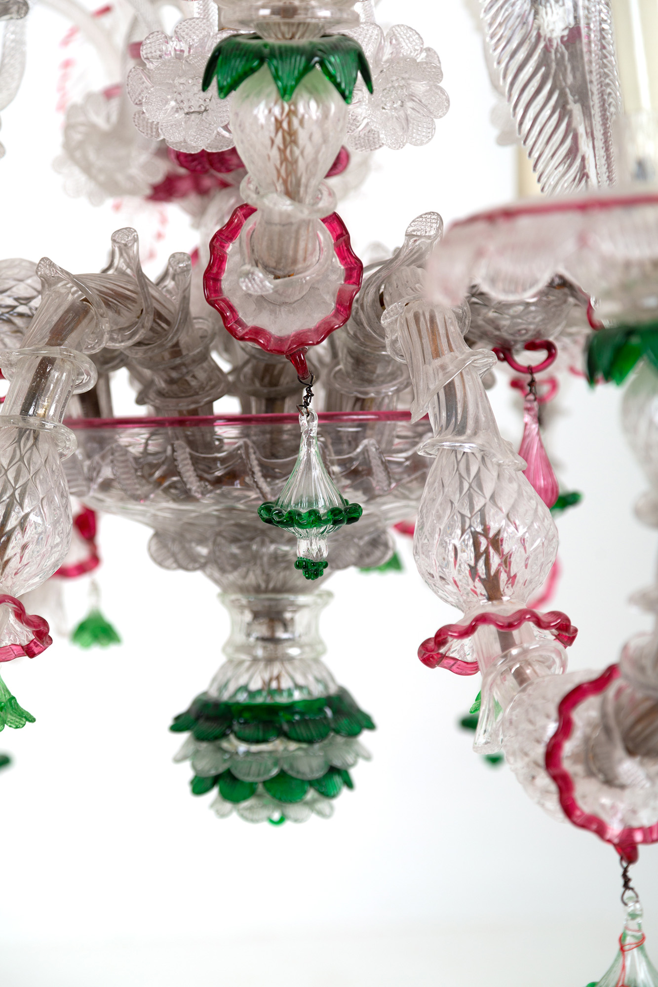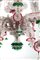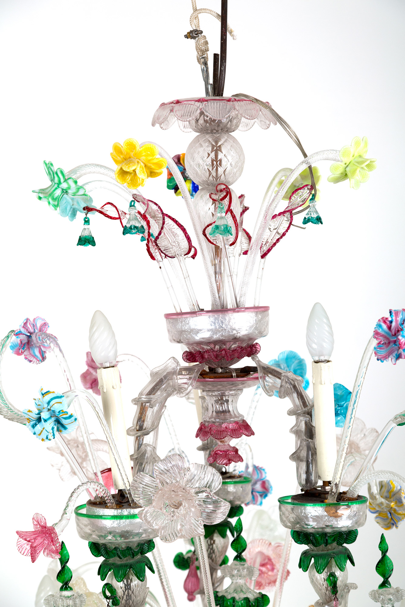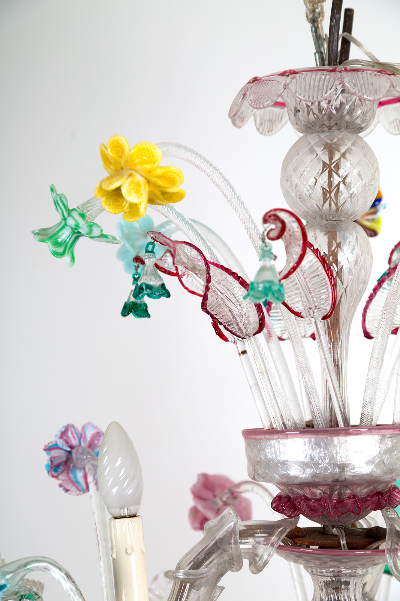 Lampadario sei bracci e nove luci in vetro soffiato di Murano. XX secolo. Lievi difetti. Mis. Alt. cm. 140 Diam. cm. 120 ca.