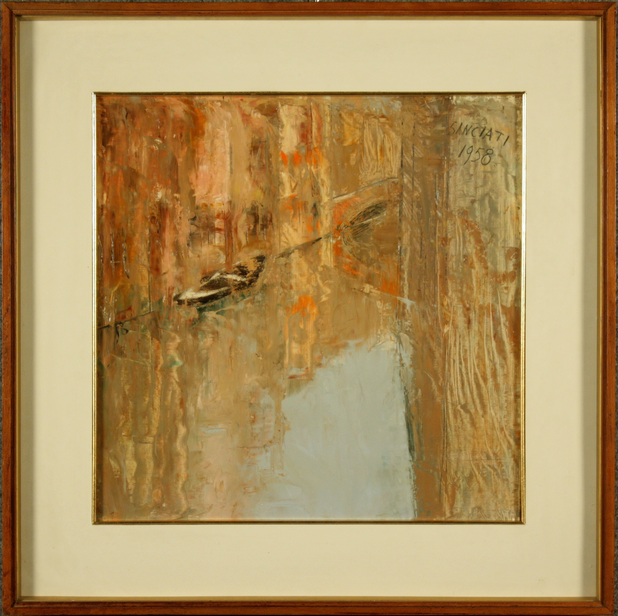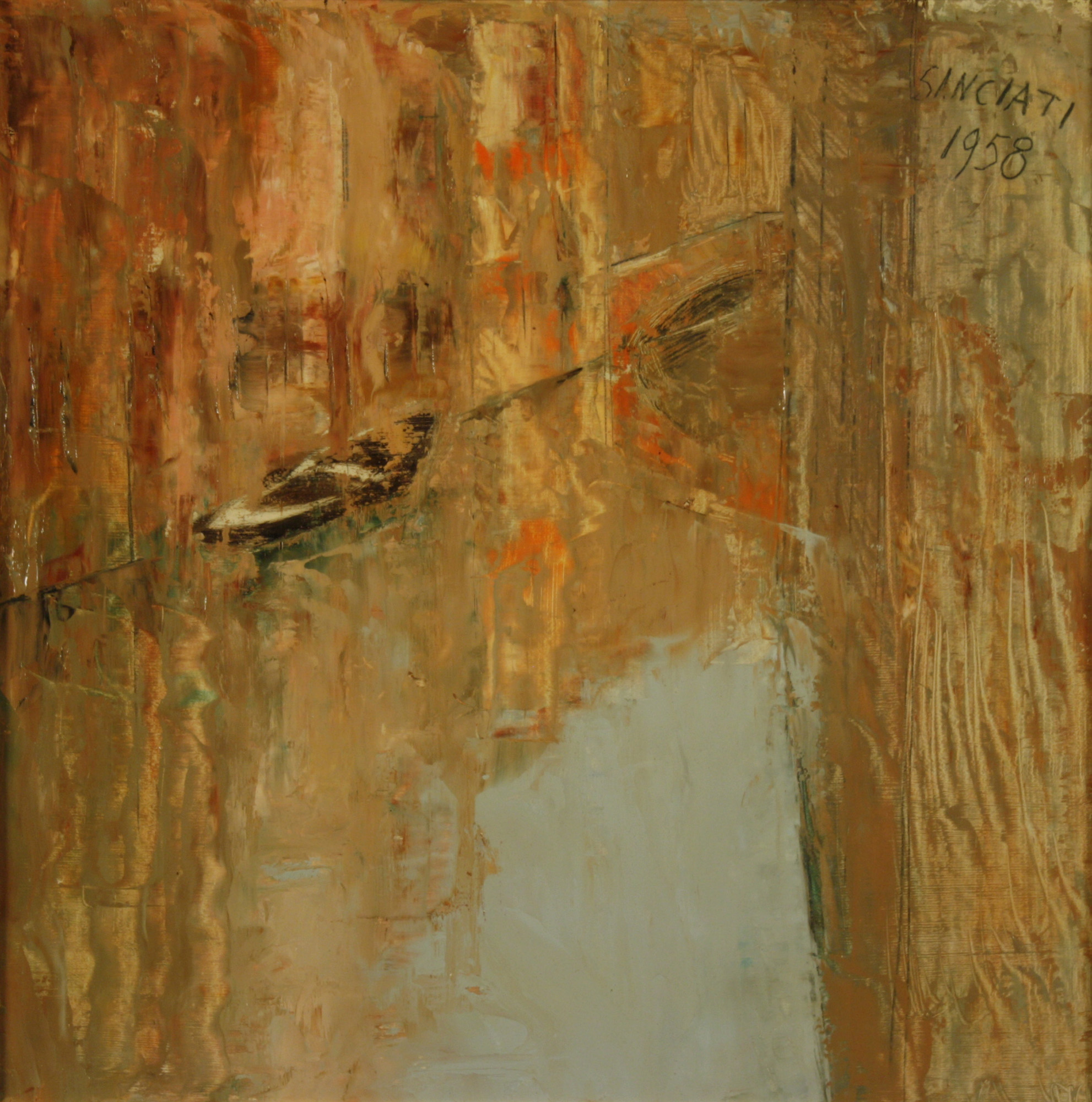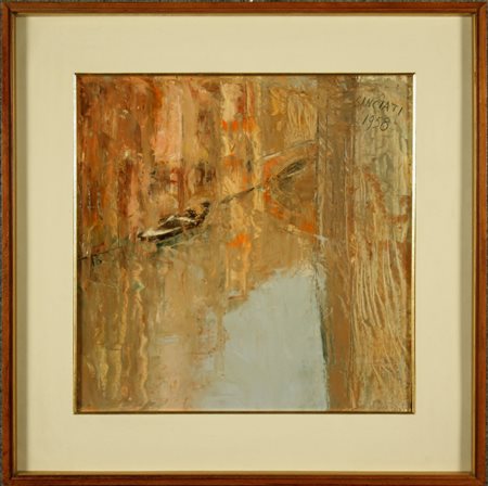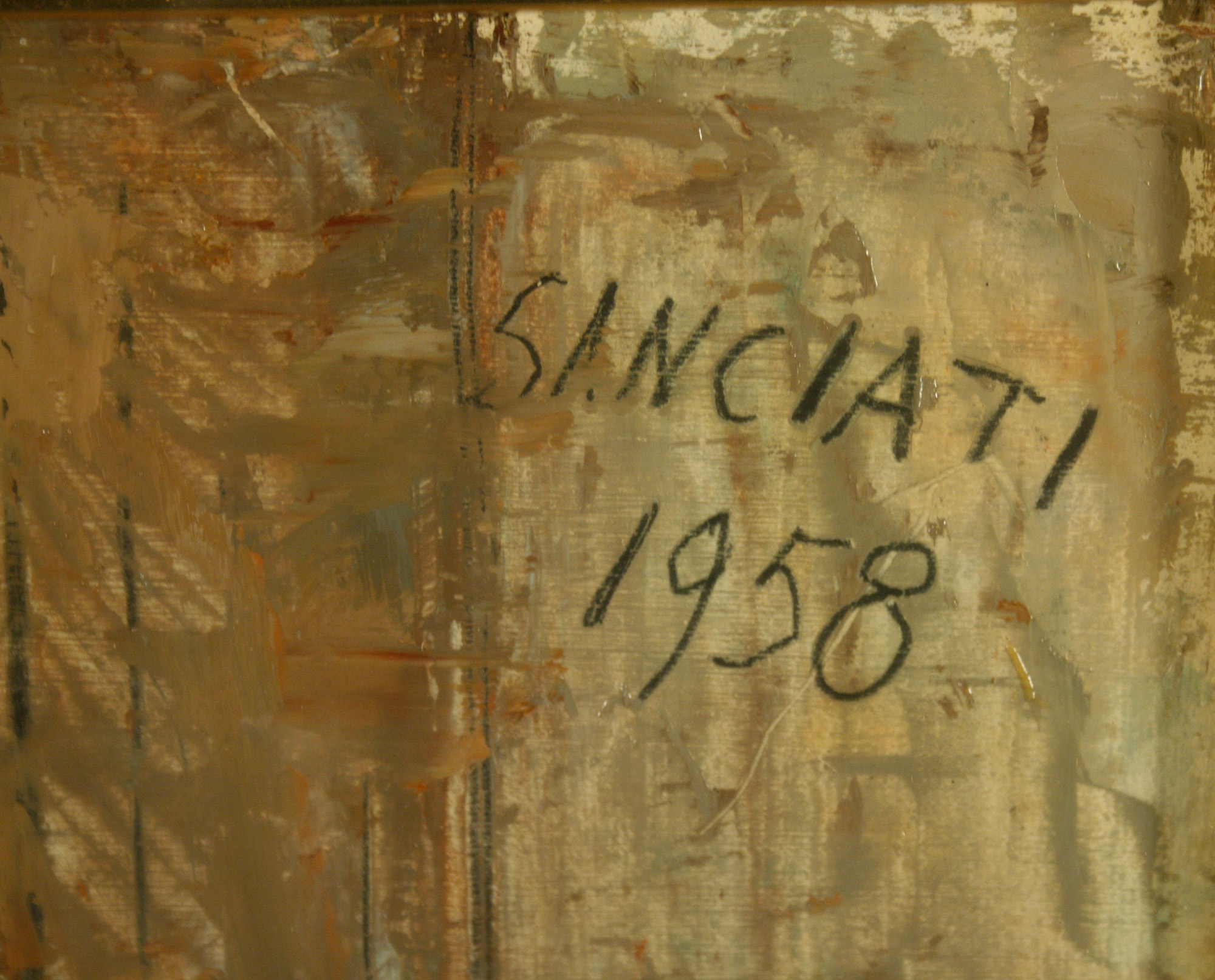 NAPOLEONE SANCIATI (Este, 1897 - ?). Dipinto olio su faesite raff. ''PAESAGGIO''. Firmato e datato 1958 in alto a destra. In cornice. Mis. Lung. cm. 43 Alt. cm. 42 ca.