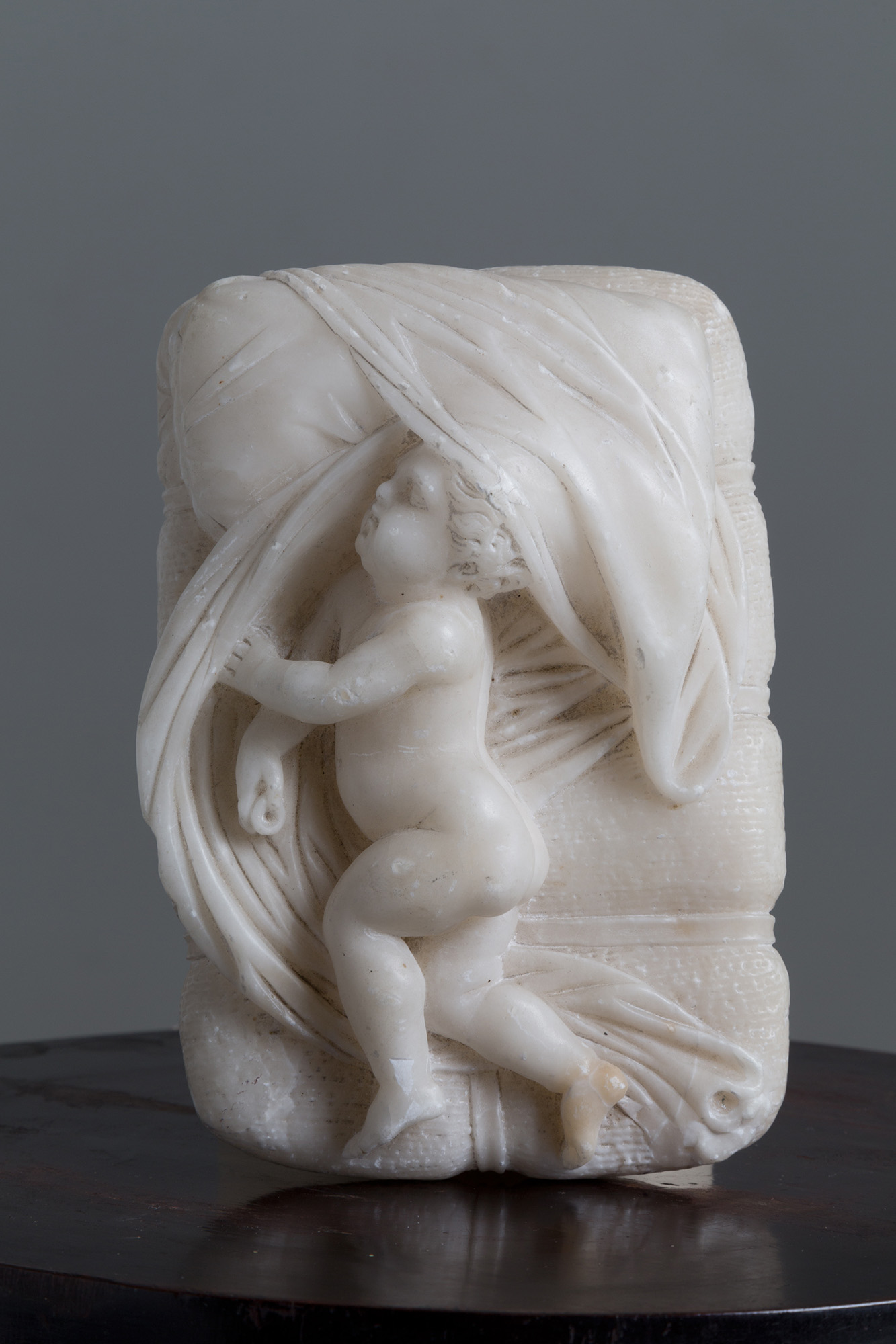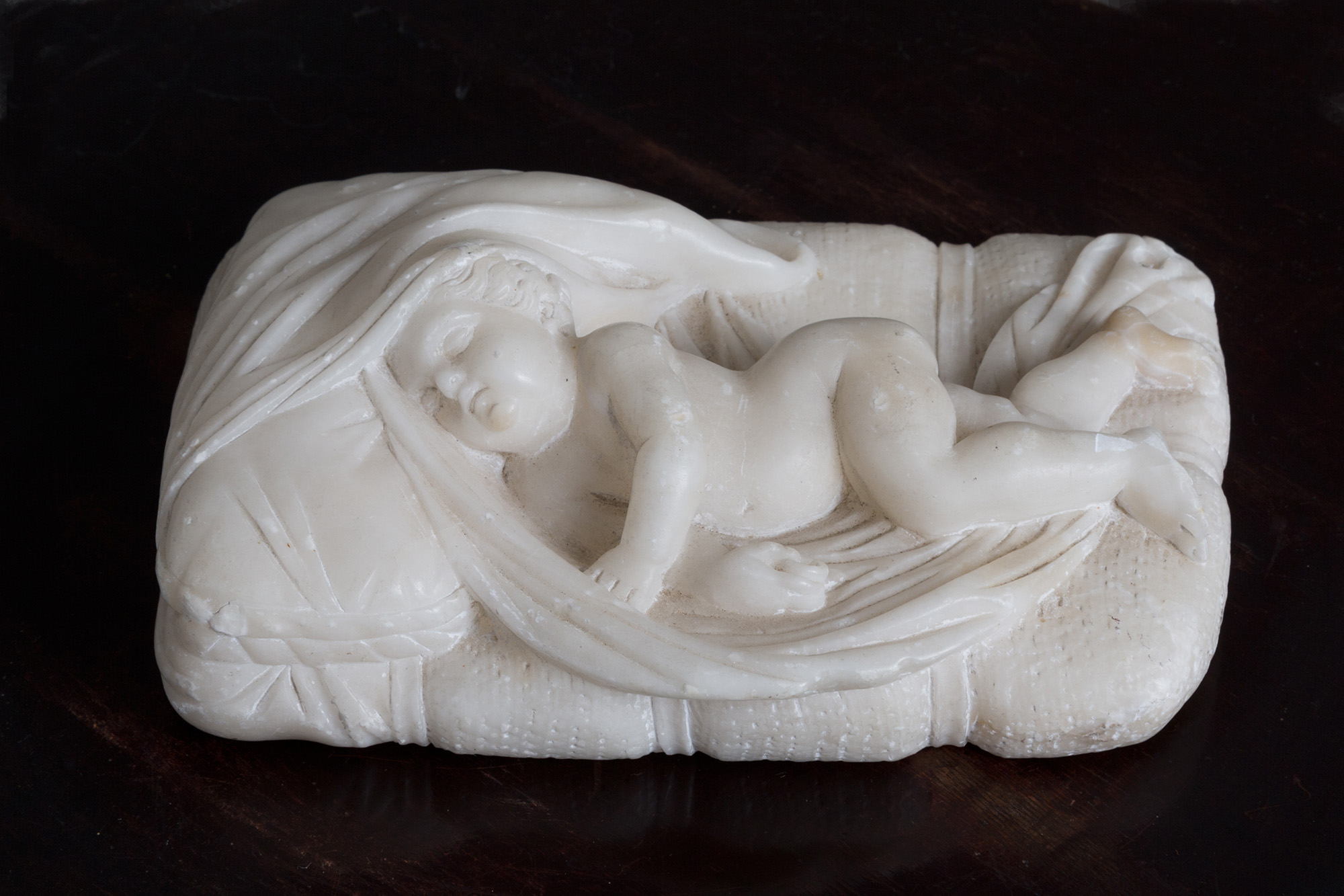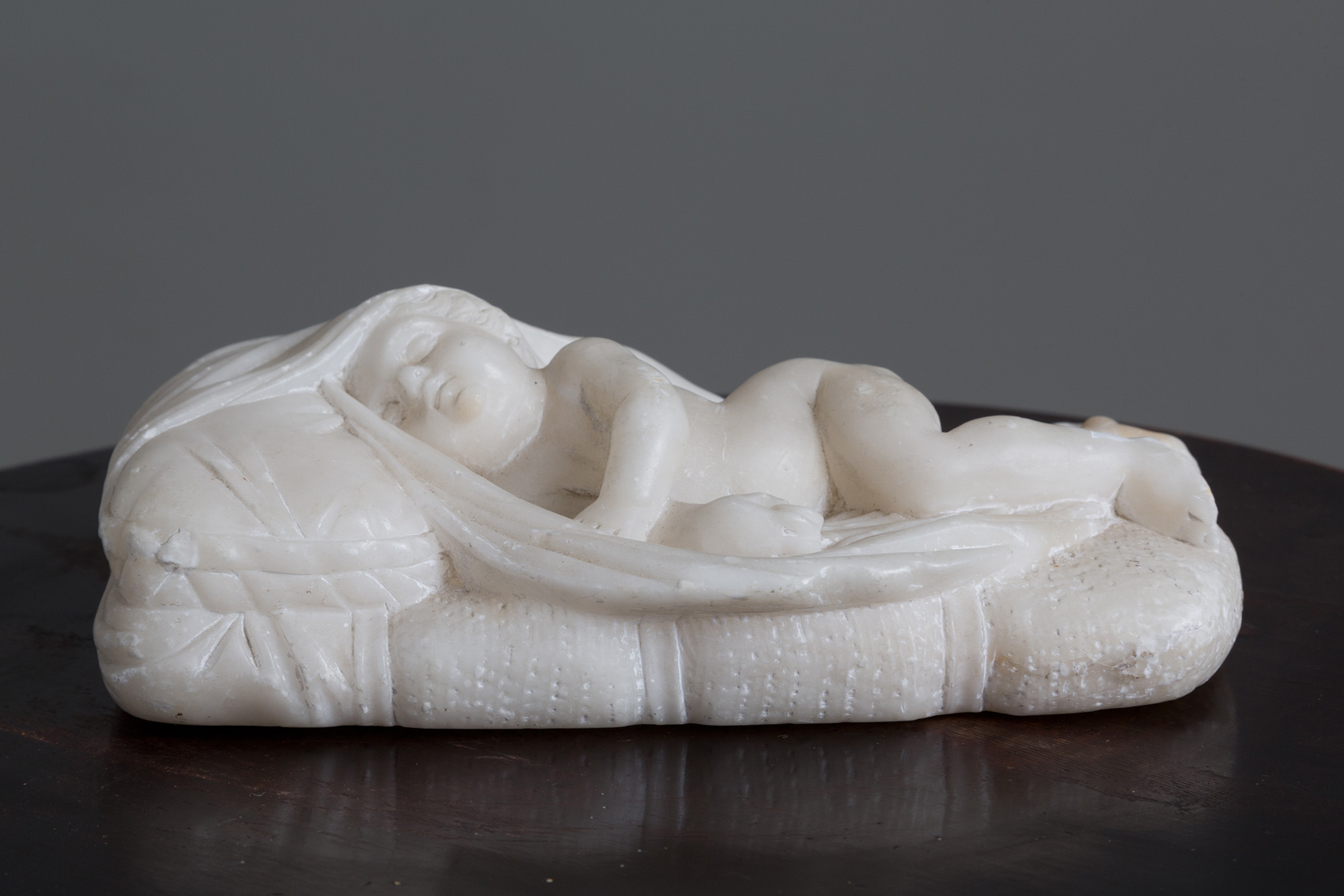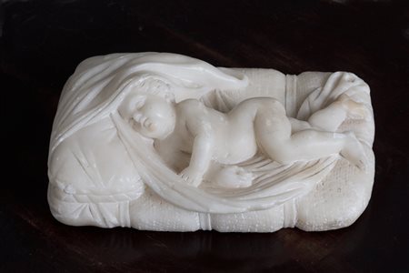 Scultura in alabastro raff. ''PUTTO DORMIENTE''. Inizi XX secolo. Mis. Lung. cm. 17 Prof. cm. 12.5 ca.