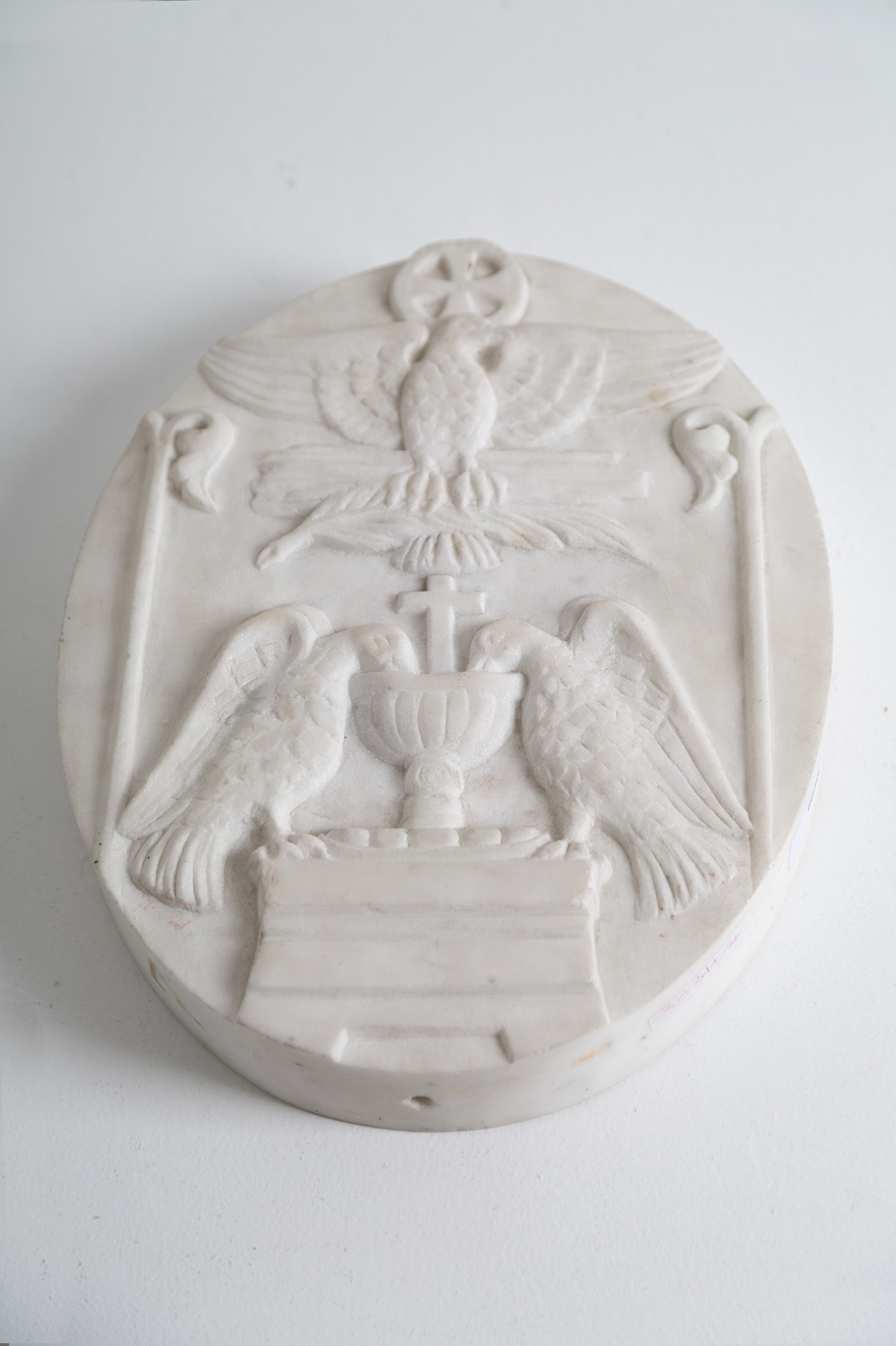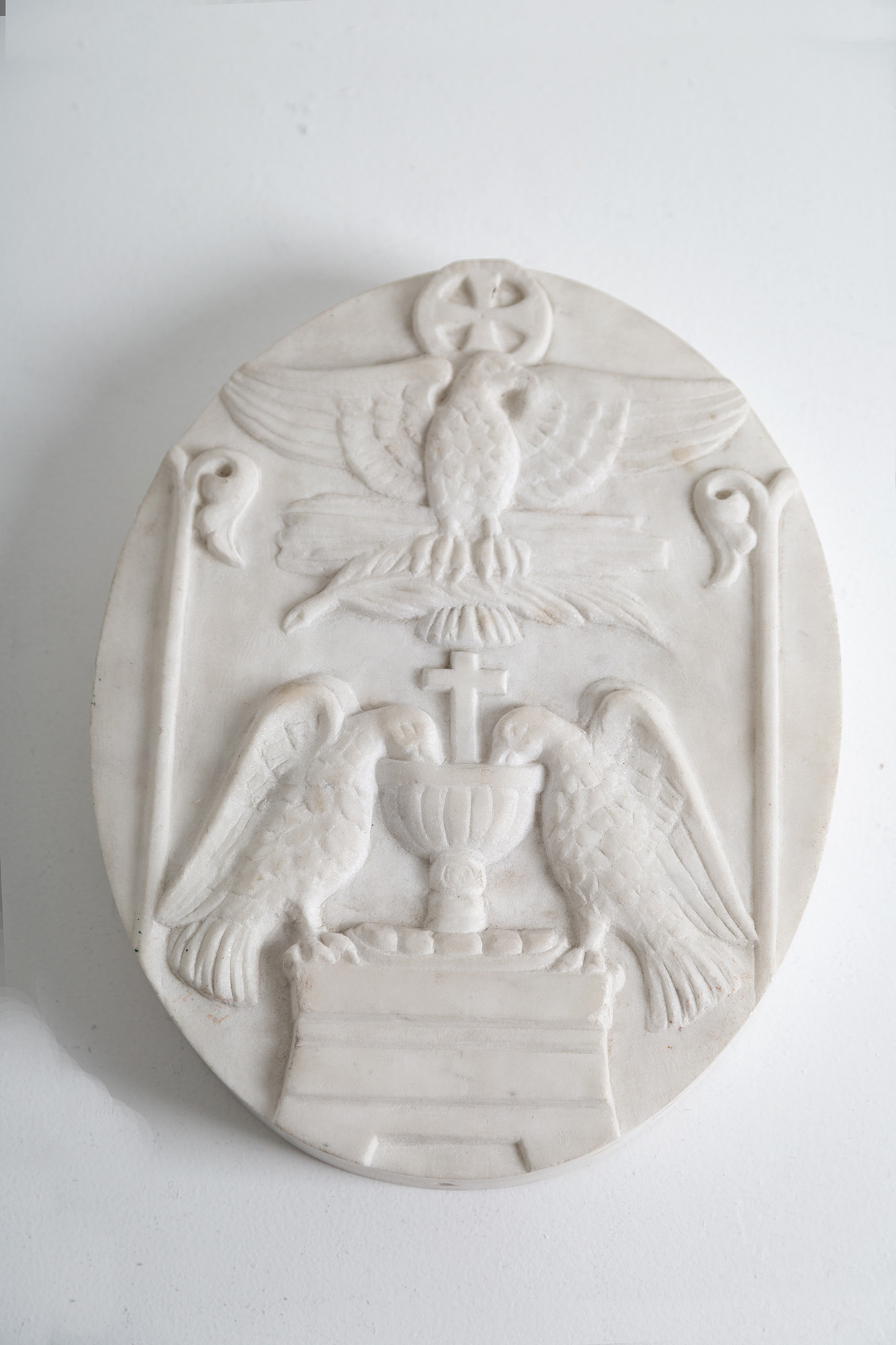 Medaglione in marmo bianco di Carrara scolpito raff. ''SPIRITO SANTO''. XVII secolo. Mis. Lung. cm. 23.5 Alt. cm. 27.5 Prof. cm. 5 ca.