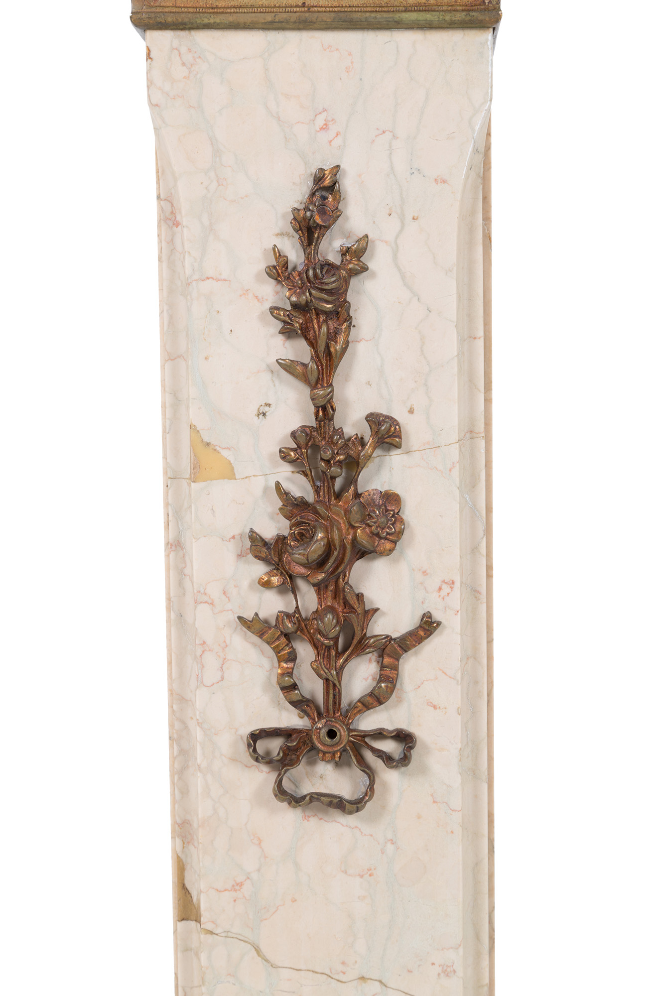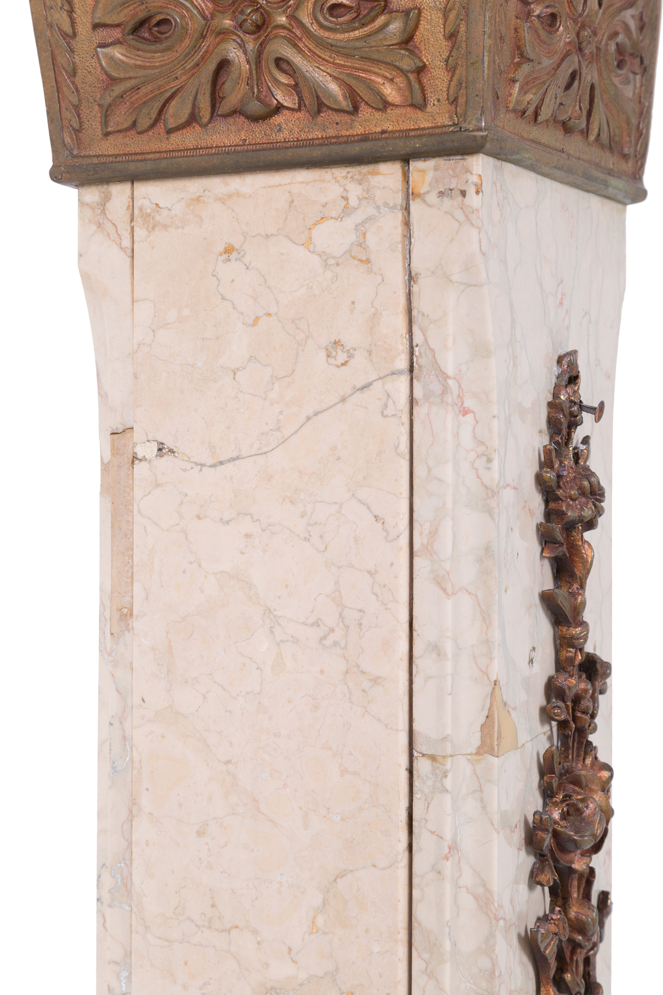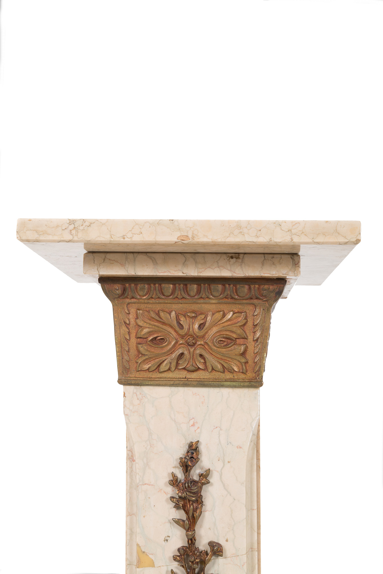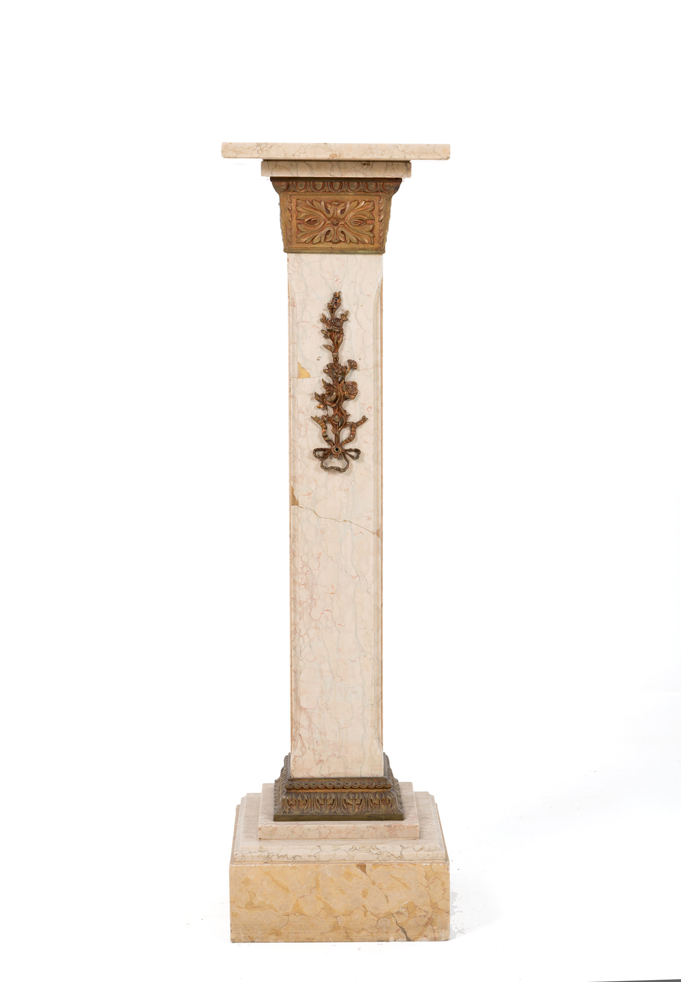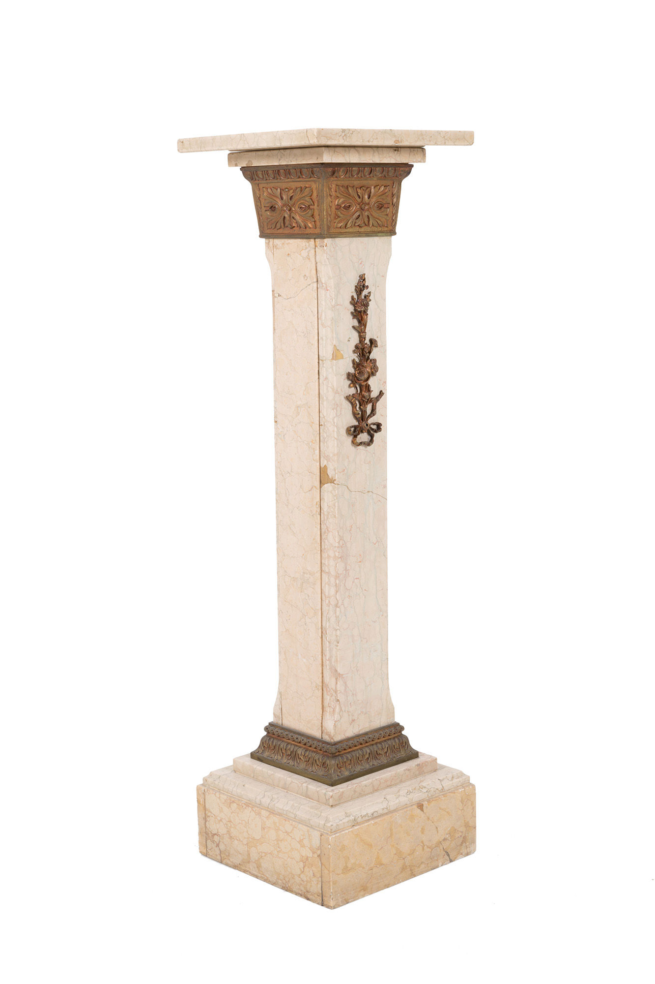 Colonna in marmo beige venato con decori in metallo dorato e motivi floreali. XX secolo. Mis. Lung. cm. 30 Alt. cm. 108 Prof. cm. 30 ca.