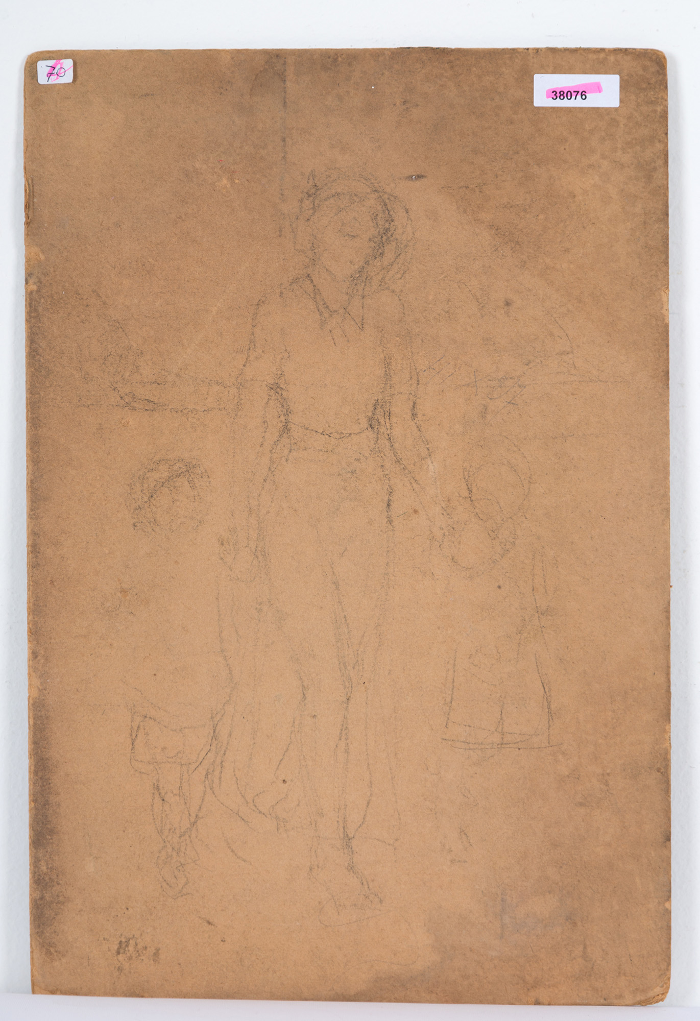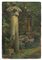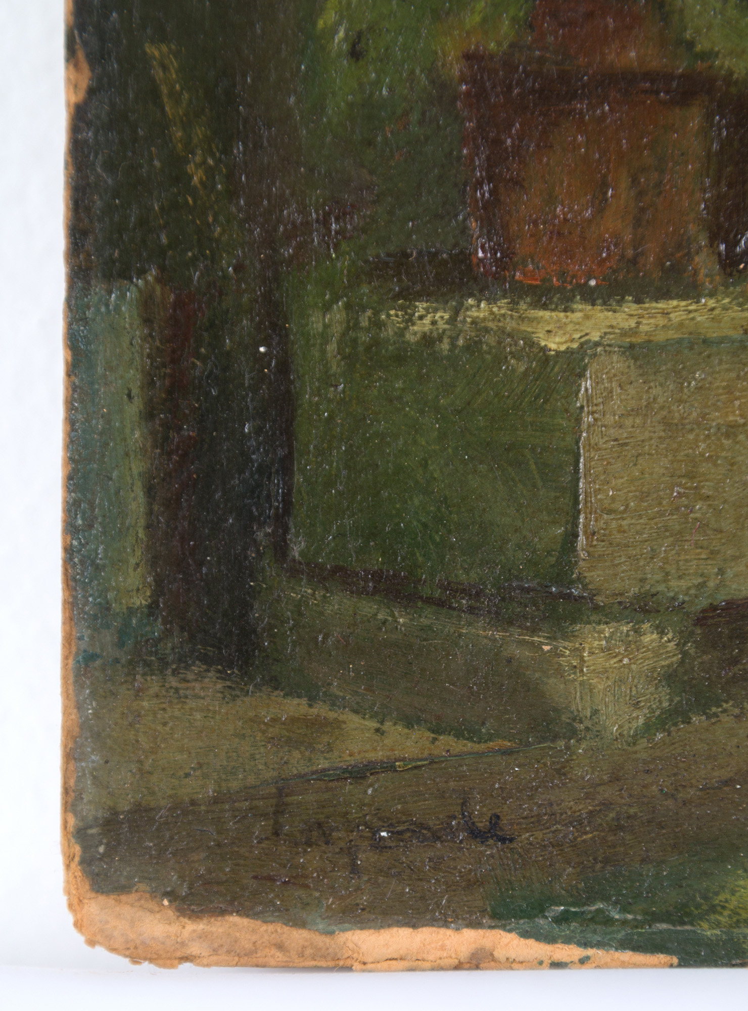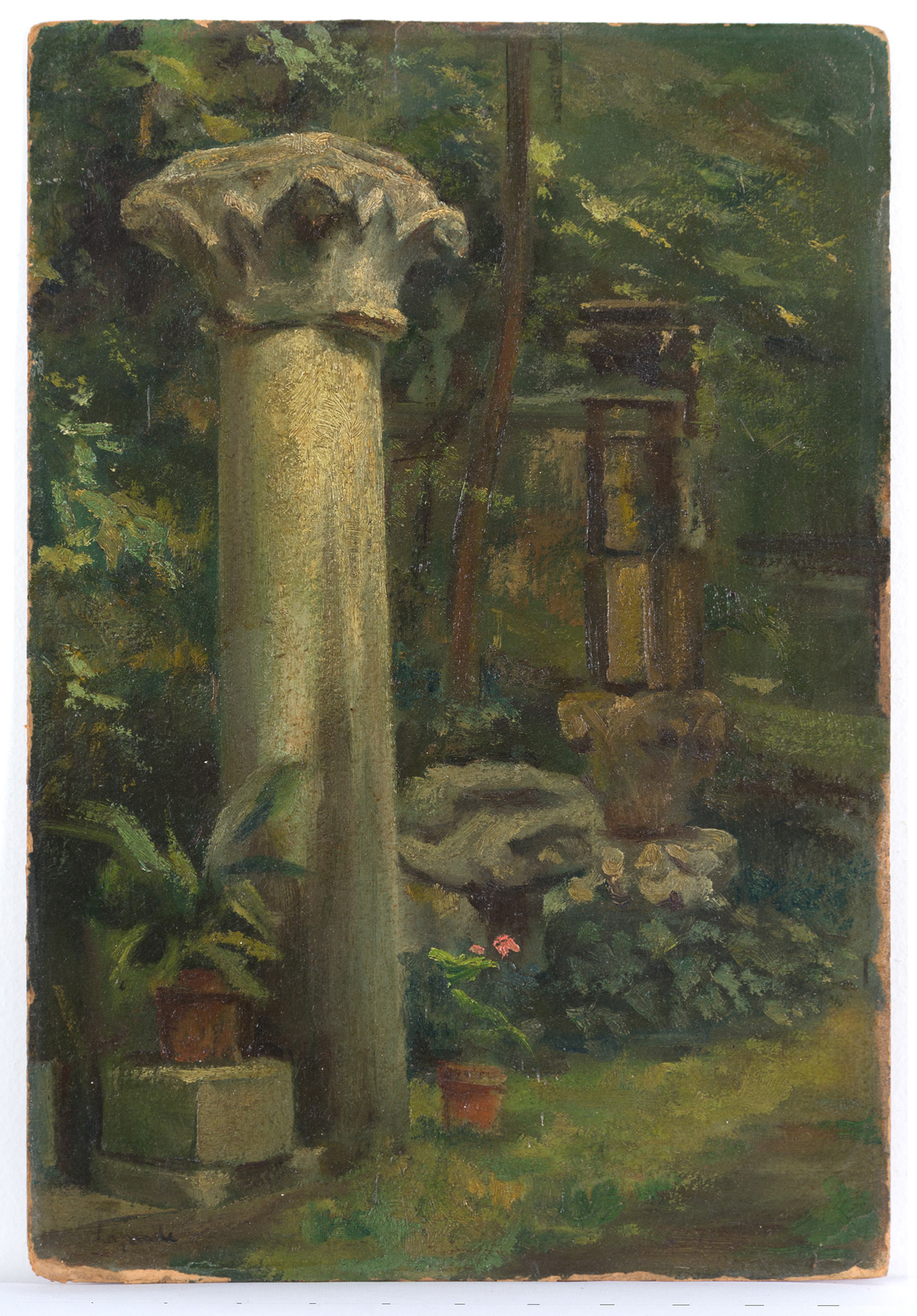 Dipinto olio su cartoncino raff. ''GIARDINO CON COLONNA''. Firma non identificata in basso a sinistra. XX secolo. Mis. Lung. cm. 28 Alt. cm. 41.5 ca.
