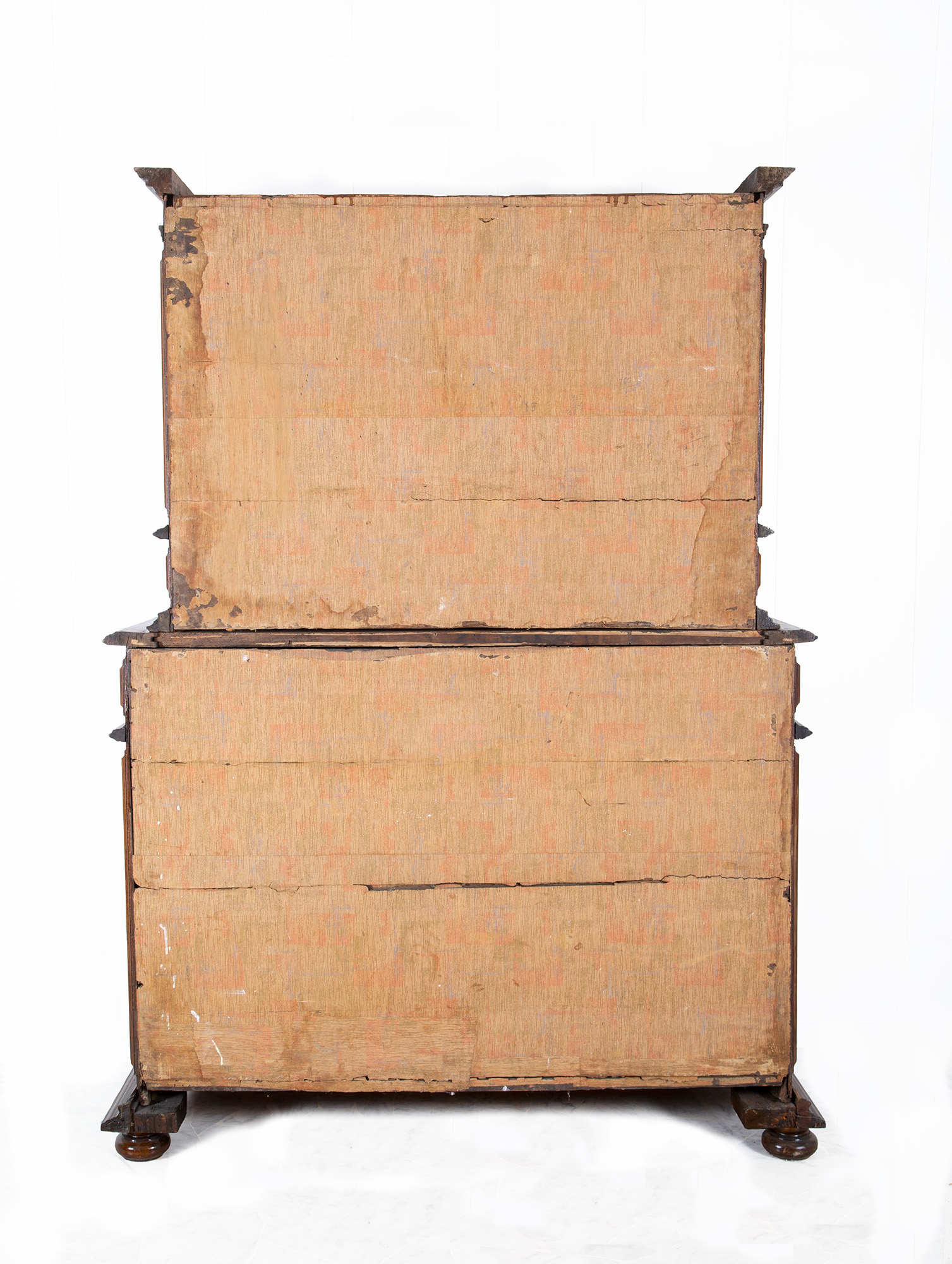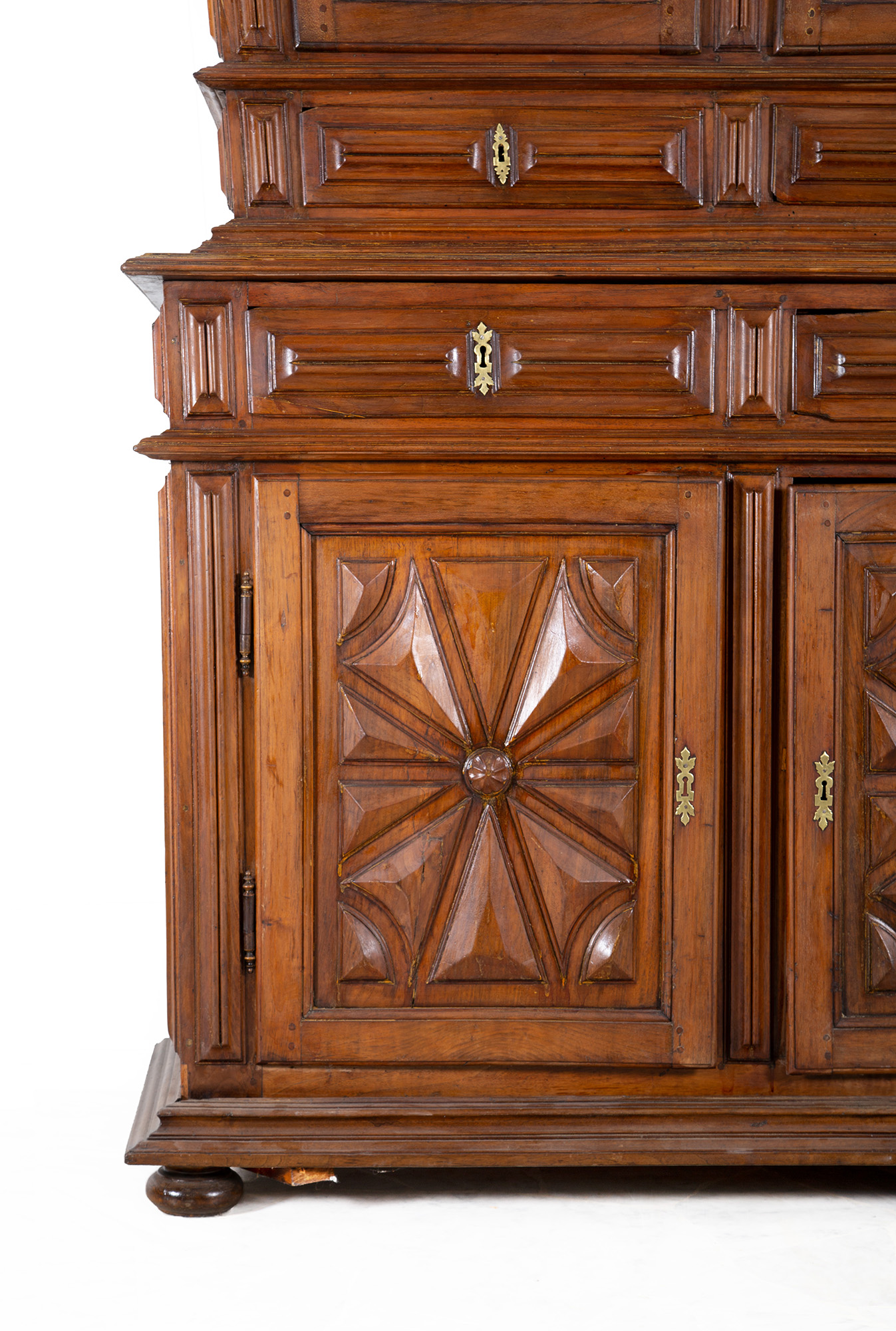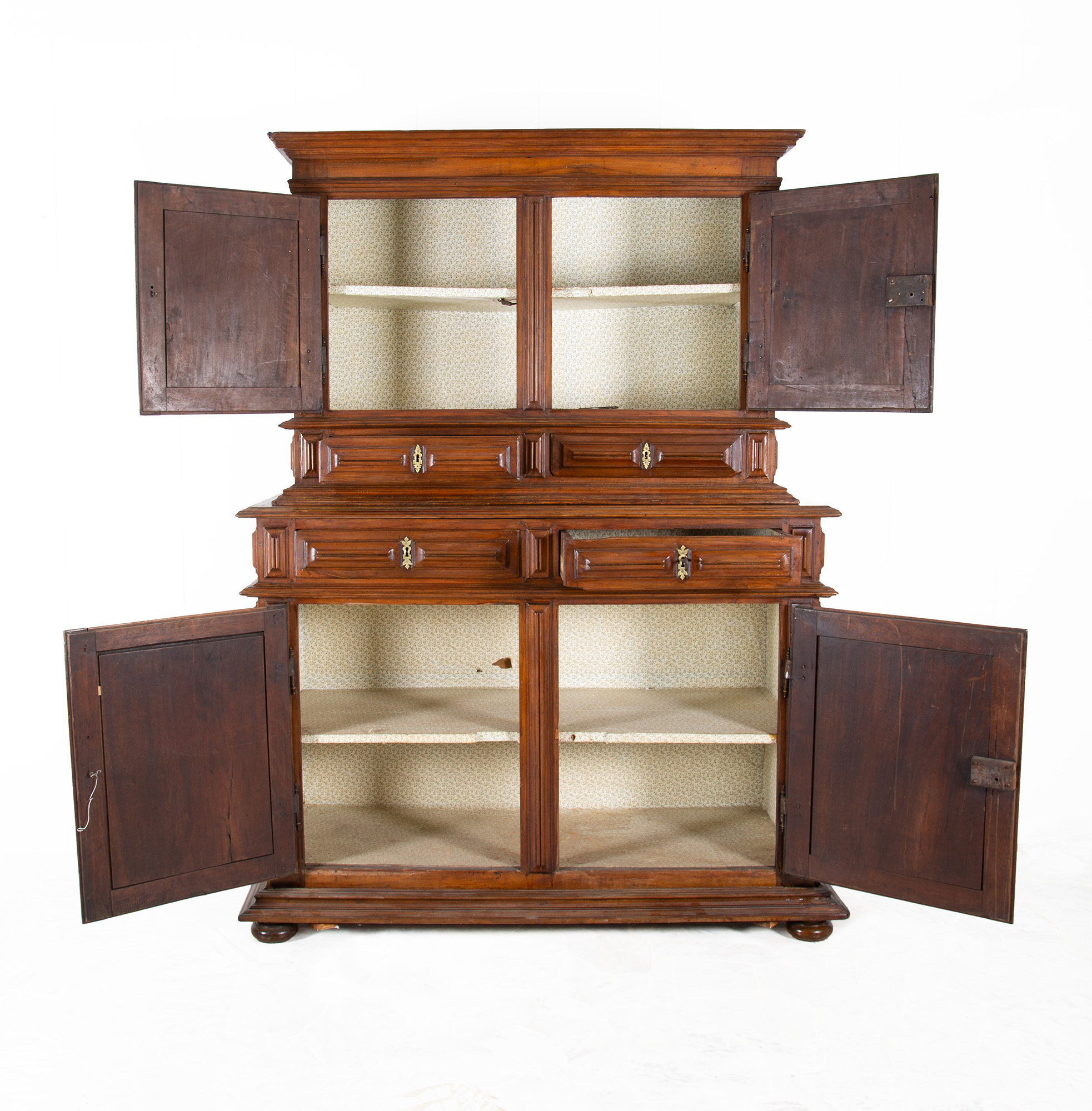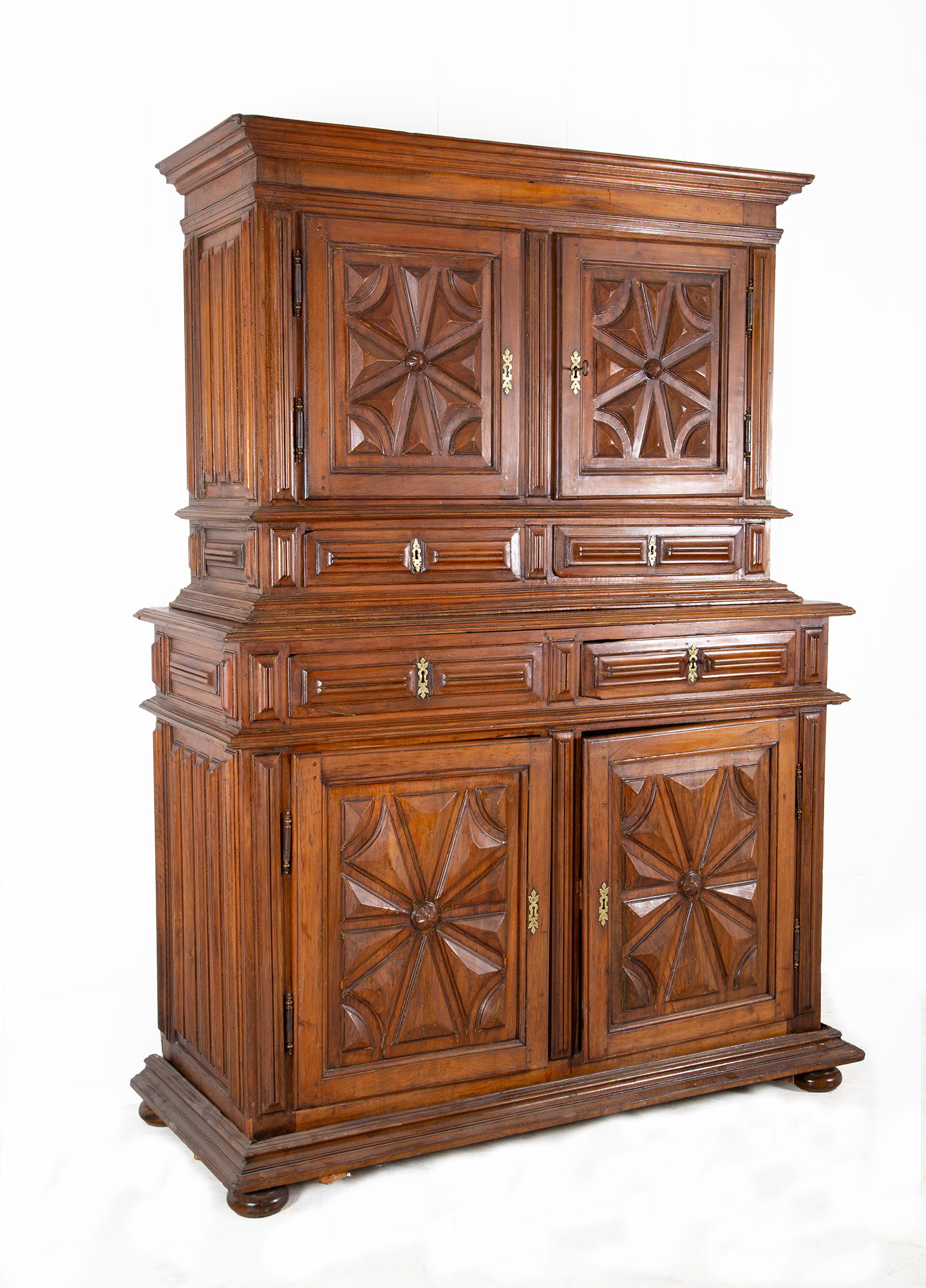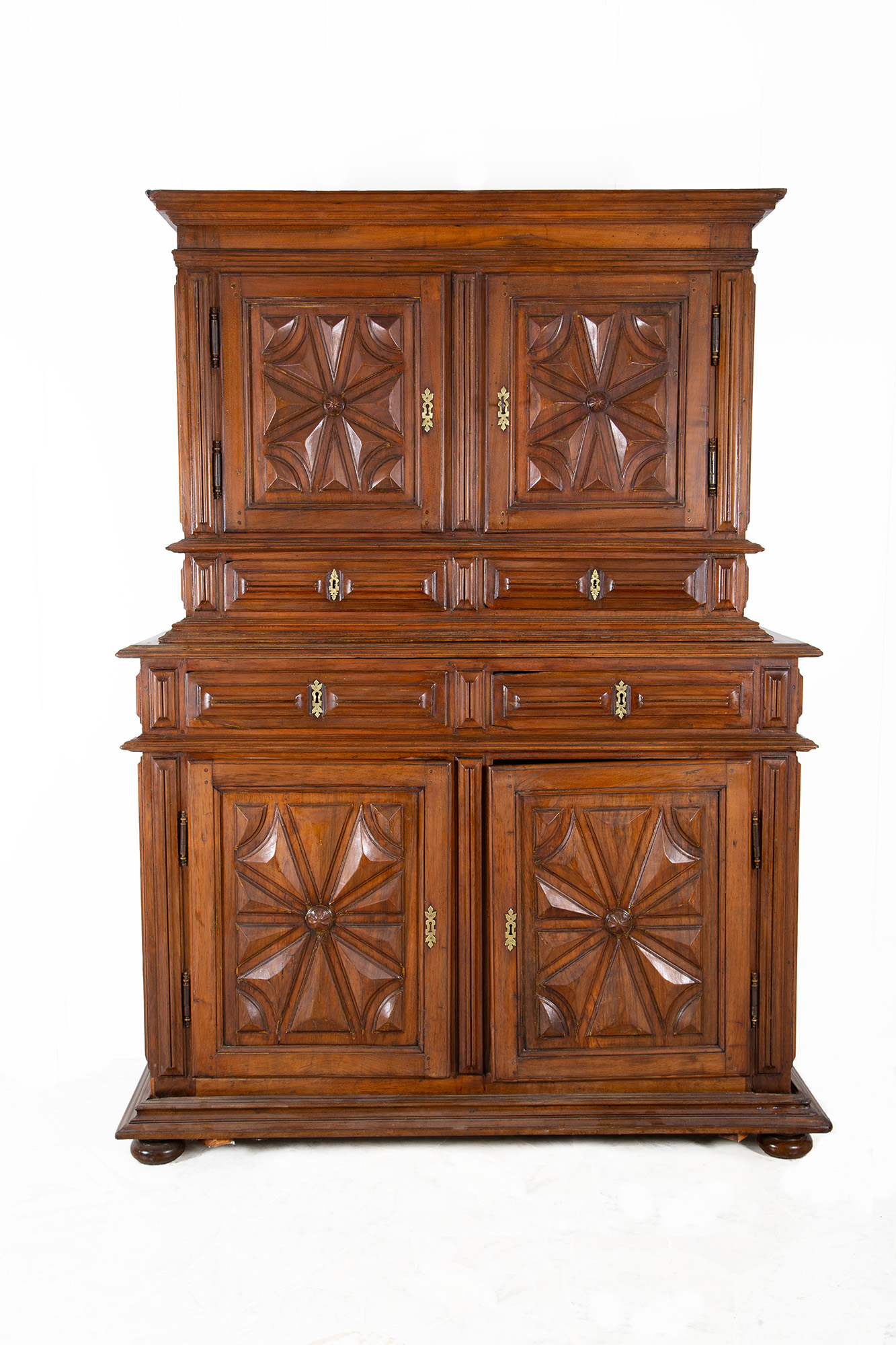Credenza doppio corpo in noce con quattro ante e quattro cassetti centrali. Piemonte confine Liguria. Fine XVII secolo. Mis. Lung. cm. 158 Alt. cm. 213 Prof. cm. 68 ca.