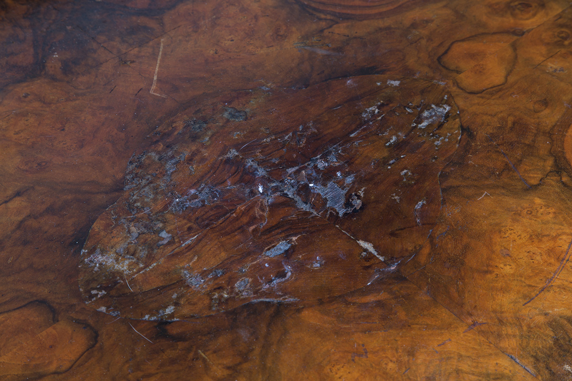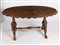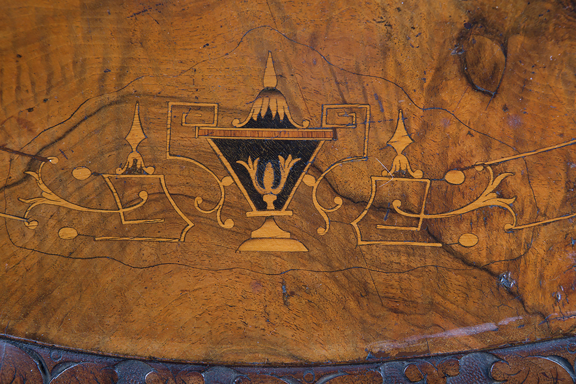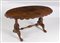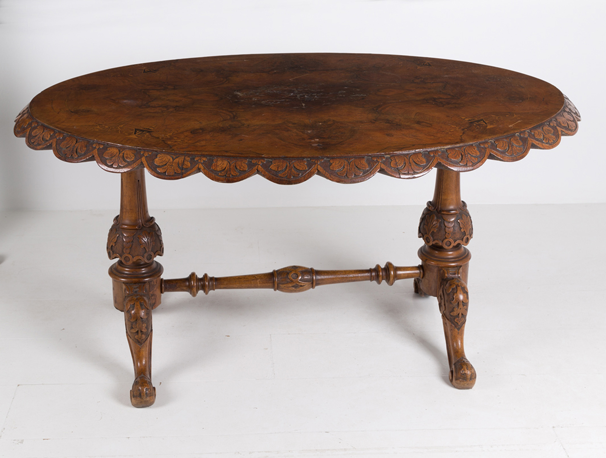 Tavolino da salotto con piano ovale lastronato in radica e raffinati intarsi con bordatura baccellata e scolpita. Inghilterra. XIX secolo. Mis. Lung. cm. 115 Alt. cm. 58 Prof. cm. 83 ca.