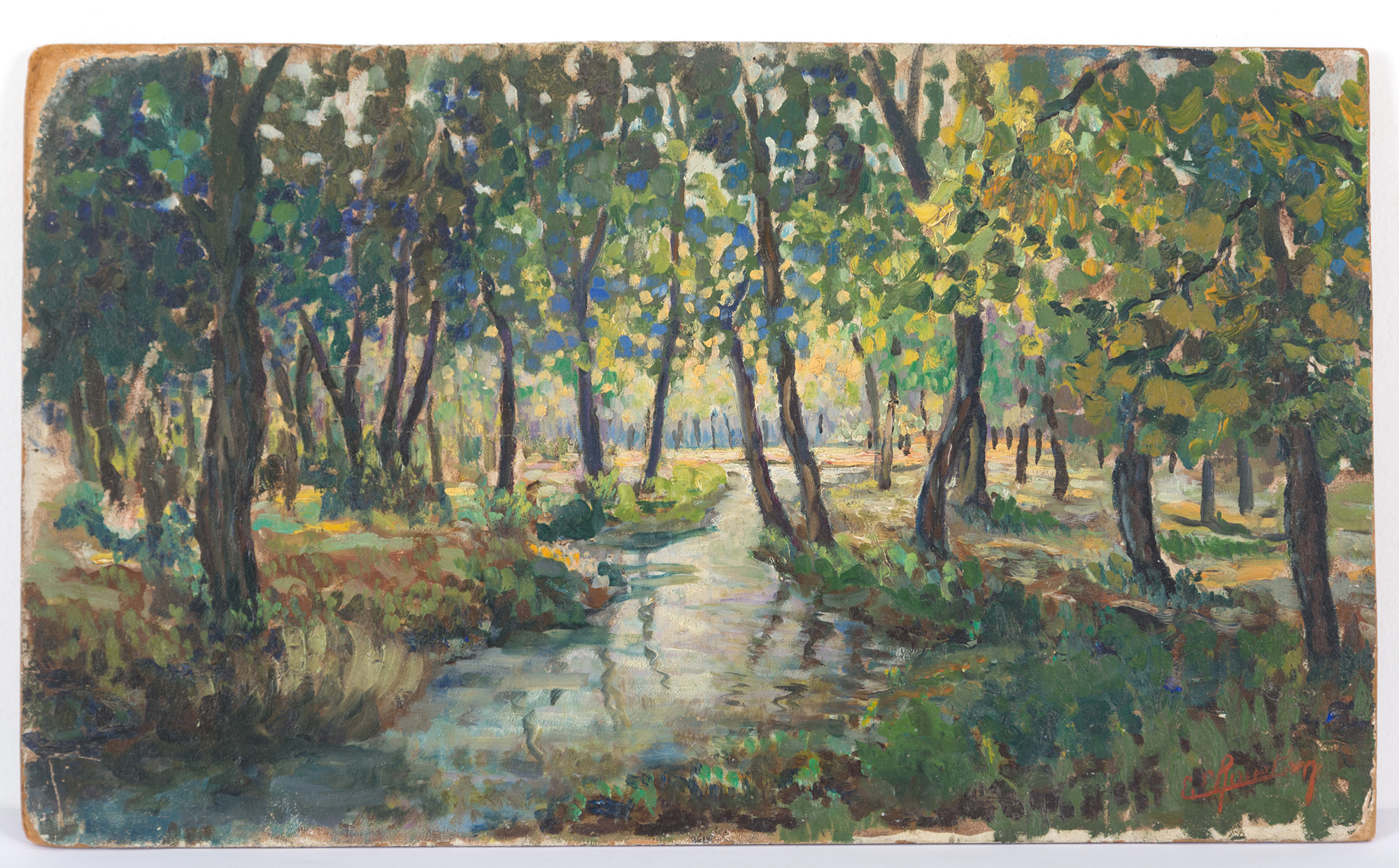 Dipinto olio su tela raff. ''PAESAGGIO FLUVIALE CON ALBERI''. Firma non identidicata in basso a destra. XX secolo. Mis. Lung. cm. 55.5 Alt. cm. 33 ca.