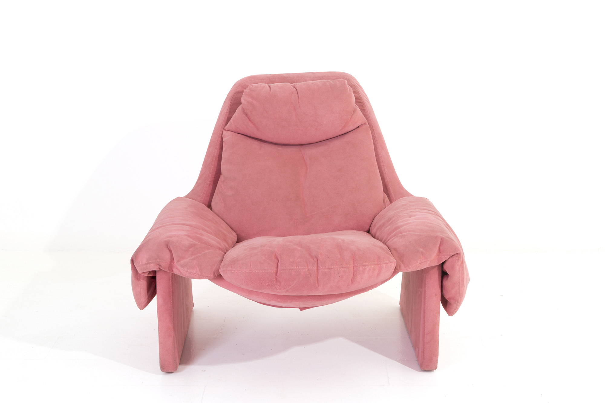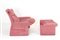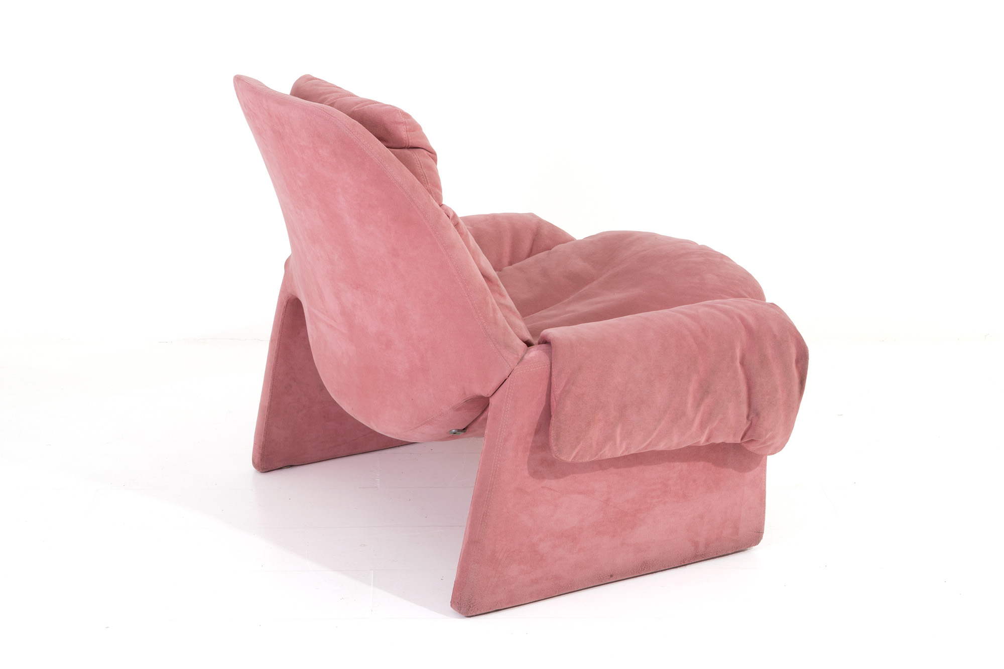VITTORIO INTROINI (1935) per SAPORITI. Poltrona con poggiapiedi estraibile in alcantara rosa. Tessuto originale. Anni '70-'80. Difetti. Mis. Lung. cm. 100 Alt. cm. 82 Prof. cm. 100 ca.