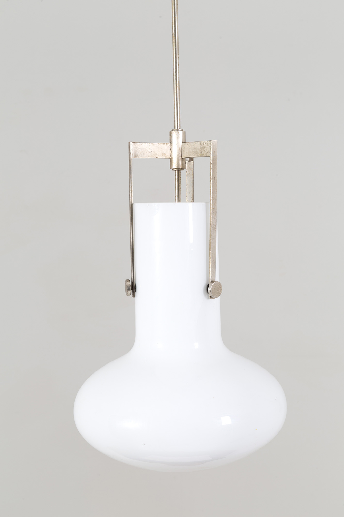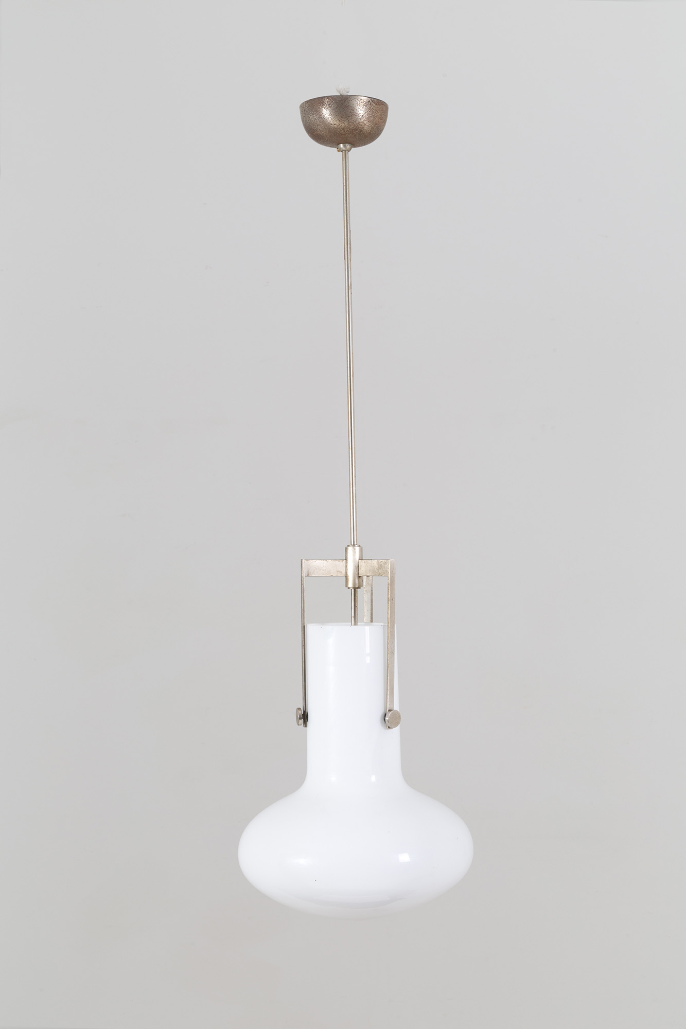 IGNAZIO GARDELLA (Milano, 1905 - Oleggio, 1999) per AZUCENA. Lampadario in metallo cromato e vetro di Murano. 1958. Mis. Alt. cm. 95 Diam. cm. 32 ca.
