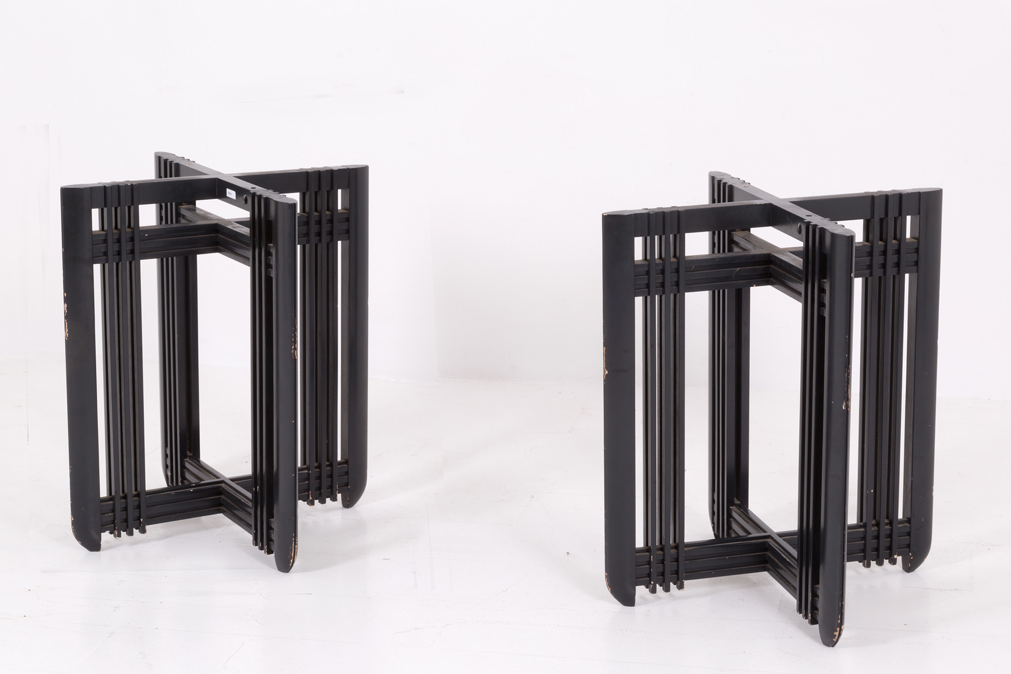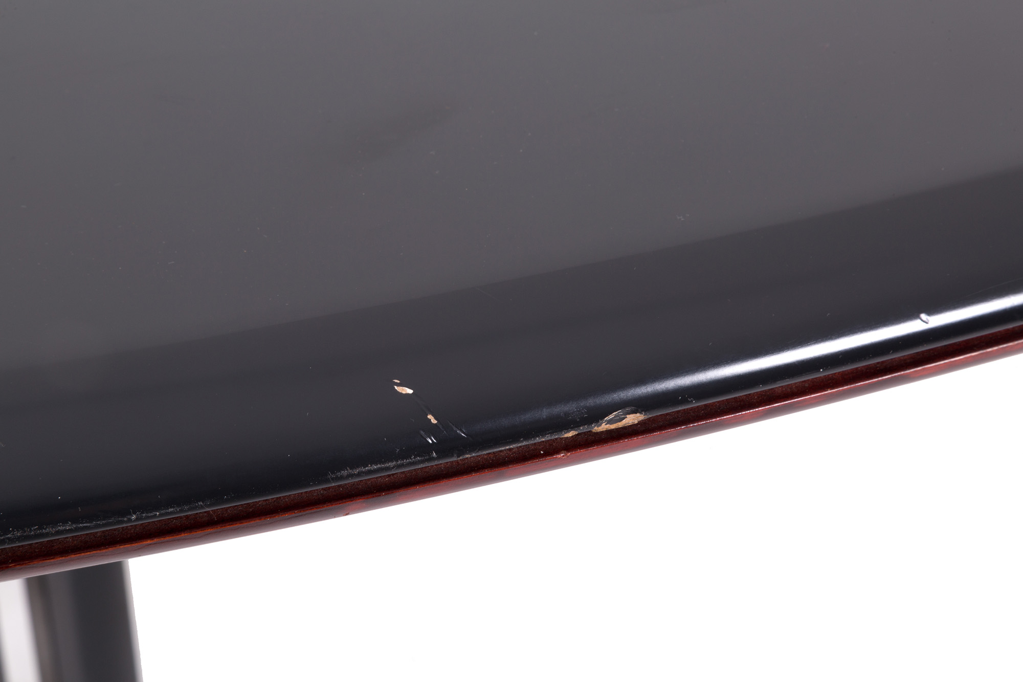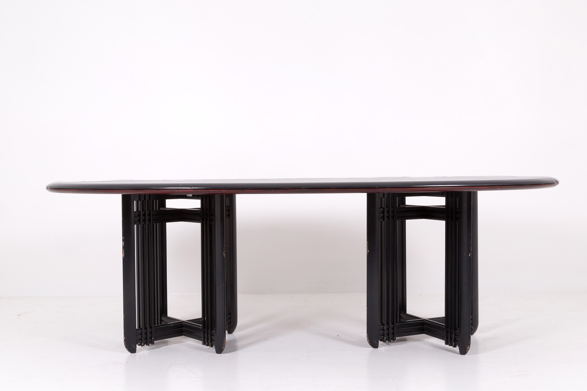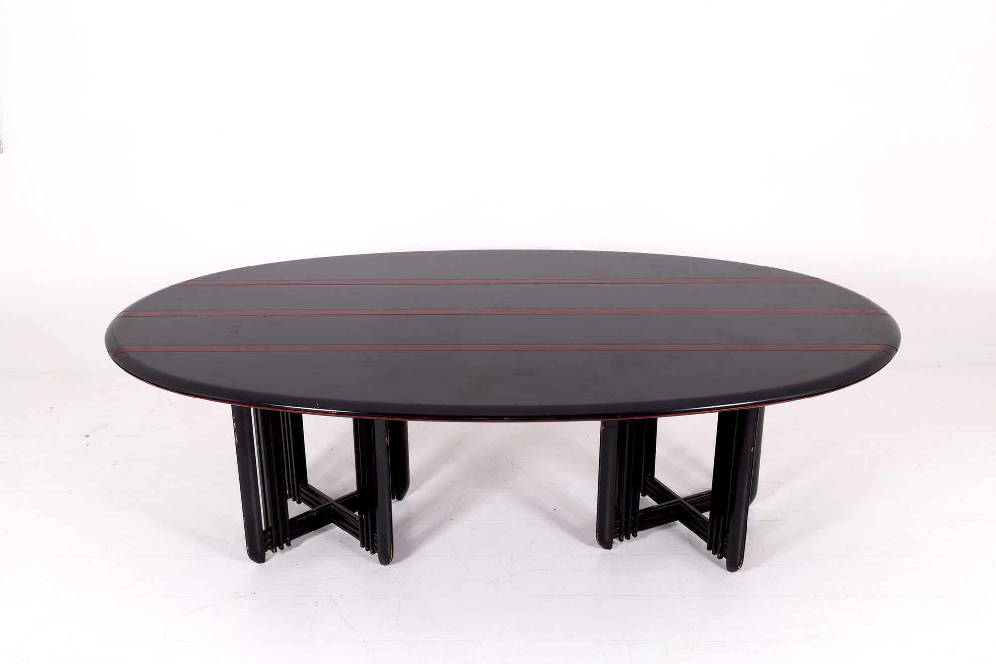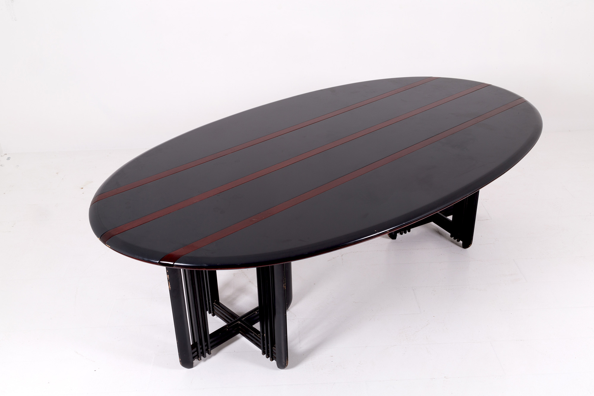 Tavolo ovale in legno laccato. Manifattura italiana. Anni '70. Segni di usura del tempo. Mis. Lung. cm. 217 Alt. cm. 72 Prof. cm. 125 ca.