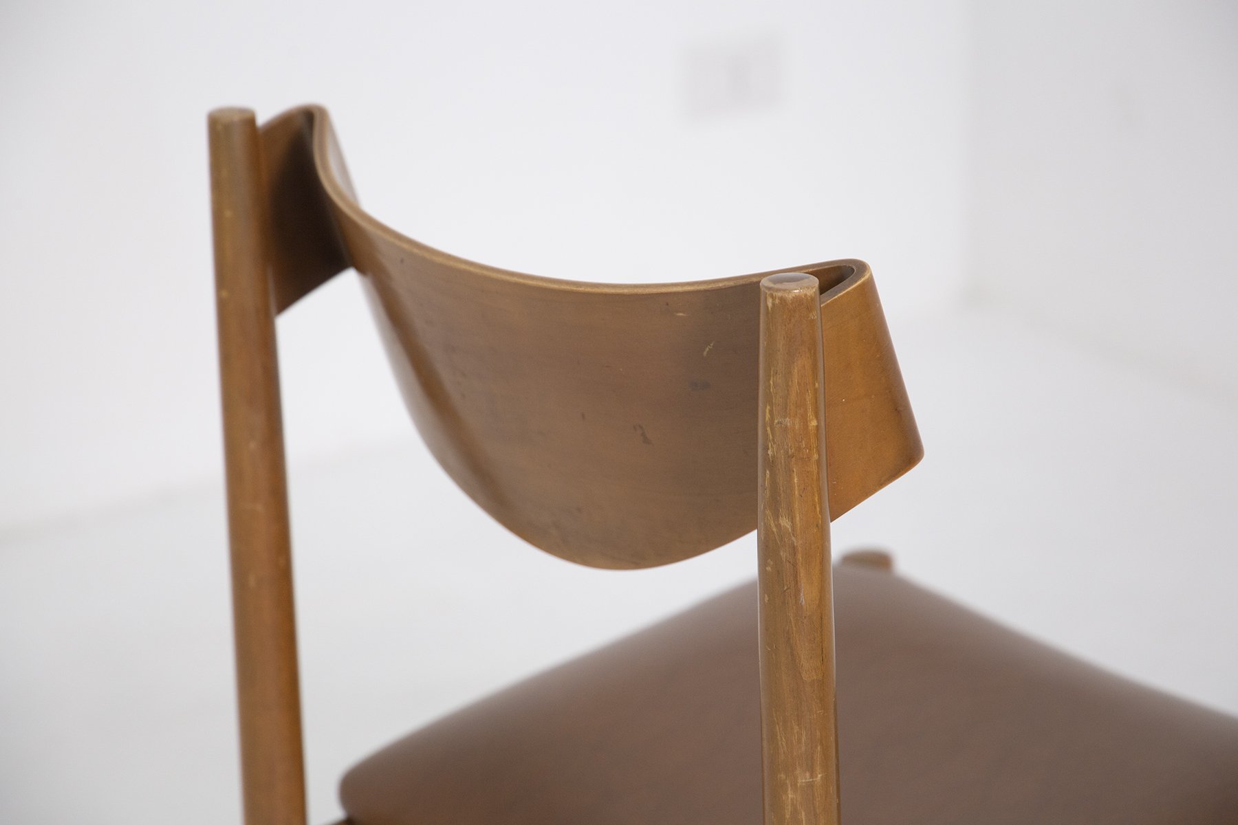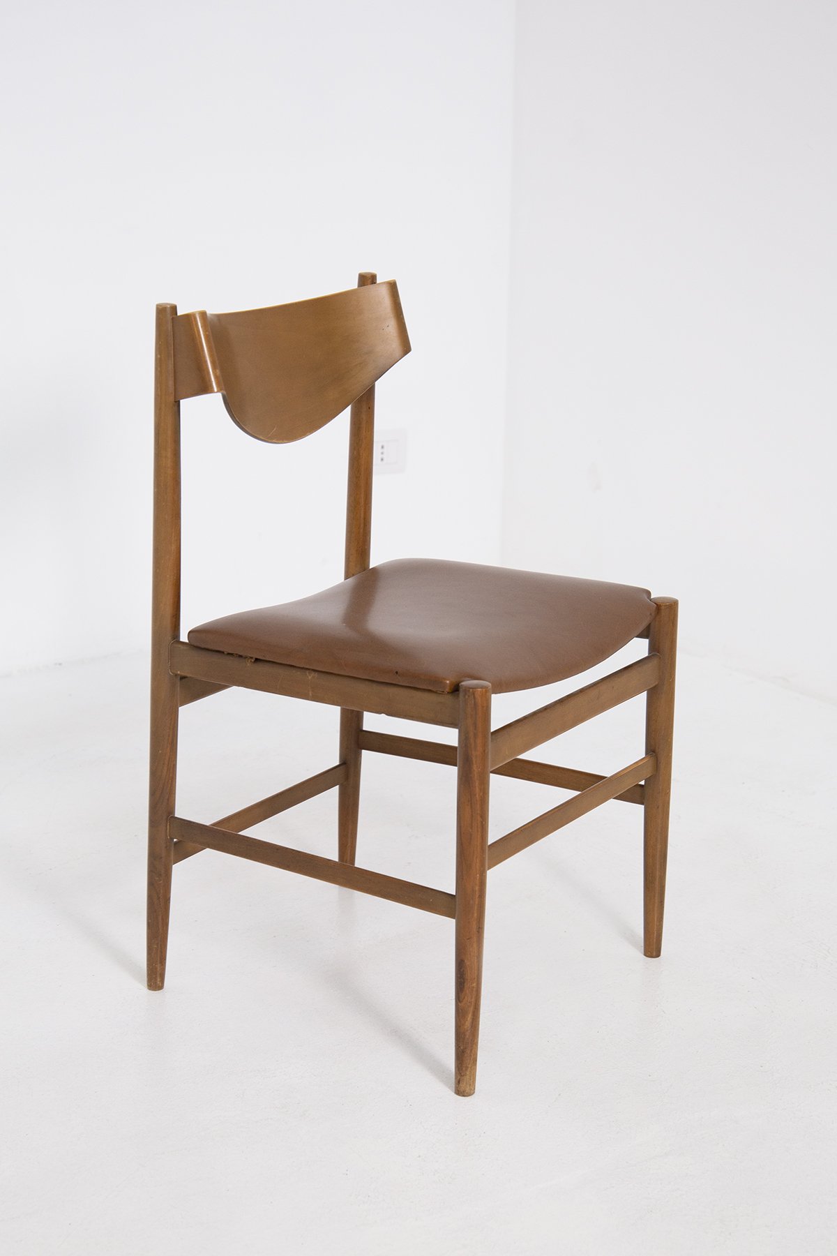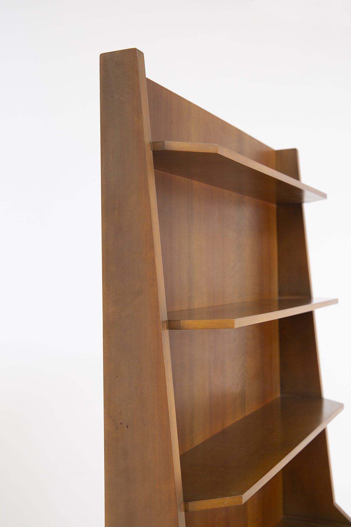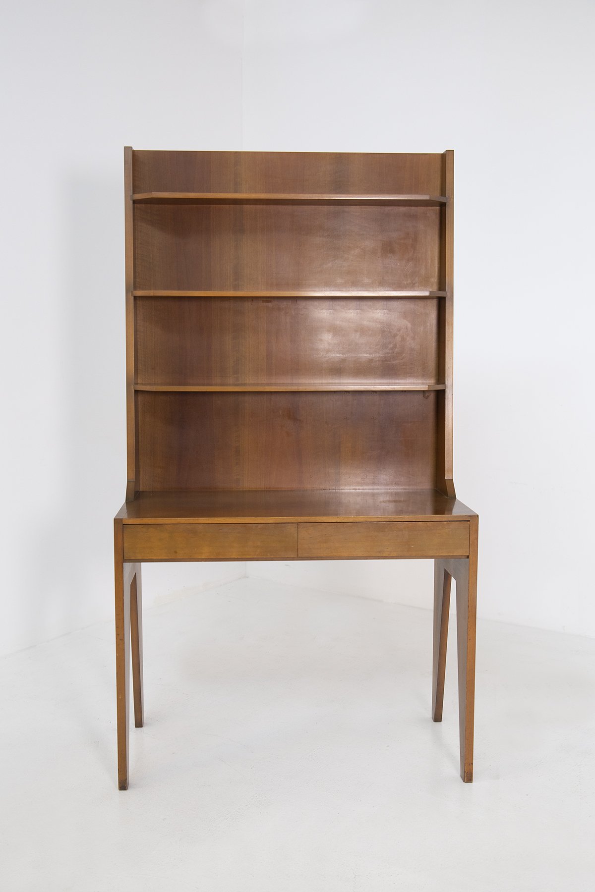 Set in legno composto da una libreria/scrivania con tre ripiani e due cassetti e sedia con seduta in pelle marrone. Manifattura italiana. Anni '50. Mis. Lung. cm. 46 Alt. cm. 80 Prof. cm. 46 ca.