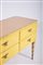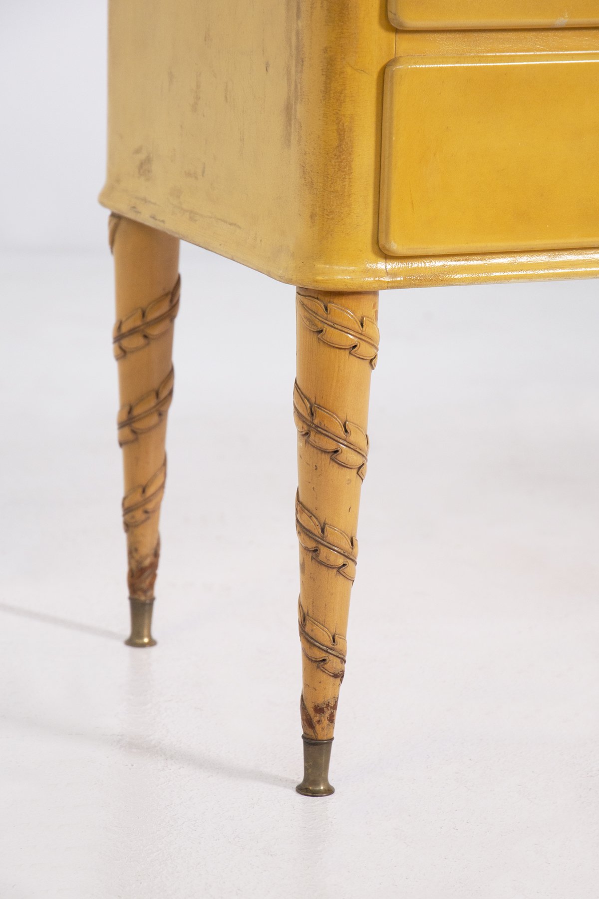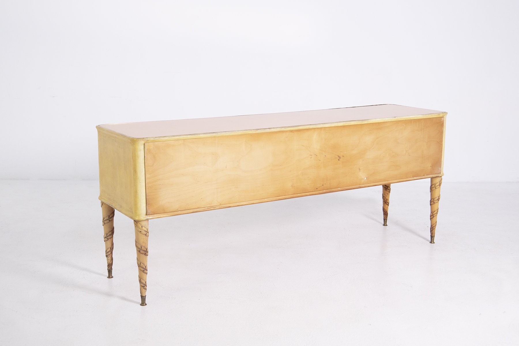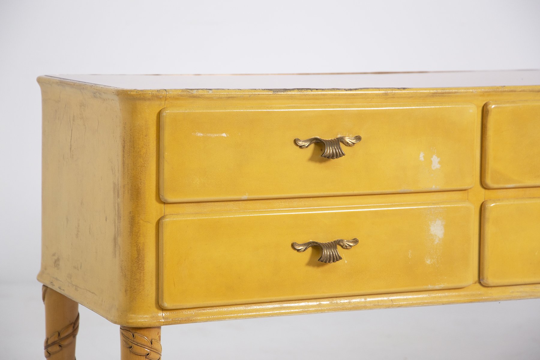 PAOLO BUFFA (Milano 1903-1970). Credenza in pergamena gialla con sei cassetti e manici in ottone, piano in vetro rosa e gambe in legno intagliato raffigurante un'edera. Anni '50. Pubblicata su Arredamento Moderno 4 Serie Imm. 575. Mis. Lung. cm. 190 Alt. cm. 78 Prof. cm. 49 ca.