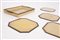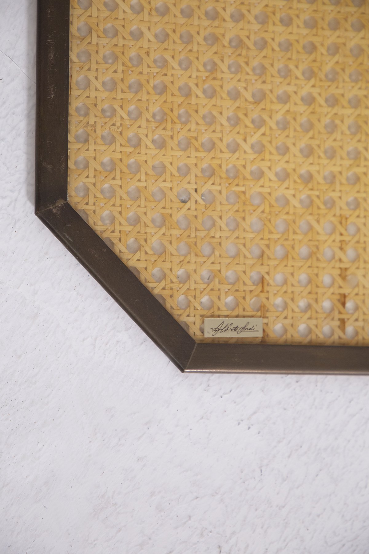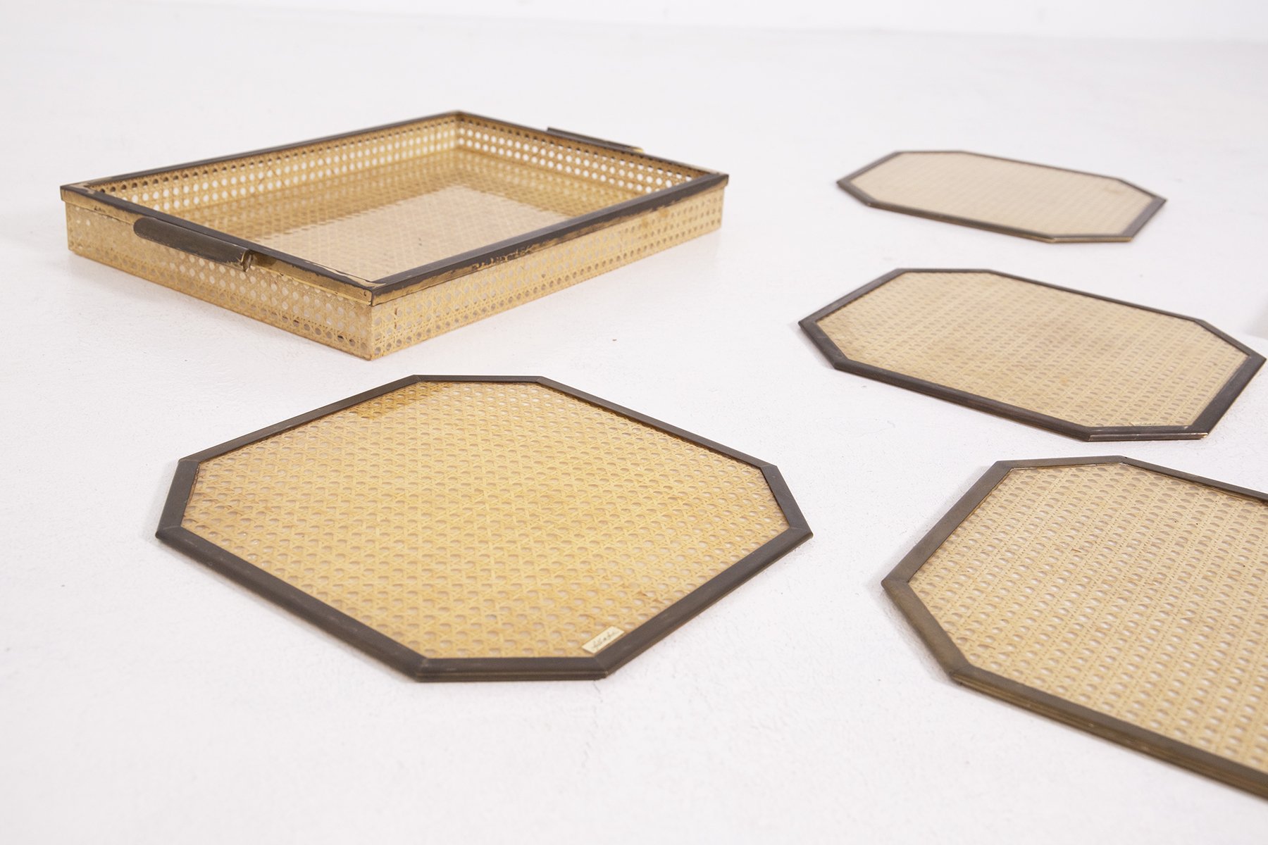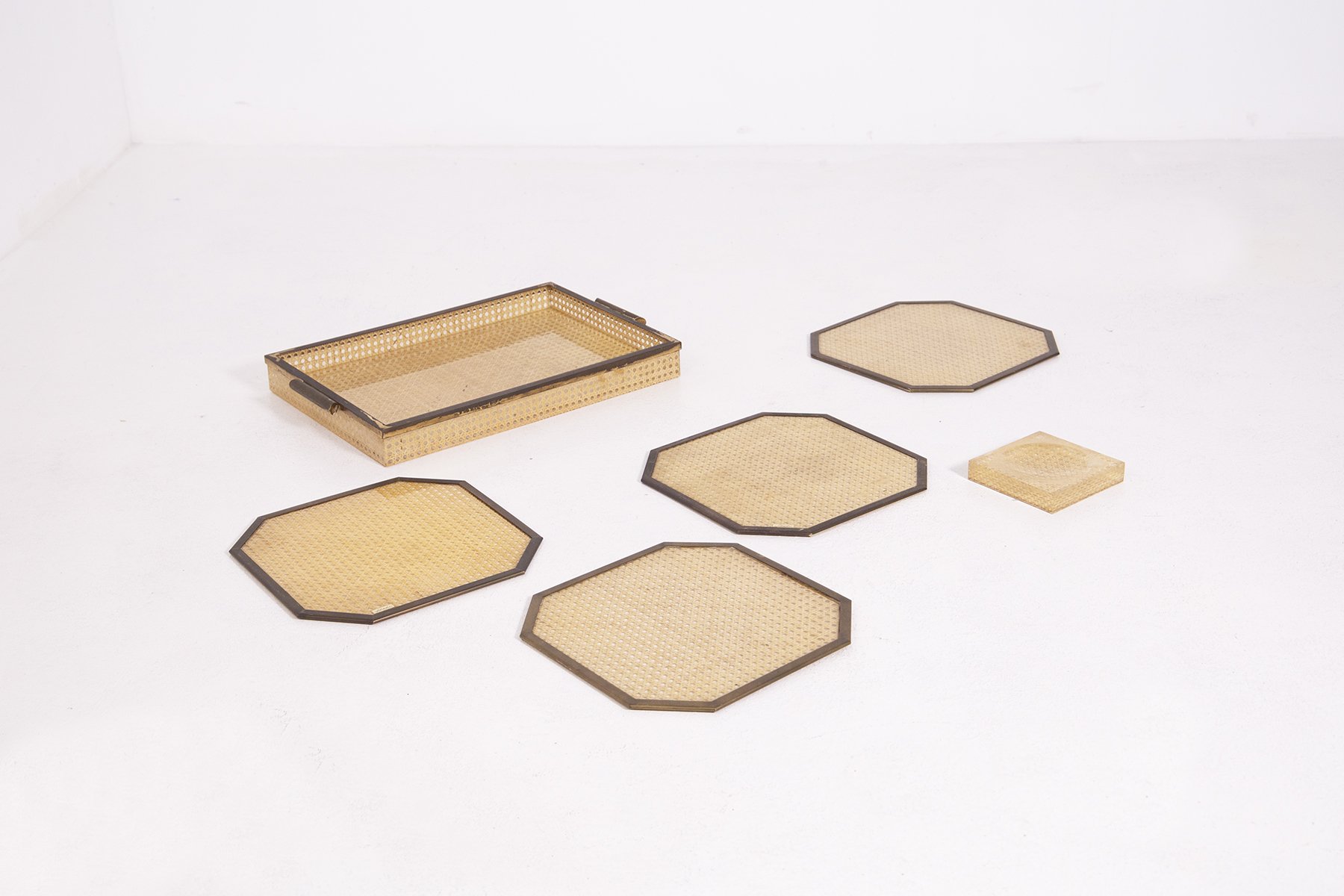 Servizio da tavola composto da un vassoio, quattro sottopiatti e un posacenere in plastica lucite, con reticolo in rattan e bordo in ottone. Firmato da ALBERTO SORDI. 1970. Misure sottopiatti: Alt. 55 cm Larg. 55 cm Prof. 1 cm Misure posacenere: Alt. 10 cm Larg. 10 cm Prof. 4 cm