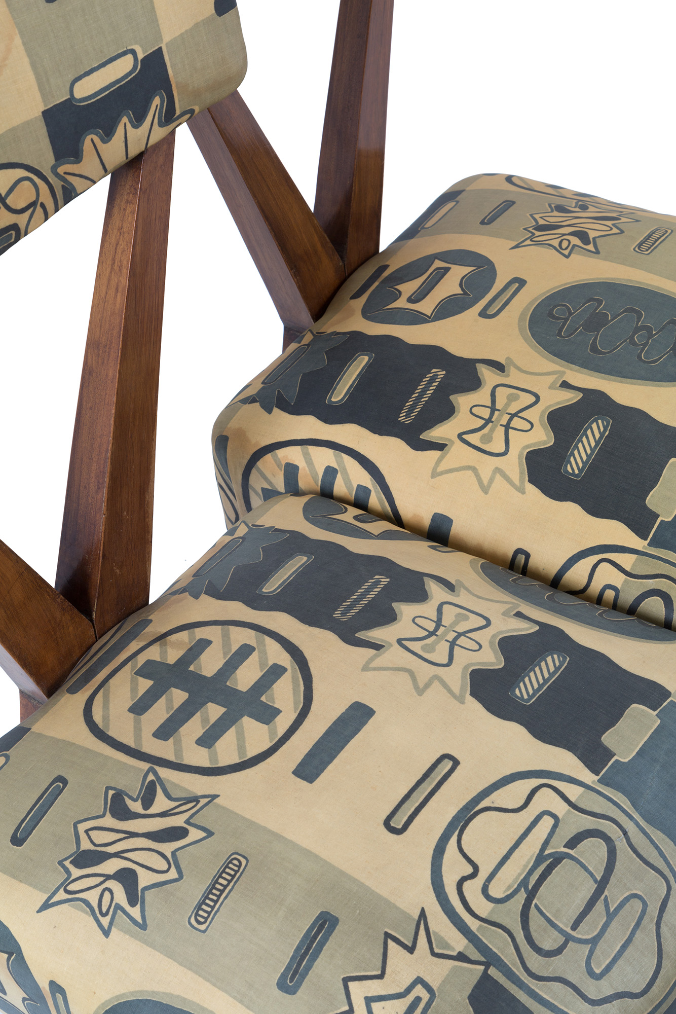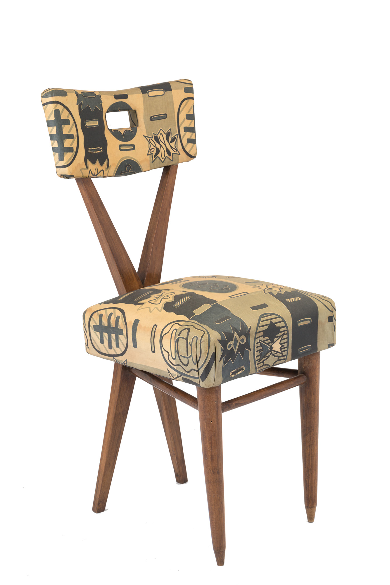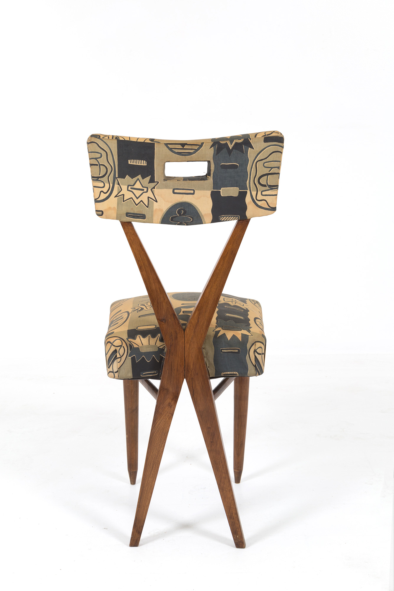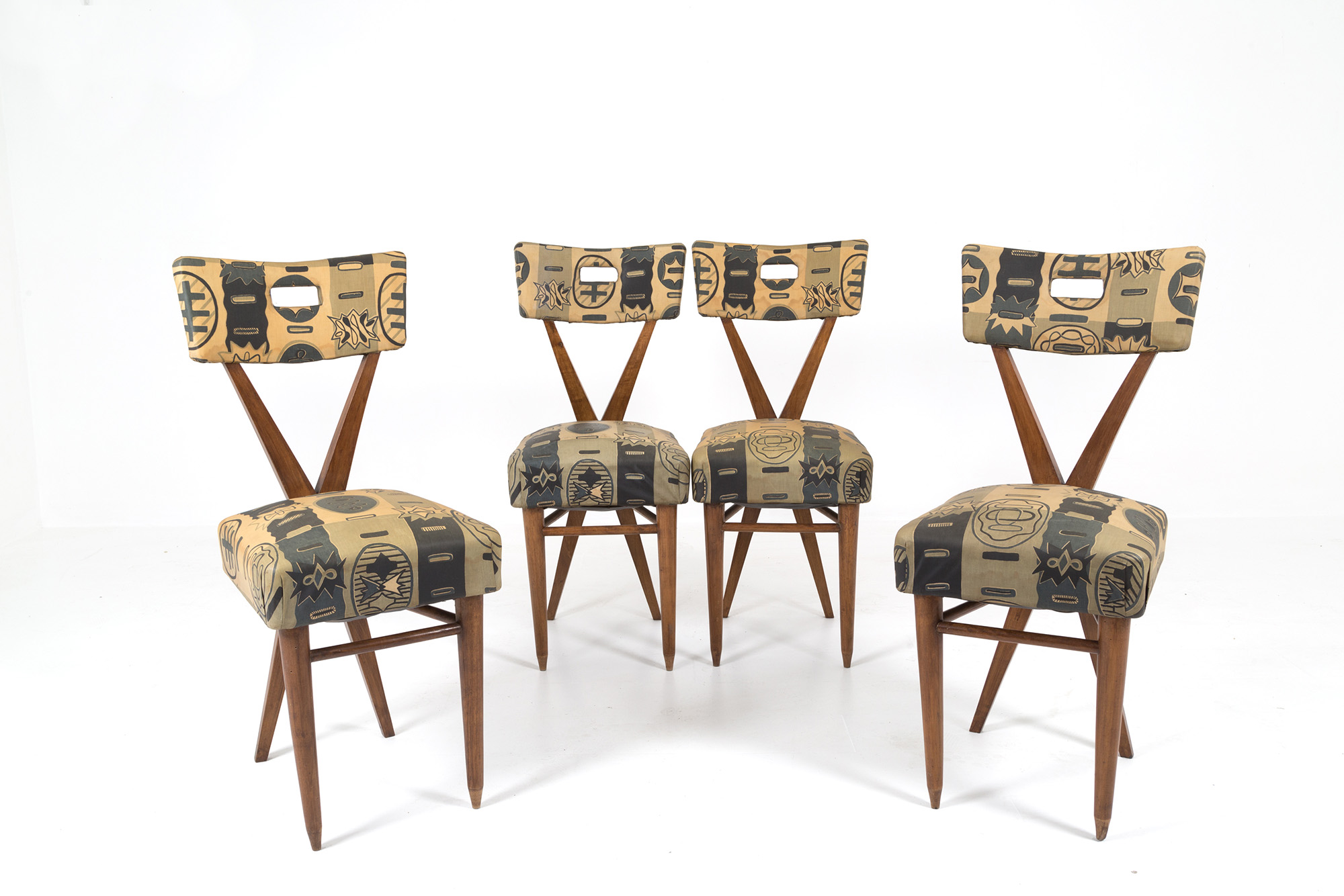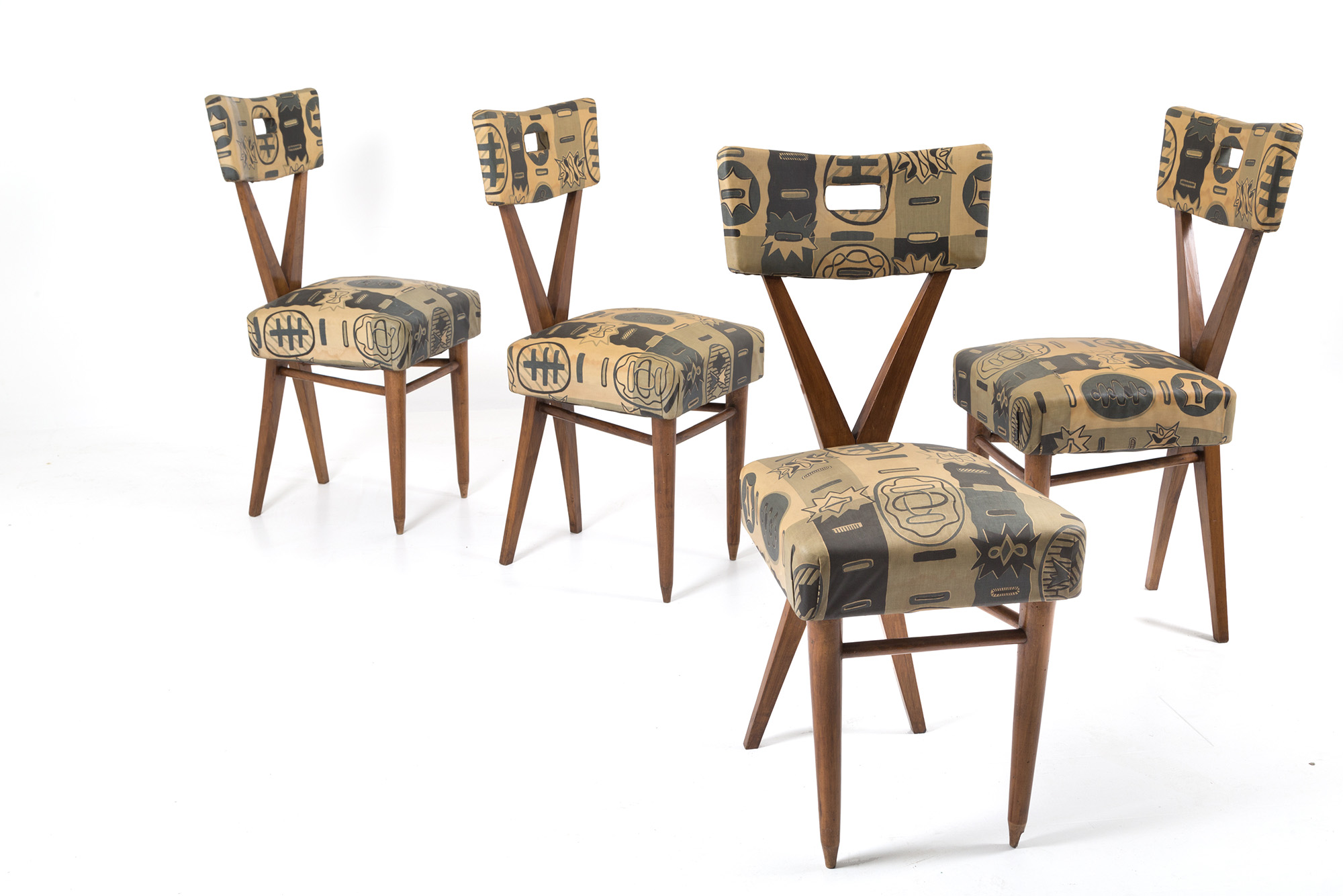 GIANNI VIGORELLI (Tormo, 1916 - Lodi, 1998). Quattro sedie in legno con importante tessuto coevo. Anni '50. Mis. Lung. cm. 40 Alt. cm. 96 Prof. cm. 45 ca.