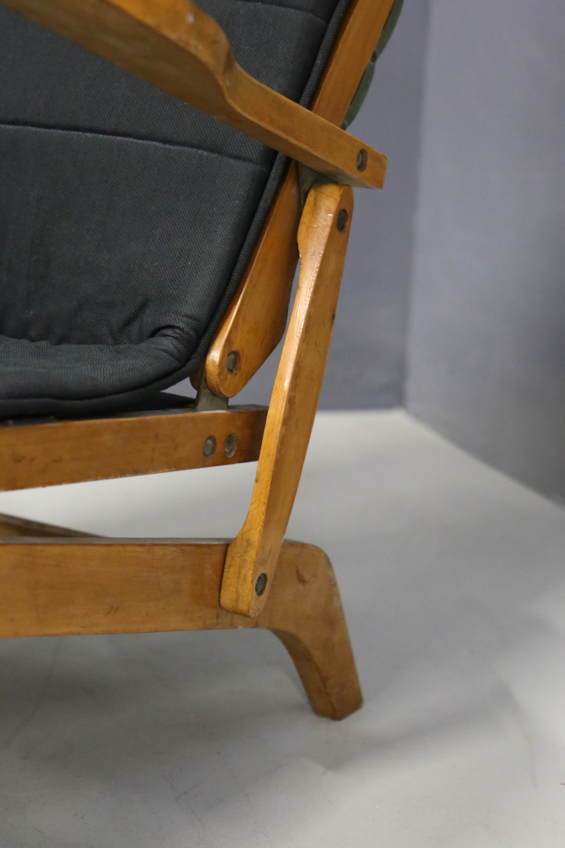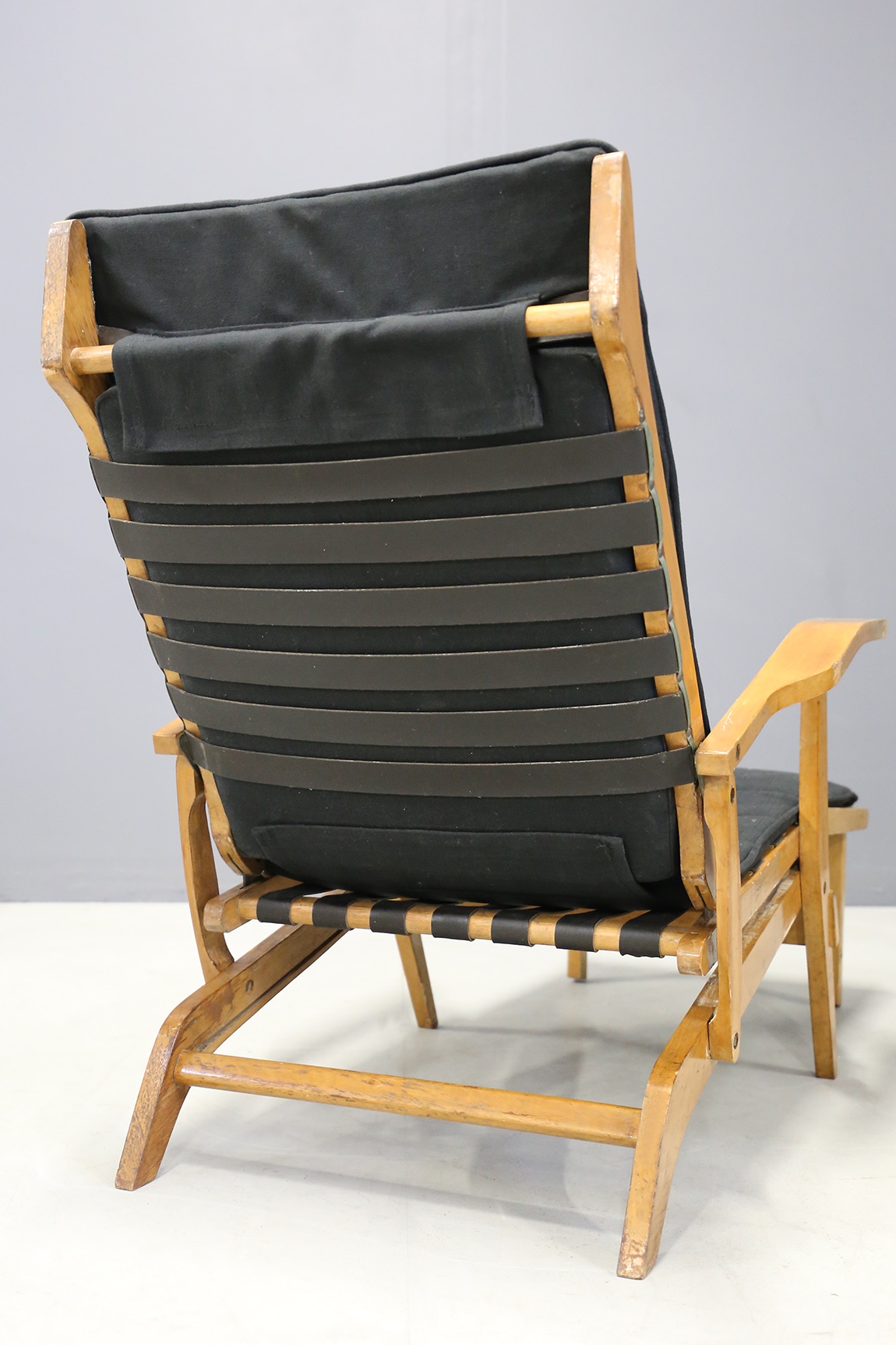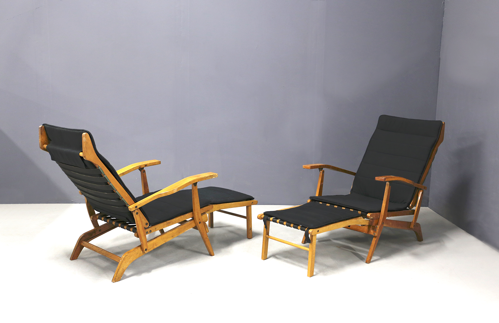 BBPR (Attr). Due sdraio in legno di ciliegio, cinghie di cuoio per seduta e schienale e cuscini in cotone nero. Anni '50. Mis. Lung. cm. 80 Alt. cm. 68 Prof. cm. 96 ca.