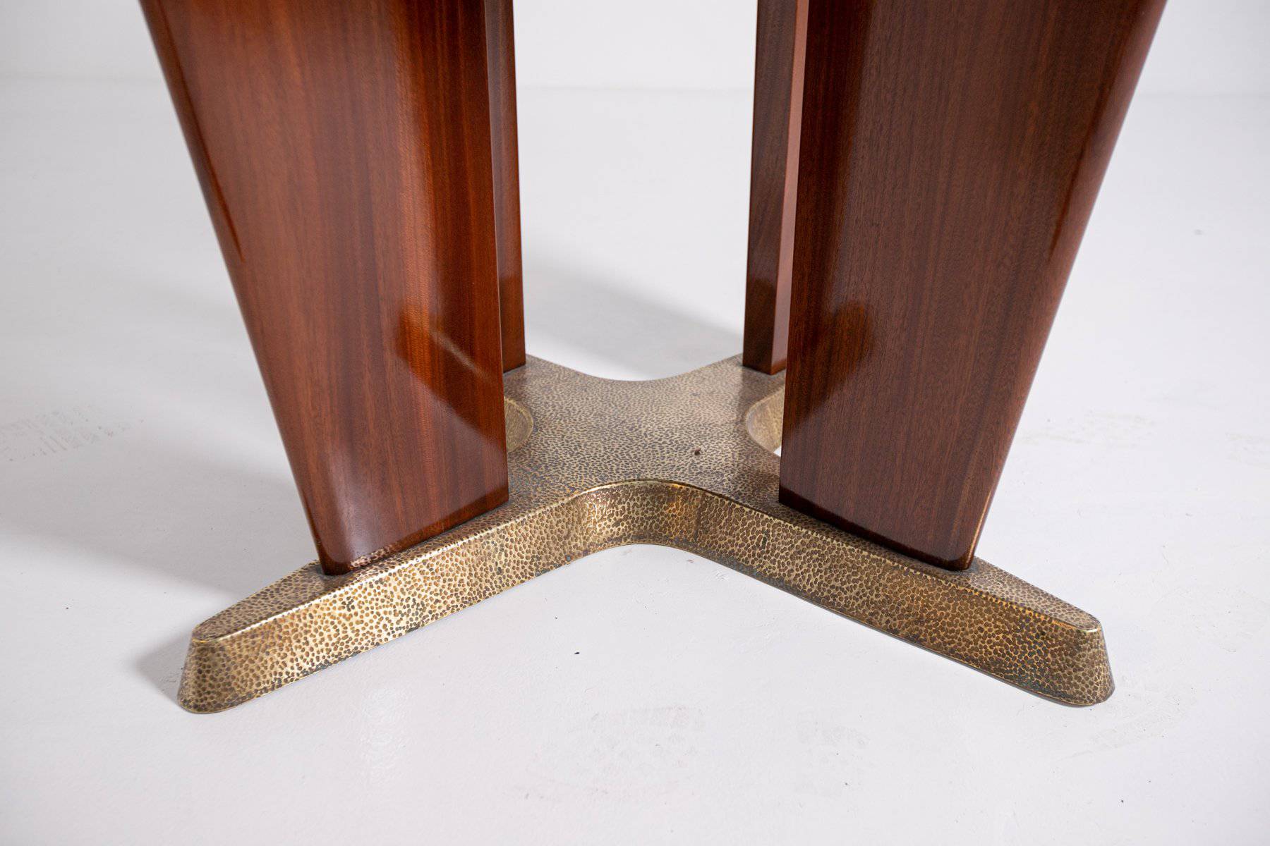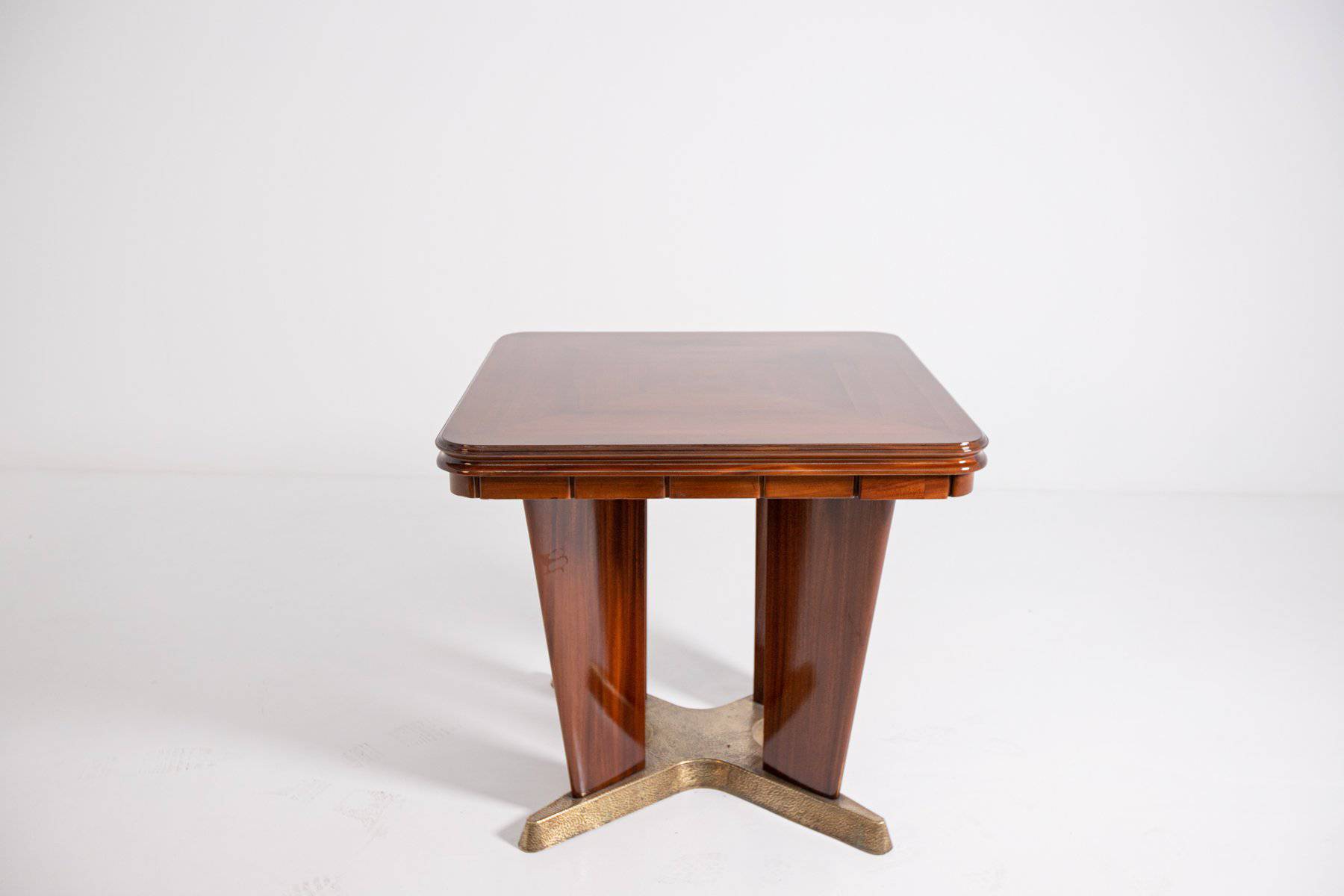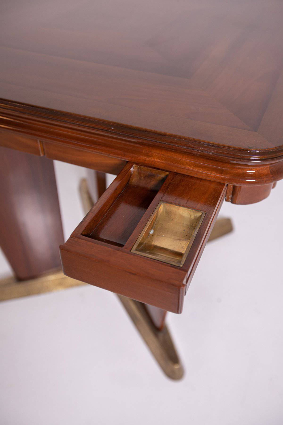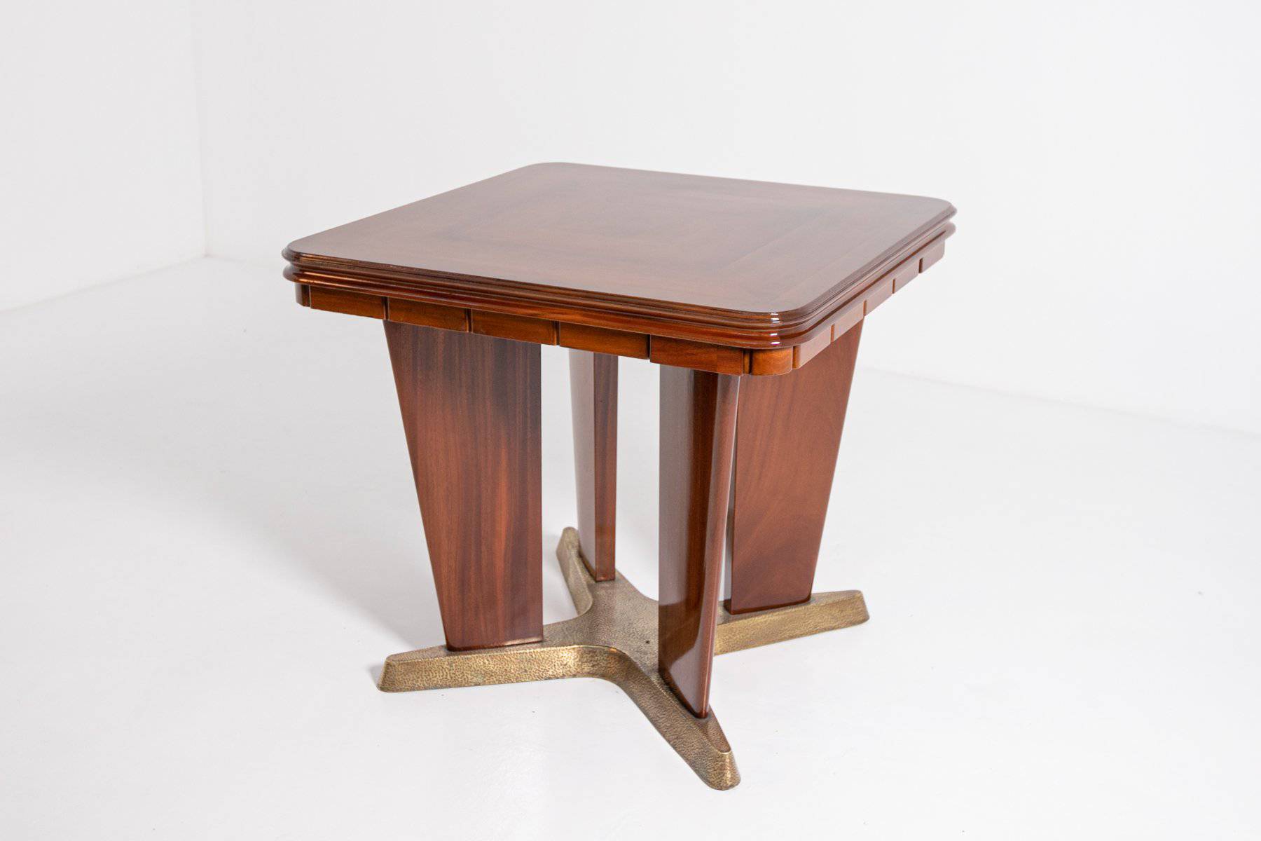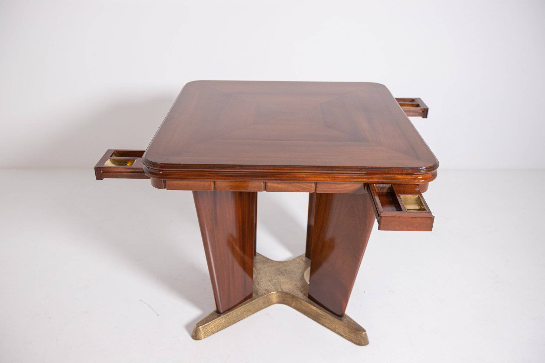 GIORGIO RAMPONI. Tavolo da gioco in legno di noce con base e posaceneri rimovibili in ottone. Anni '50. Restaurato. Mis. Lung. cm. 90 Alt. cm. 80 Prof. cm. 90 ca.