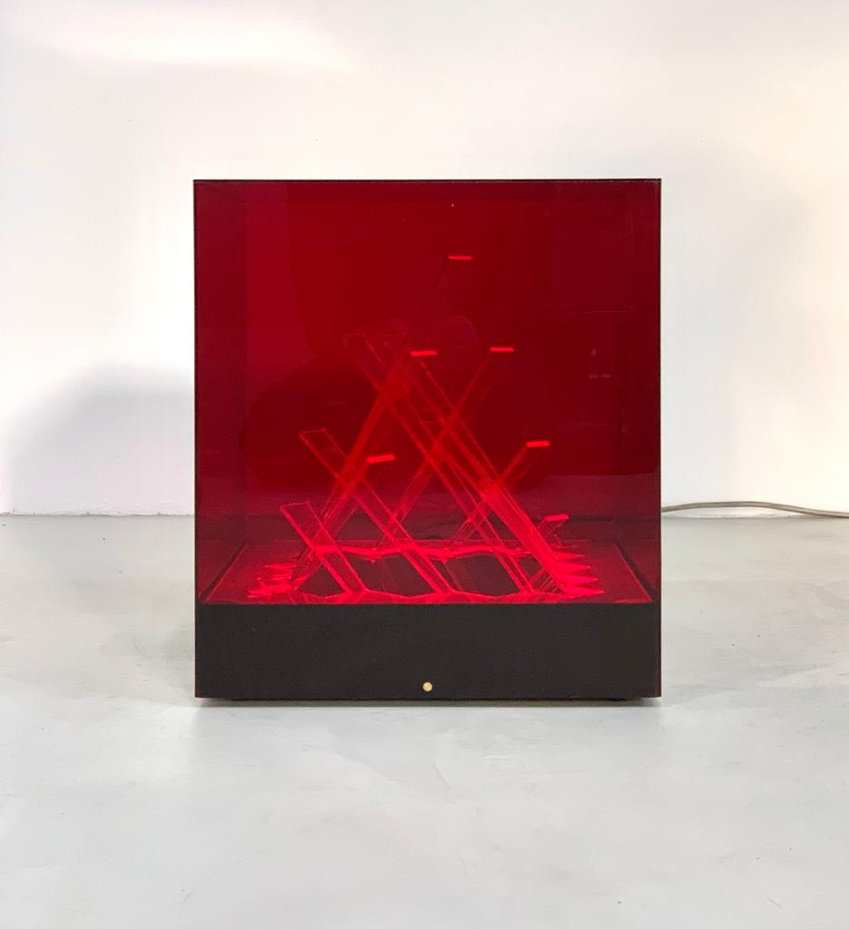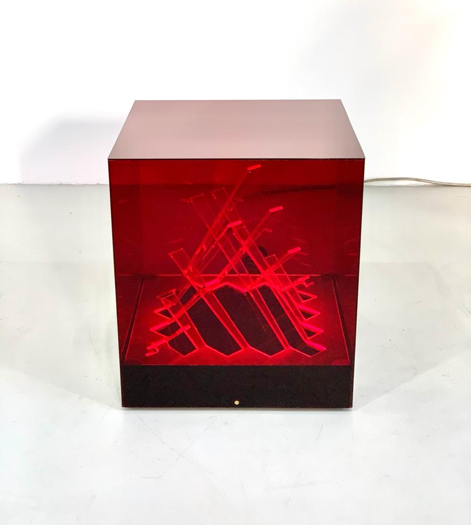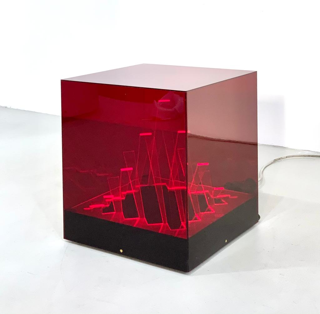 JAMES RIVIERE (1949) per CENTRO RICERCHE ARTE INDUSTRIA LISSONE. Lampada da tavolo Cubo di Teo in polimetilmetacrilato rosso. Anni '60. Mis. Lung. cm. 40 Alt. cm. 45 Prof. cm. 40 ca.