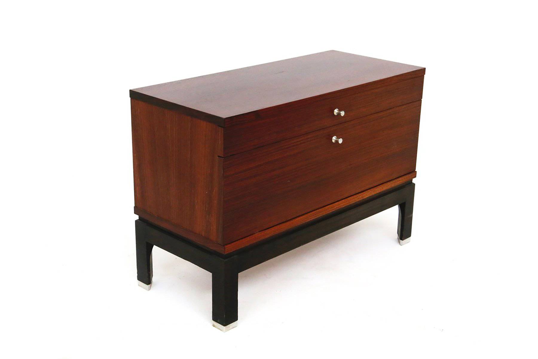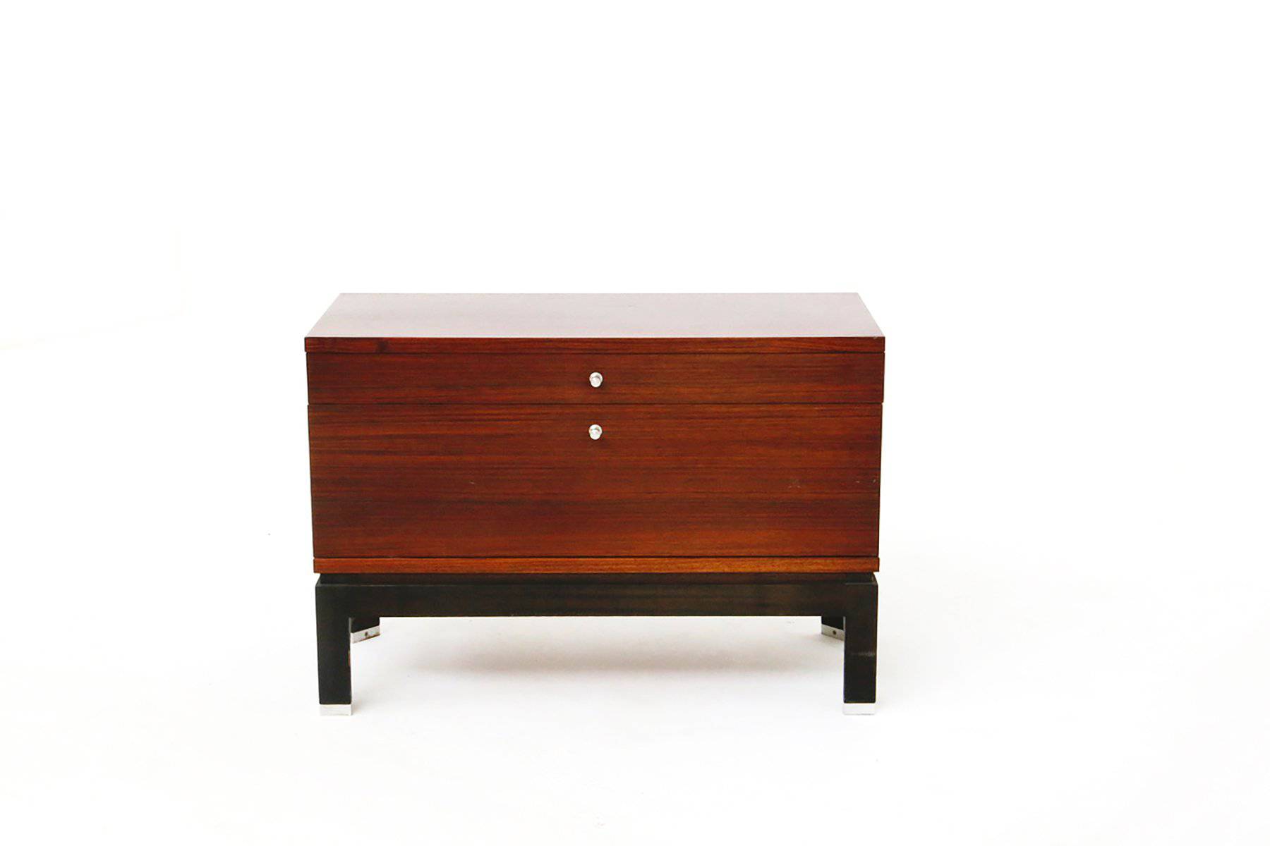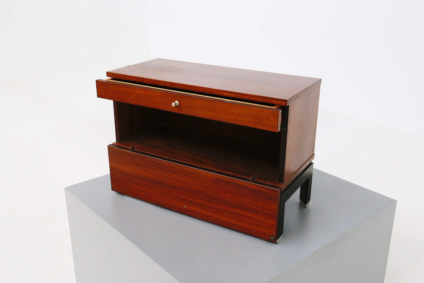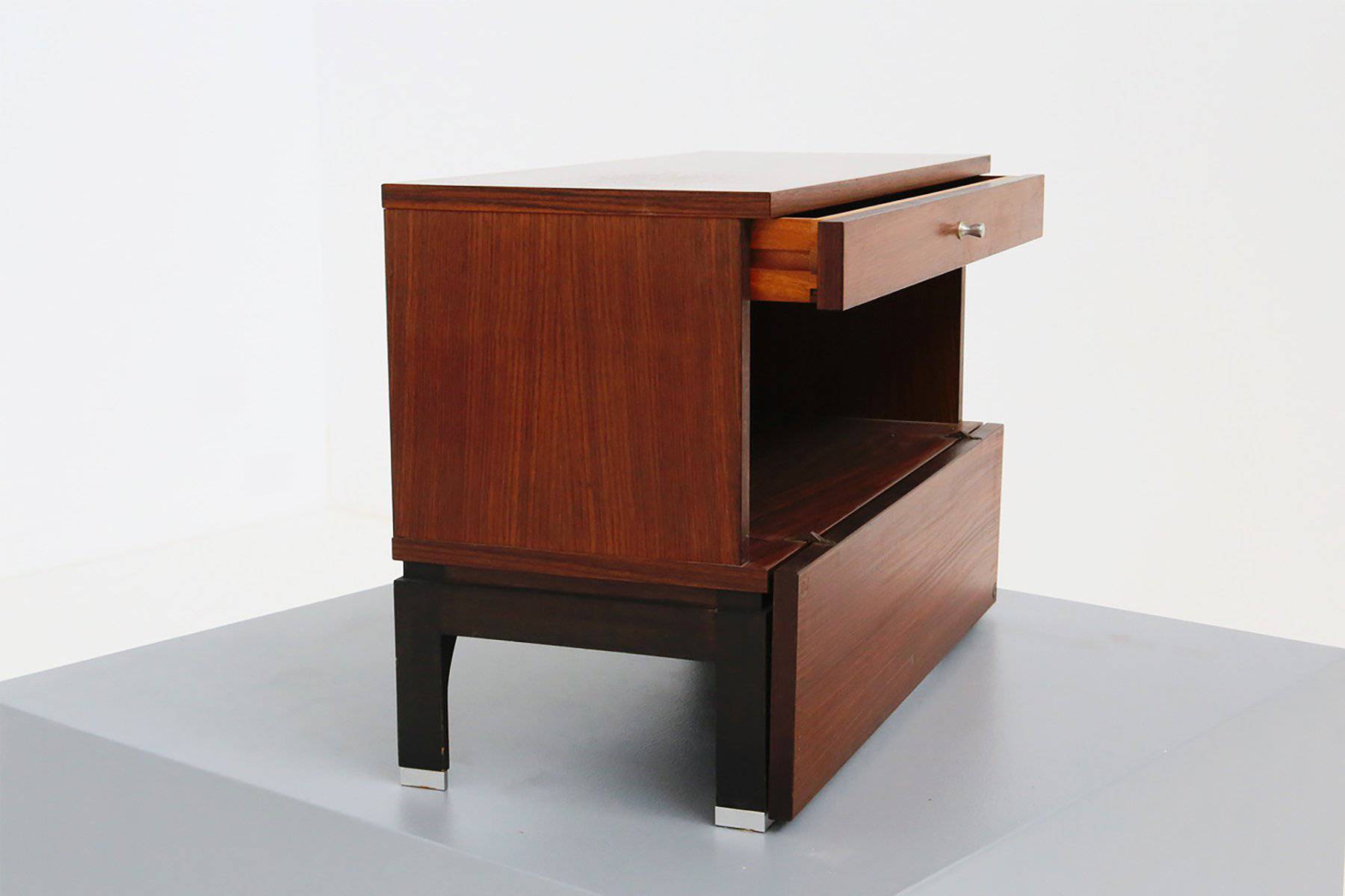 Coppia di comodini in legno e acciaio con due cassetti, di cui uno a ribalta. Produzione MIM. Anni '60. Condizioni originali. Mis. Lung. cm. 100 Alt. cm. 40 Prof. cm. 60 ca.