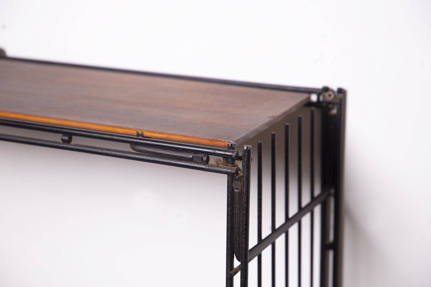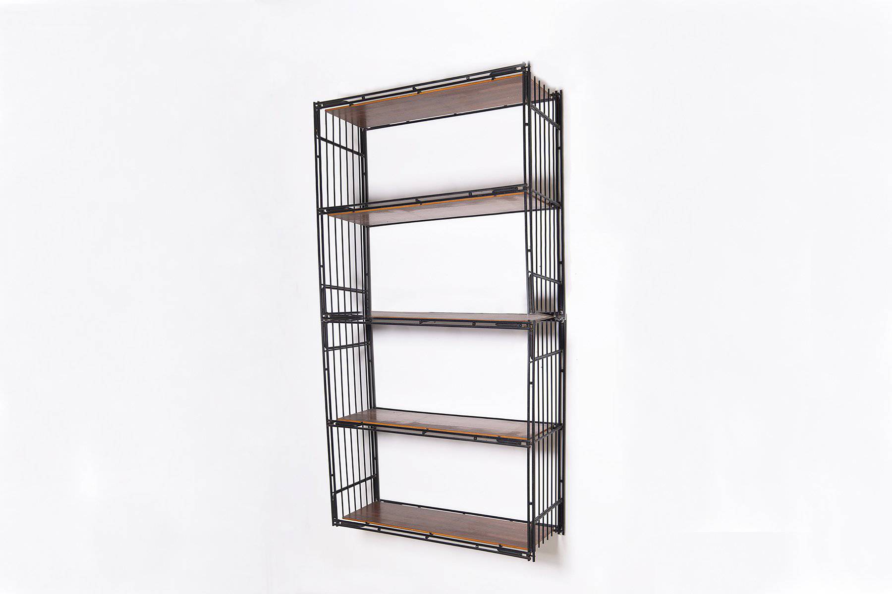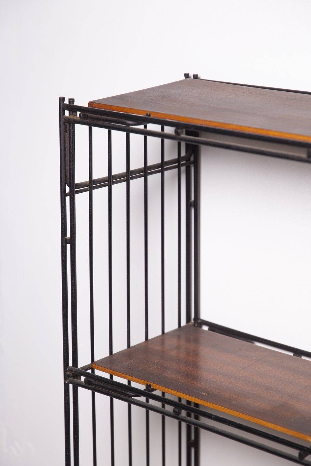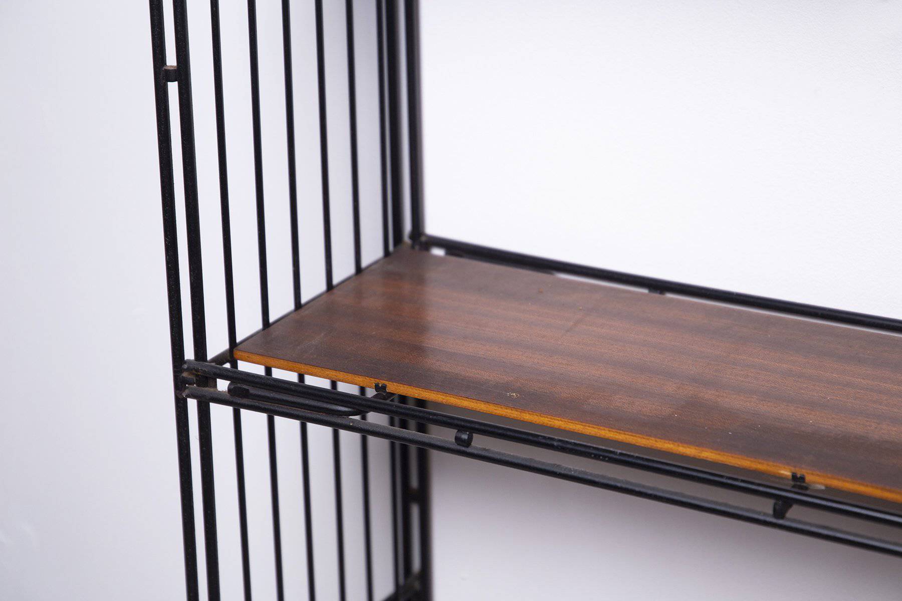 Libreria a due elementi componibili in tubolare di ferro verniciato nero con ripiani in legno impiallacciato. Manifattura italiana. Anni '50. Condizioni originali. Mis. Lung. cm. 63 Alt. cm. 60 Prof. cm. 22 ca.