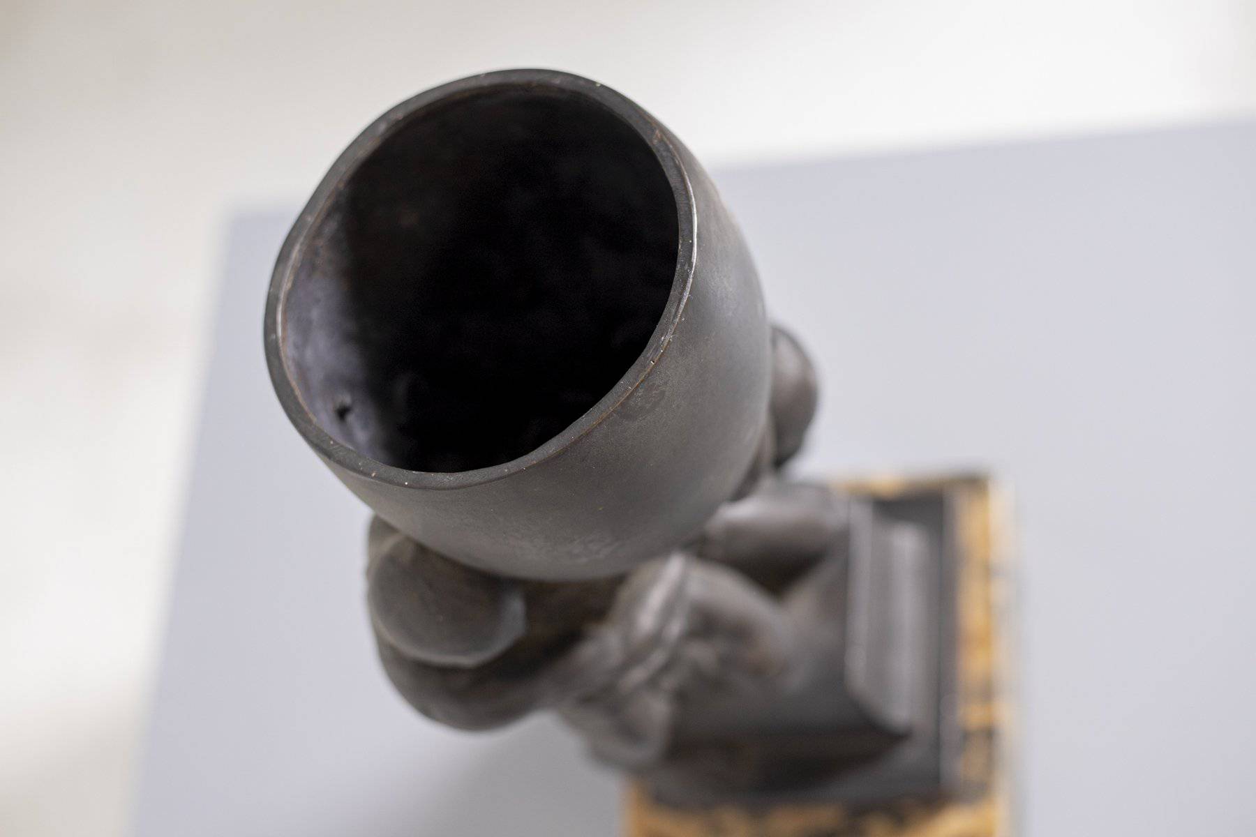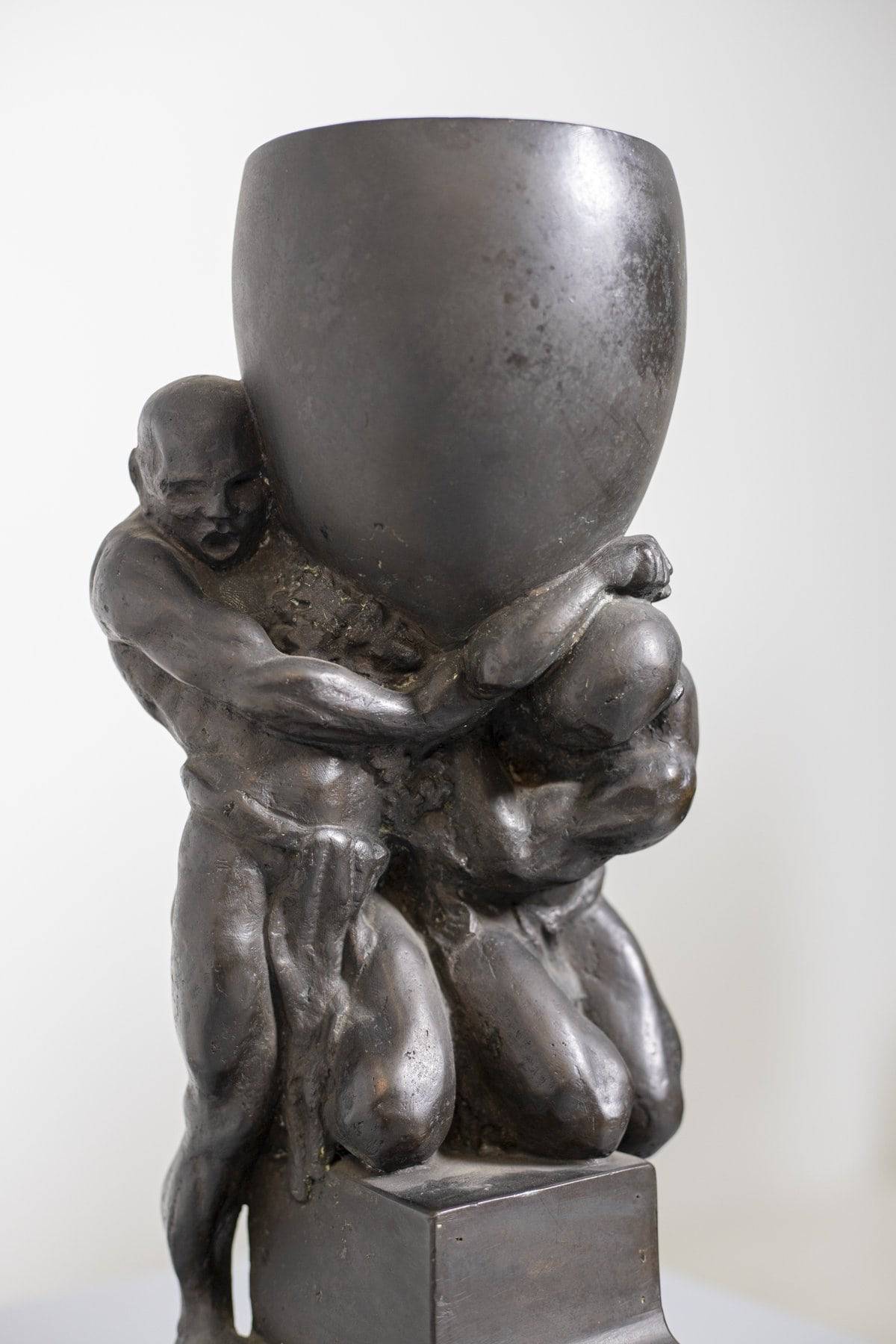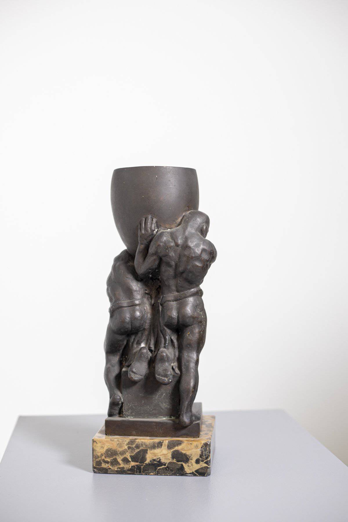 ADOLFO WILDT (Attr.) (Milano, 1868-1931). Scultura in bronzo raff. ''DUE UOMINI CHE SORREGGO UN MASSO''. Base in marmo. Mis. Lung. cm. 17 Alt. cm. 43 Prof. cm. 17 ca.
