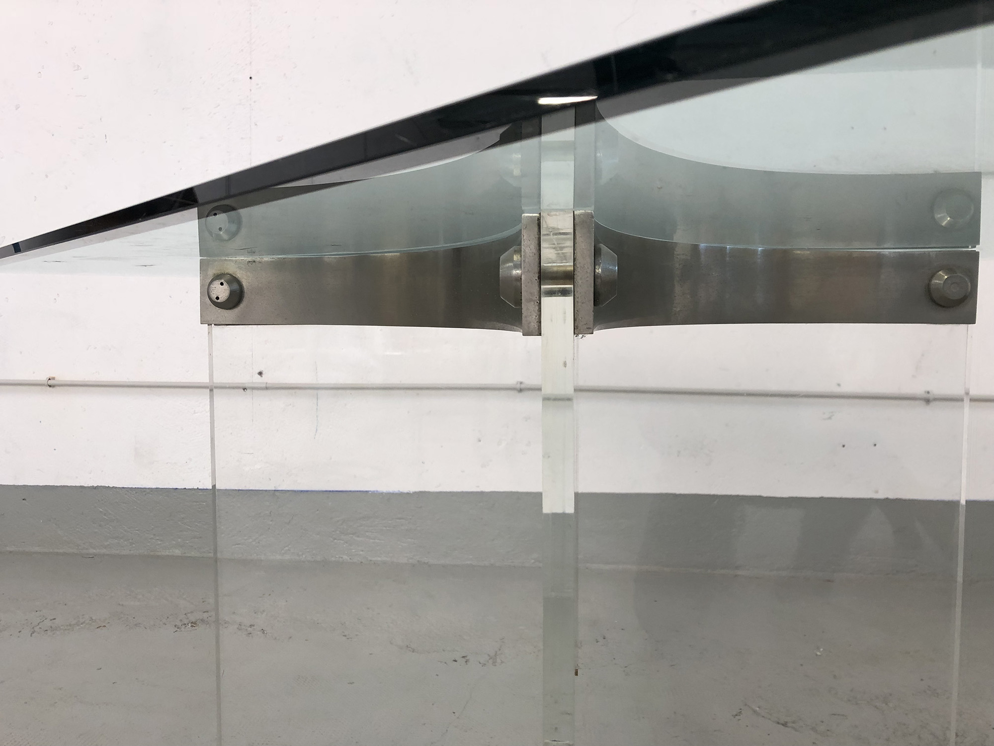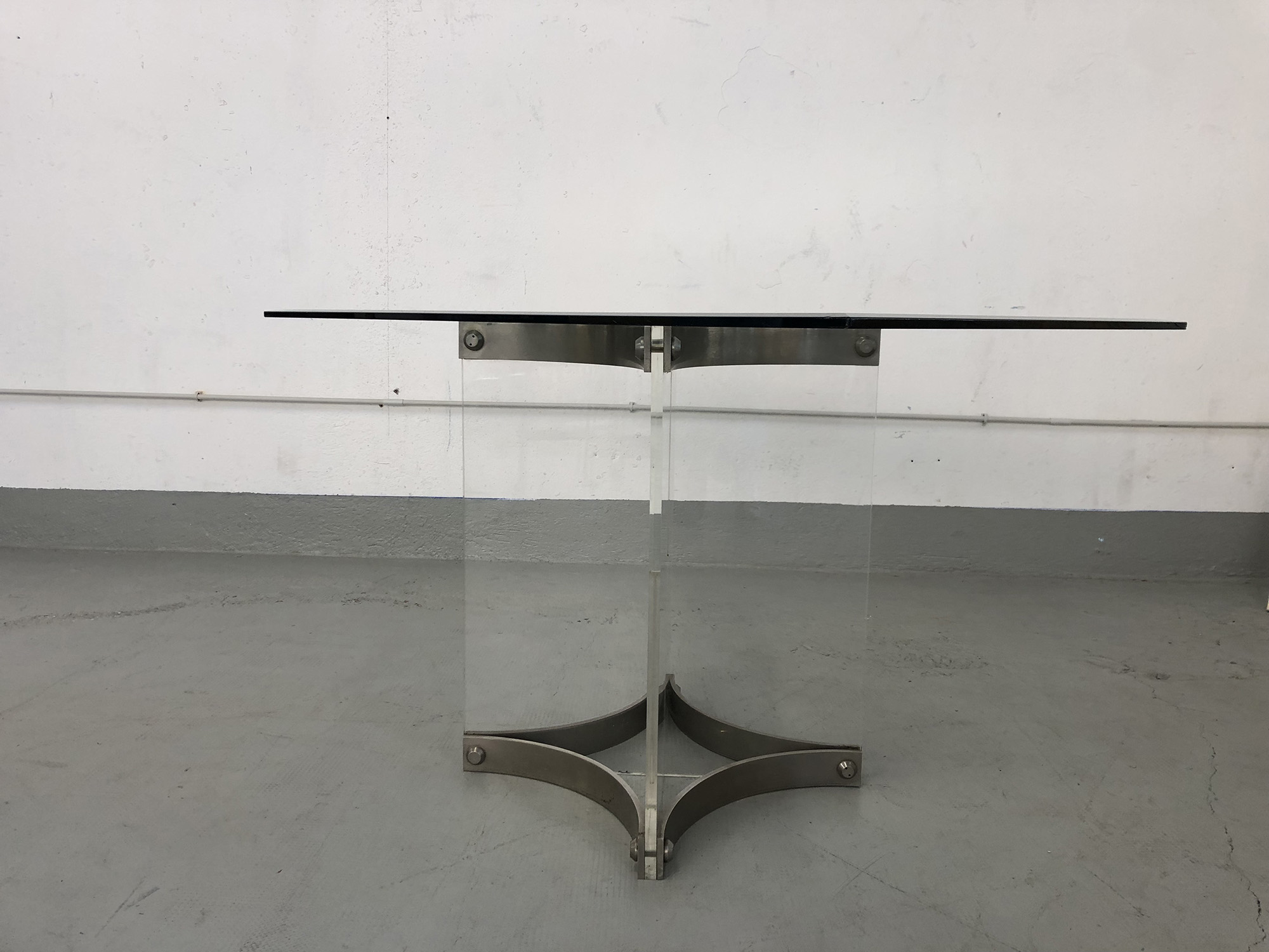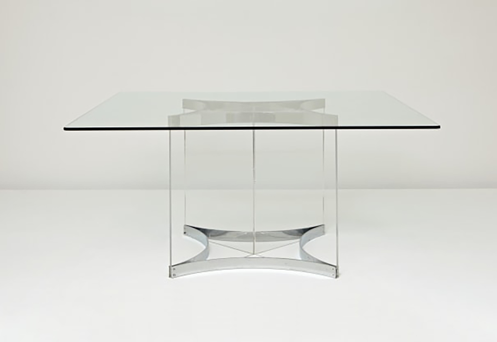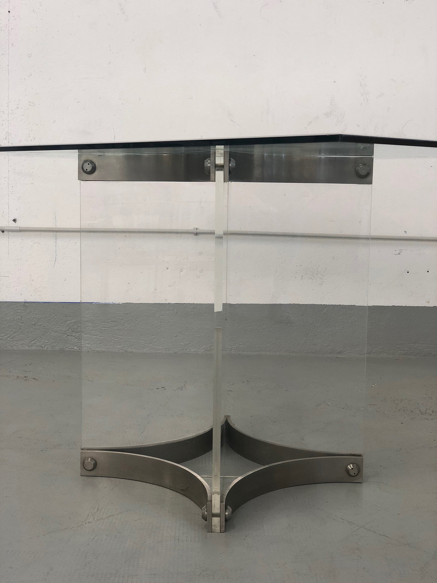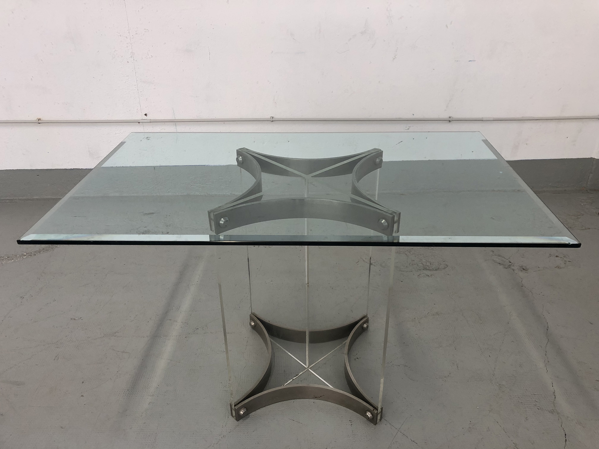 ALESSANDRO ALBRIZZI. Tavolo da pranzo in perspex, vetro e acciaio. Anni '70. Mis. Lung. cm. 152.4 Alt. cm. 71.8 Prof. cm. 152.4 ca.
