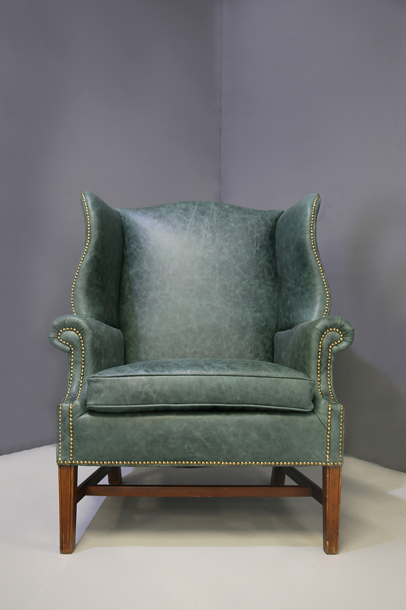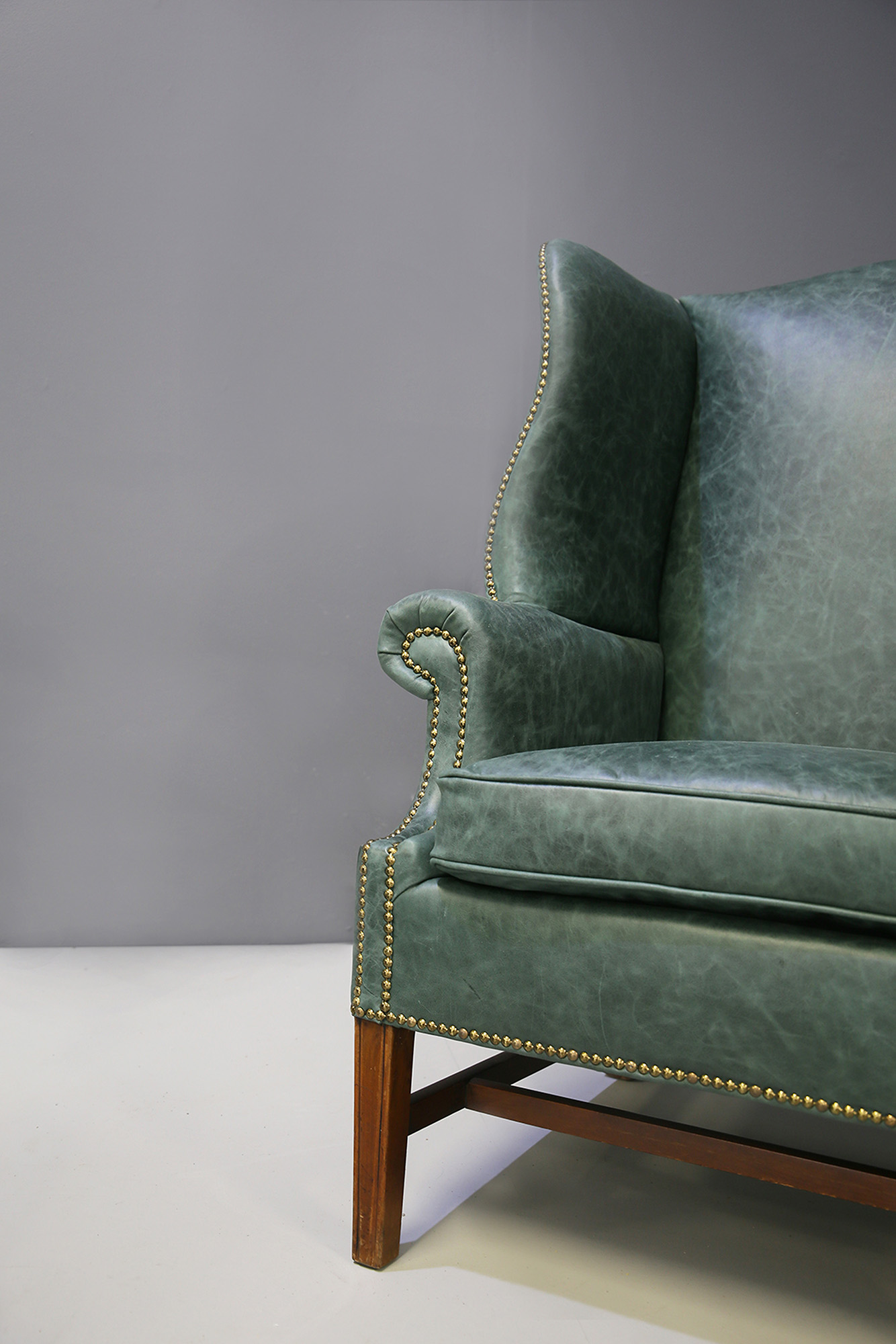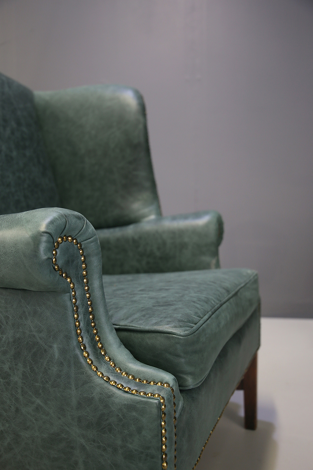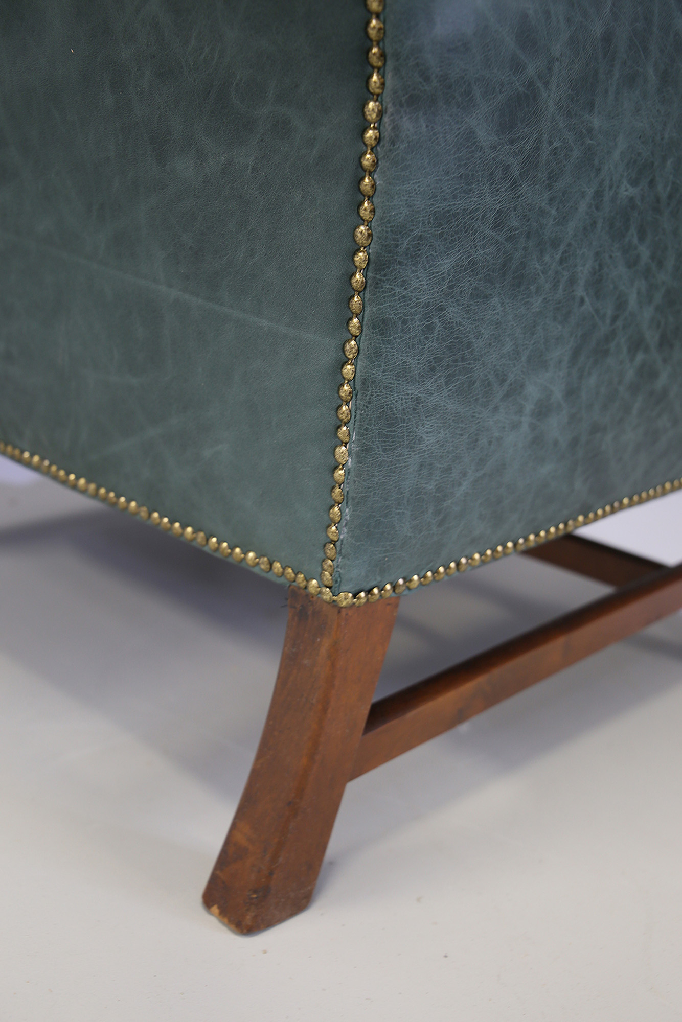 PETER HVIDT (1916 - 1986) & ORLA MOLGAARD-NIELSEN(Aalborg, 1907 -1993). Coppia di poltrone in pelle verde con chiodi in ottone. Anni '40. Mis. Lung. cm. 47 Alt. cm. 80 Prof. cm. 40 ca.