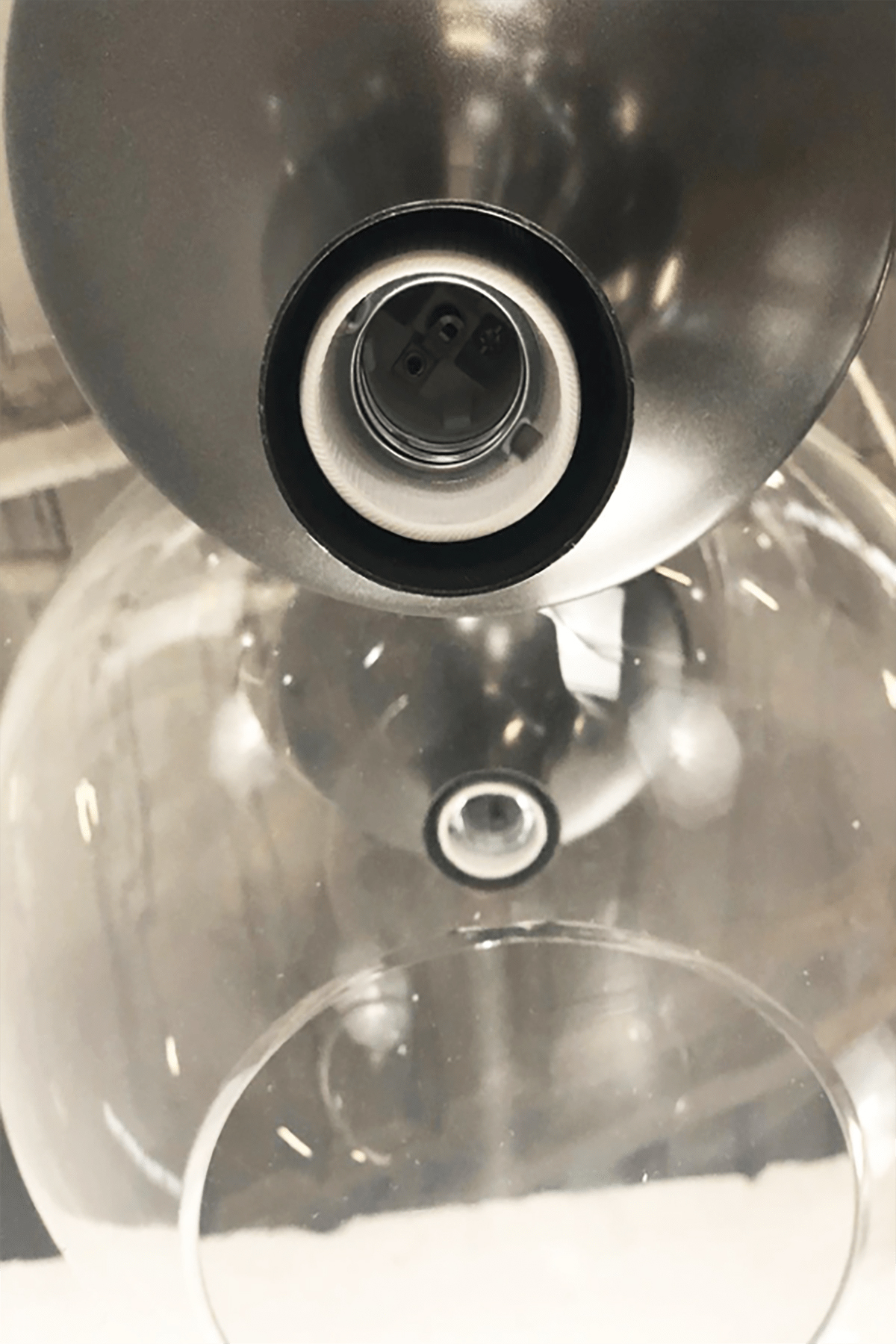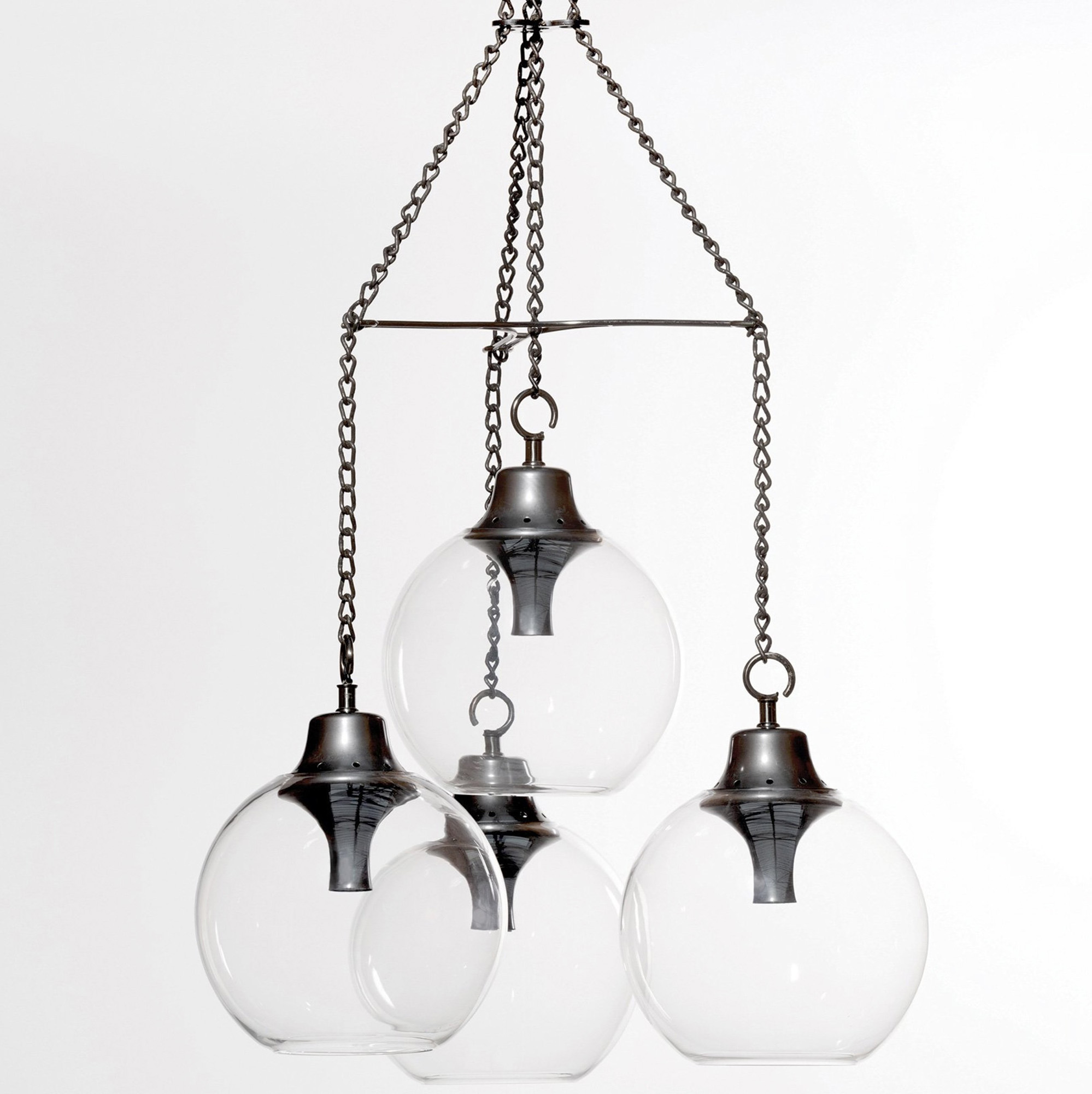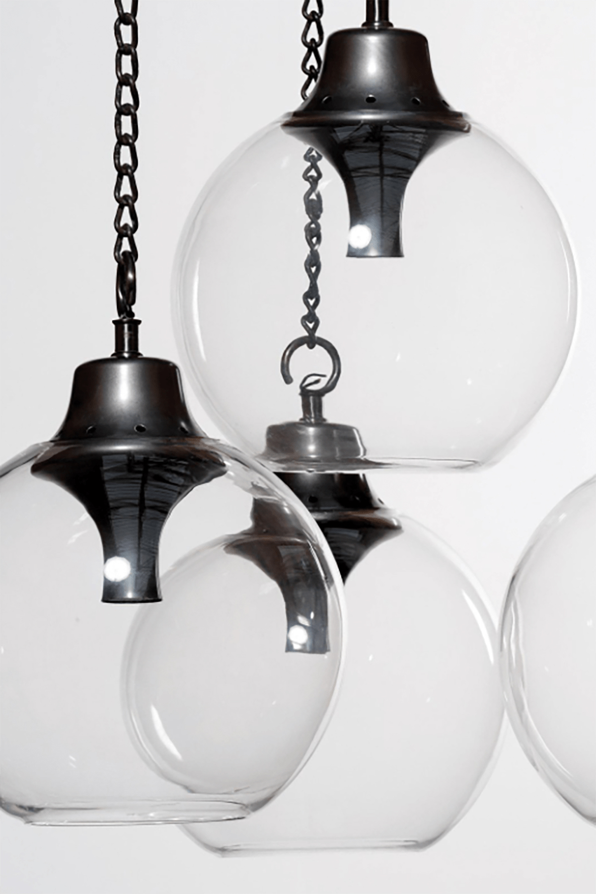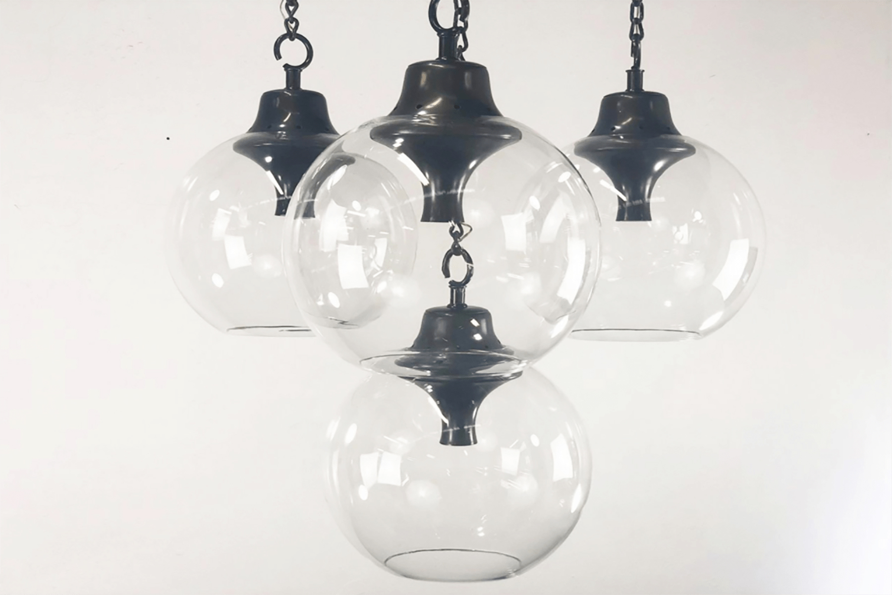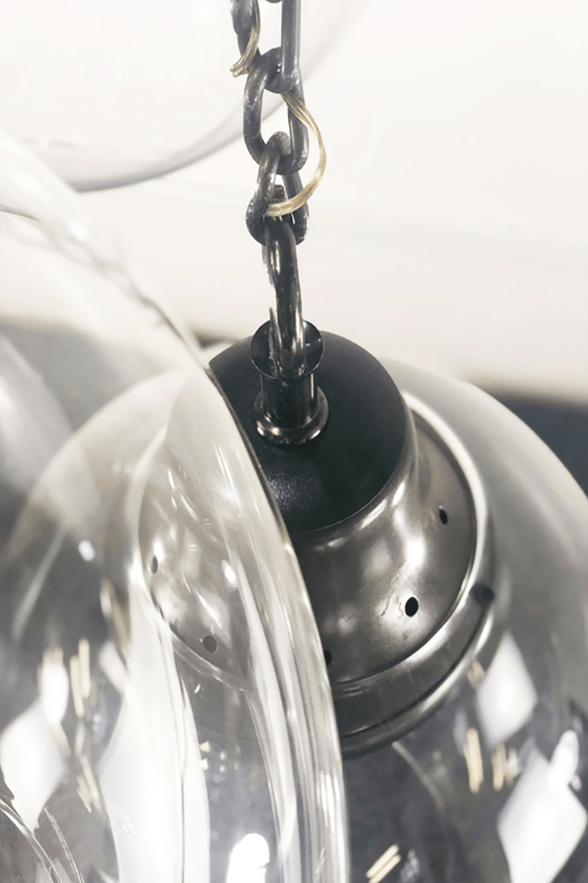 LUIGI CACCIA DOMINIONI (Milano, 1913-2016) per AZUCENA. Lampadario Grappolo LS10 quattro luci in ottone brunito e alluminio e sfere in vetro soffiato. 1967. Esposto alla Biennale di Venezia nel 2018 per l'installazione ''Meraviglie Quotidiane'' curata da Cino Zucchi. Mis. Lung. cm. 90 Alt. cm. 250 Prof. cm. 90 ca.