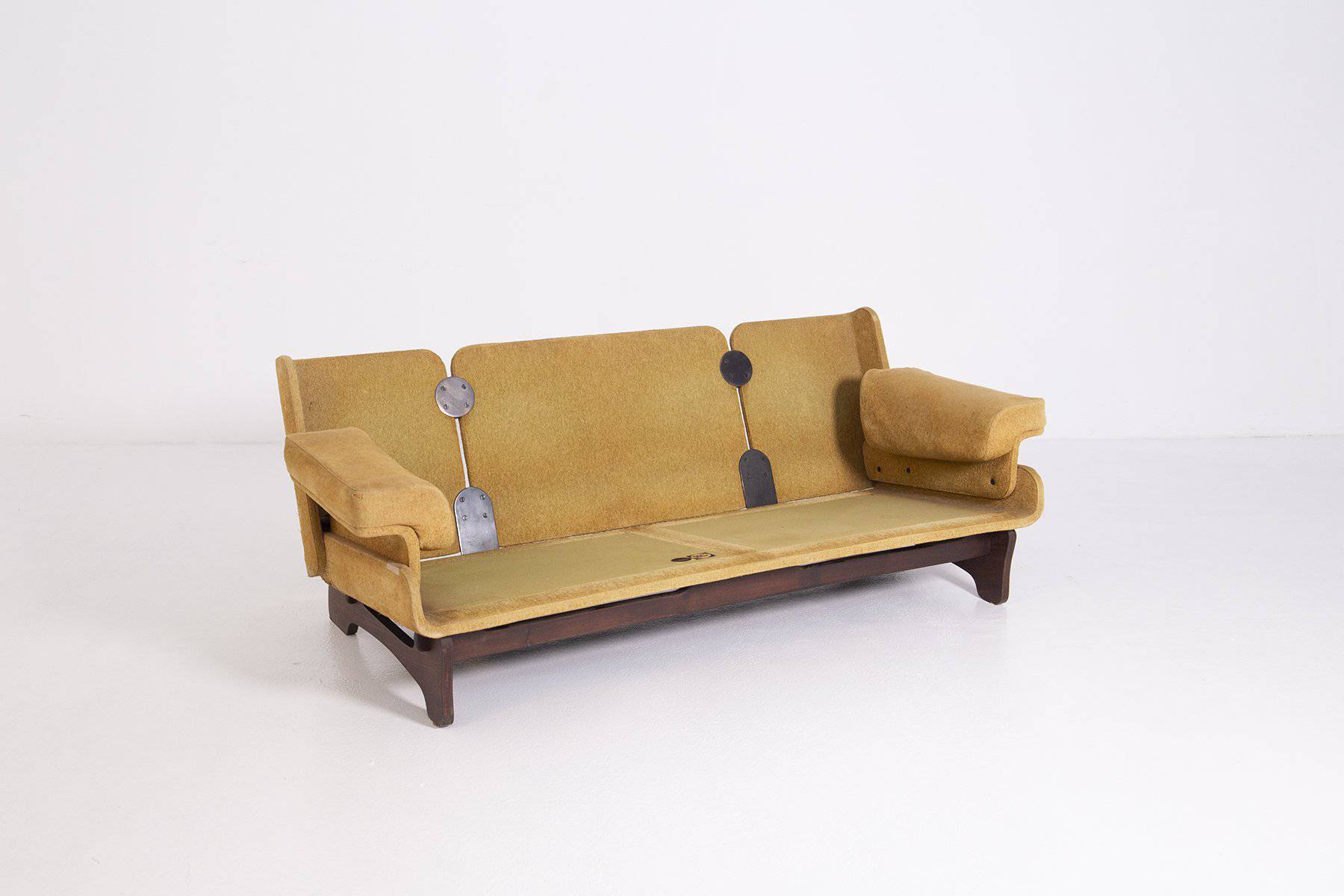 Divano due posti in tessuto color ocra, ottone e struttura in legno. Produzione G. ROSSI DI ALBIZZATE. Con etichetta del produttore. Anni '60 Mis. Lung. cm. 178 Alt. cm. 66 Prof. cm. 94 ca.