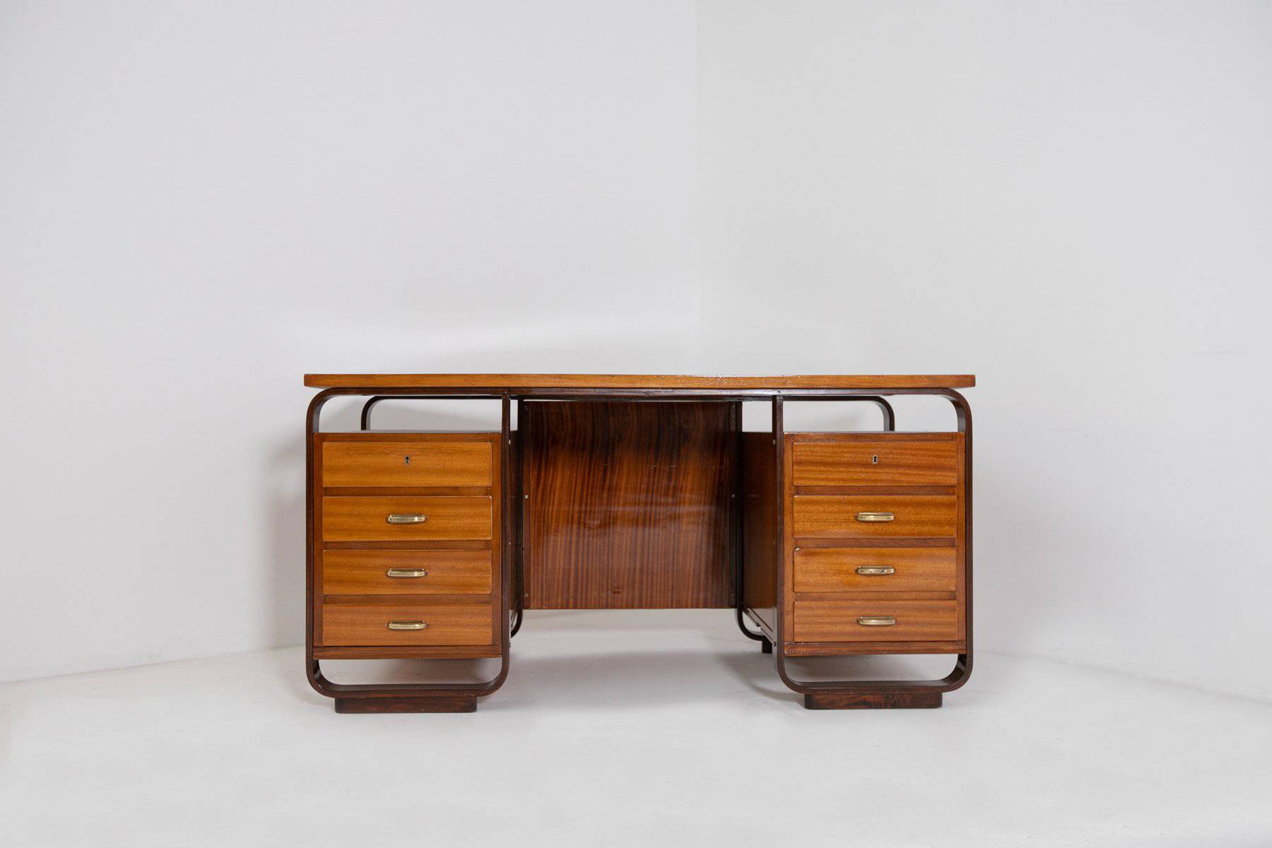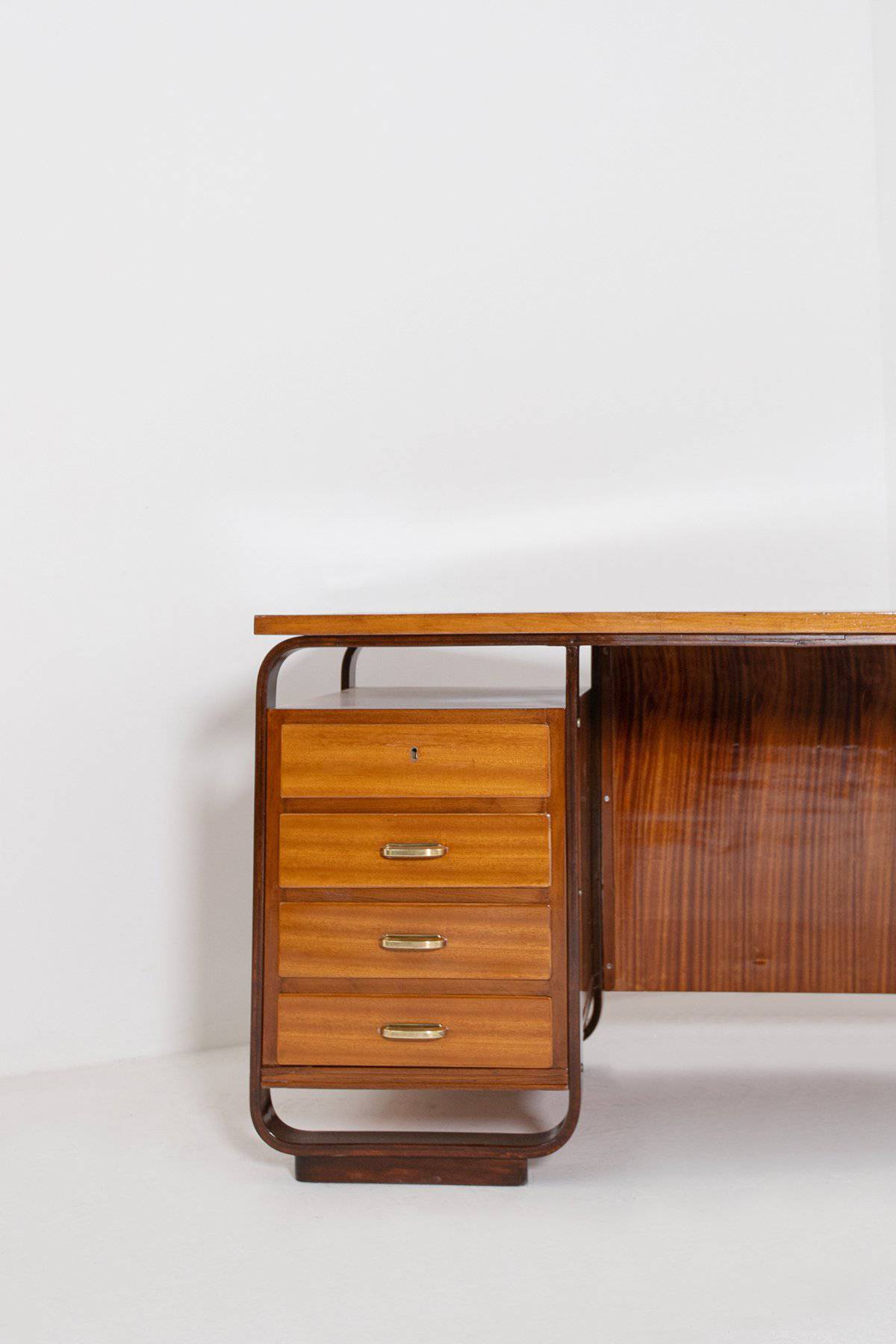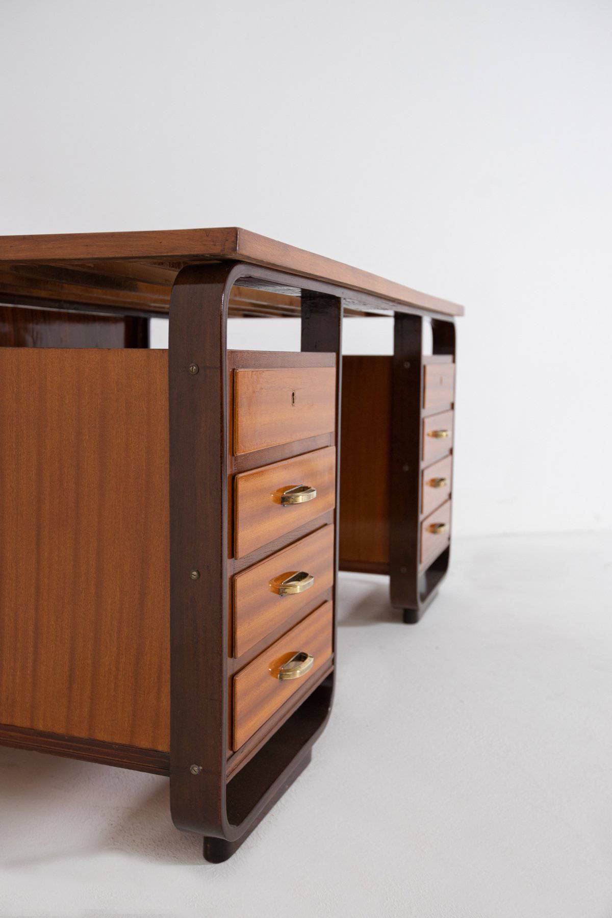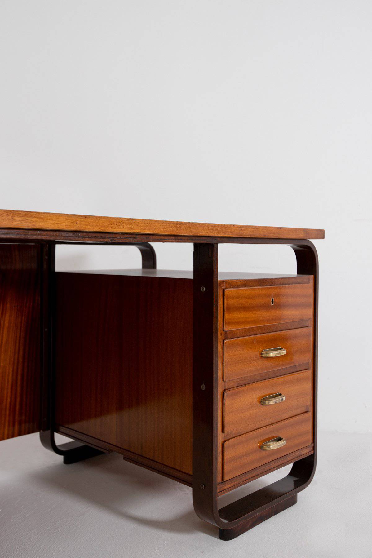 GIUSEPPE PAGANO (Parenzo, 1896 - Austria, 1945). Scrivania in legno con maniglie in ottone. Disegnata per l'Università Bocconi, Esecuzione Maggioni, Varedo. 1940. Mis. Lung. cm. 150 Alt. cm. 79 Prof. cm. 79 ca.