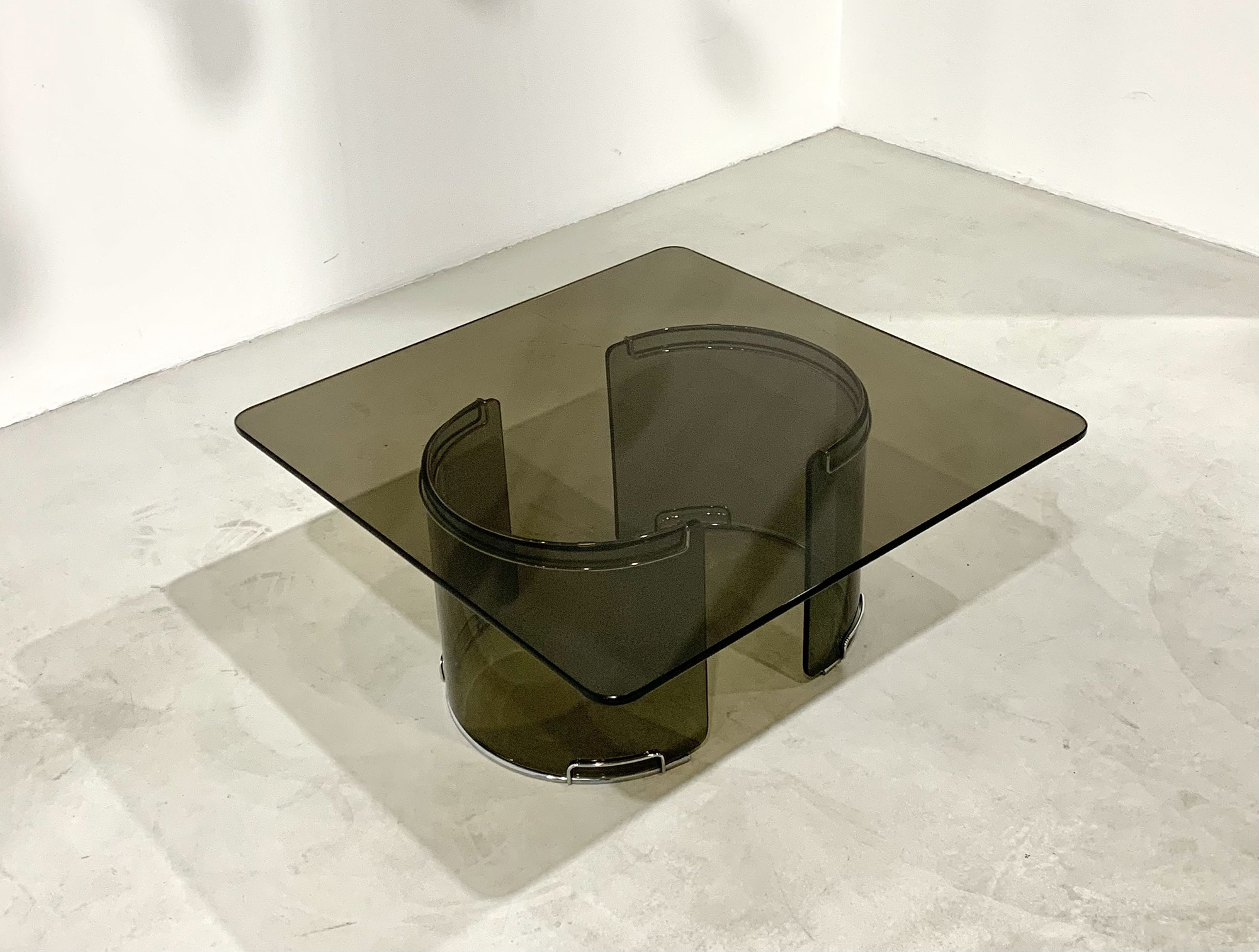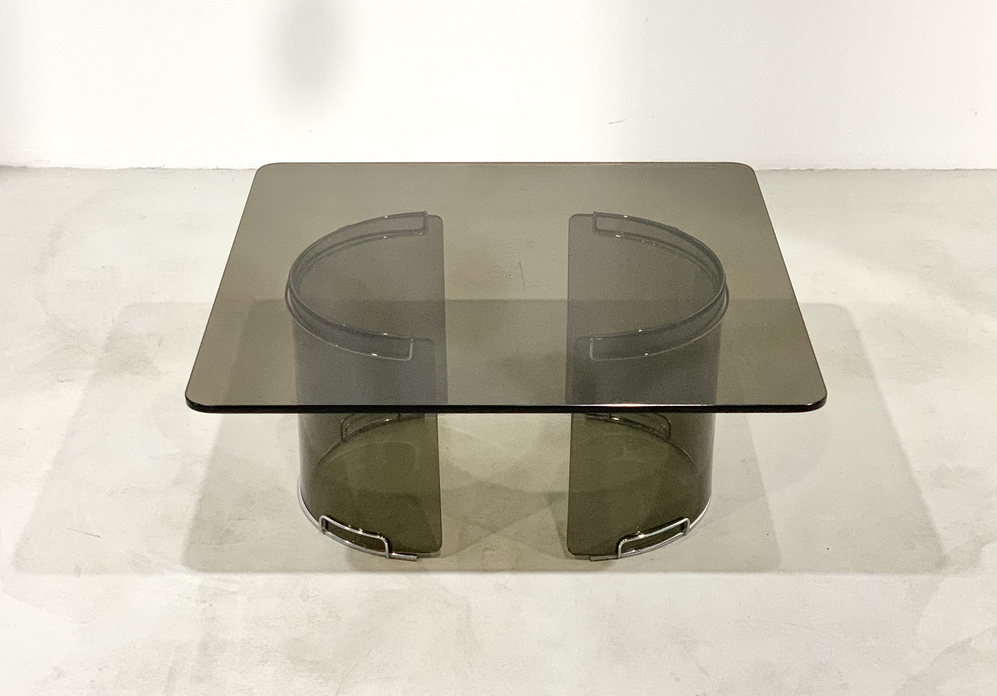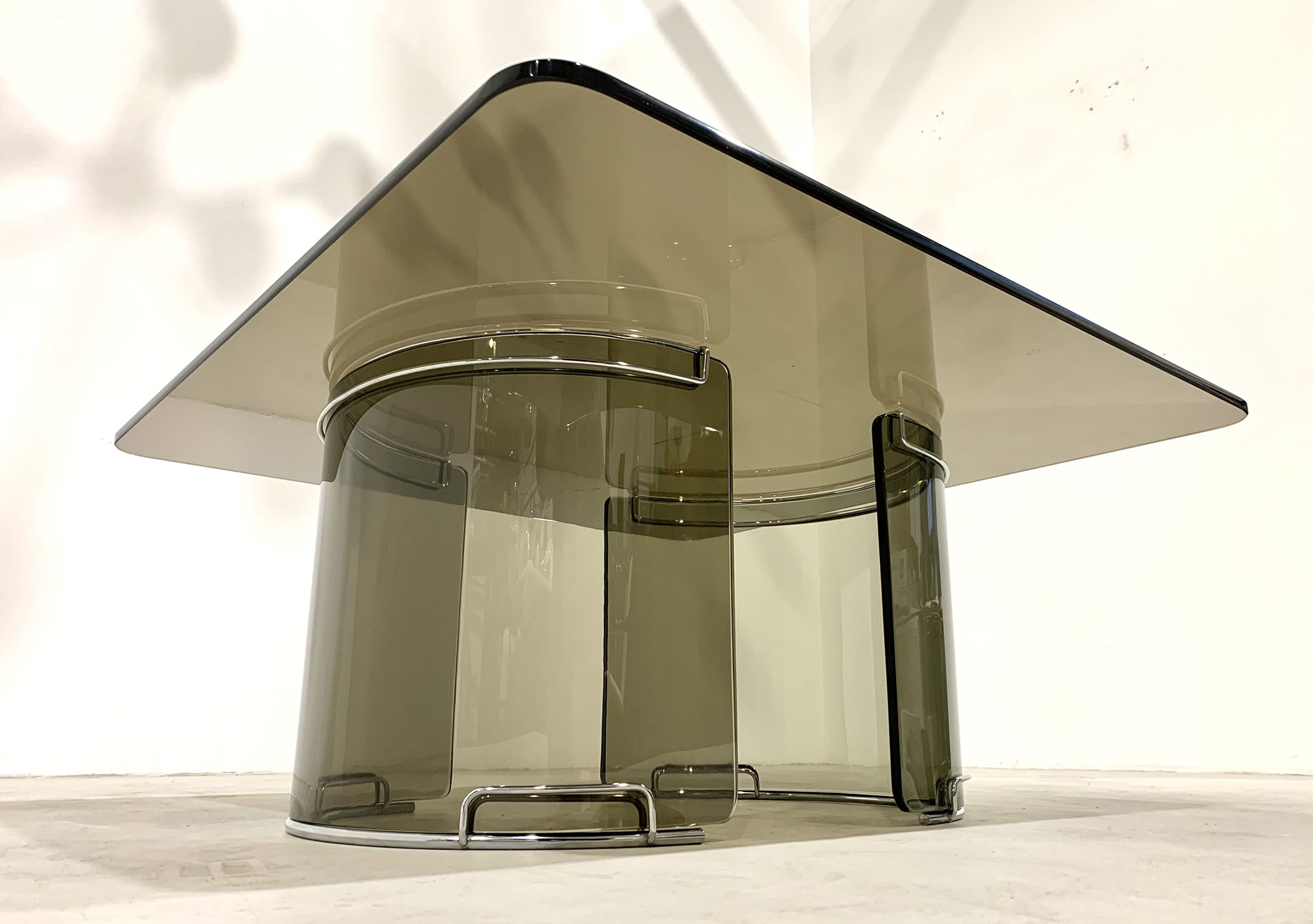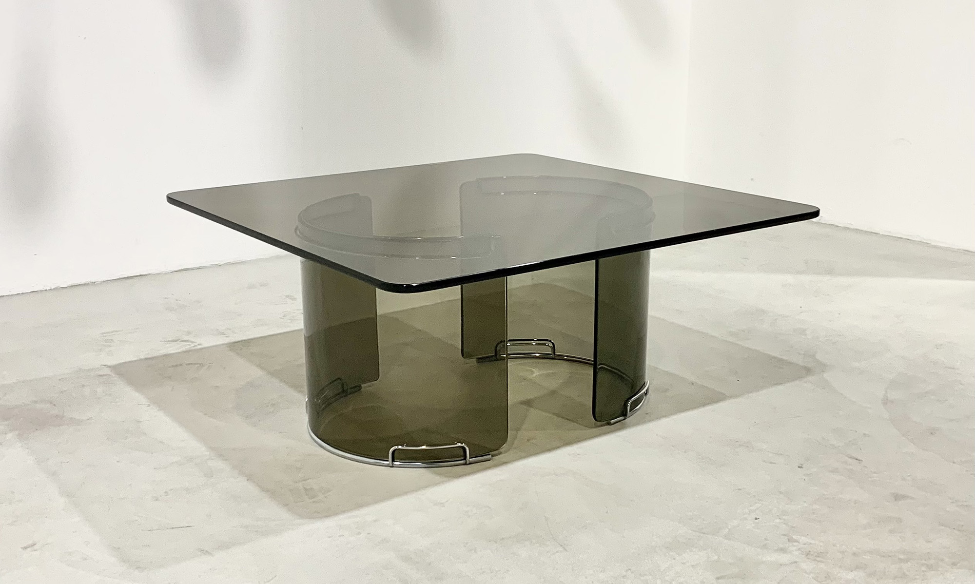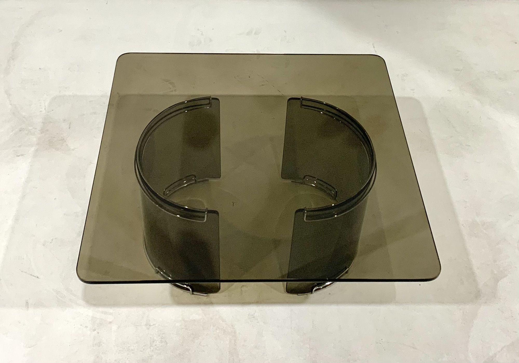 Tavolino quadrato in vetro fumè e metallo cromato. Produzione GALLOTTI&RADICE. Anni '70 Mis. Lung. cm. 80 Alt. cm. 37 Prof. cm. 80 ca.