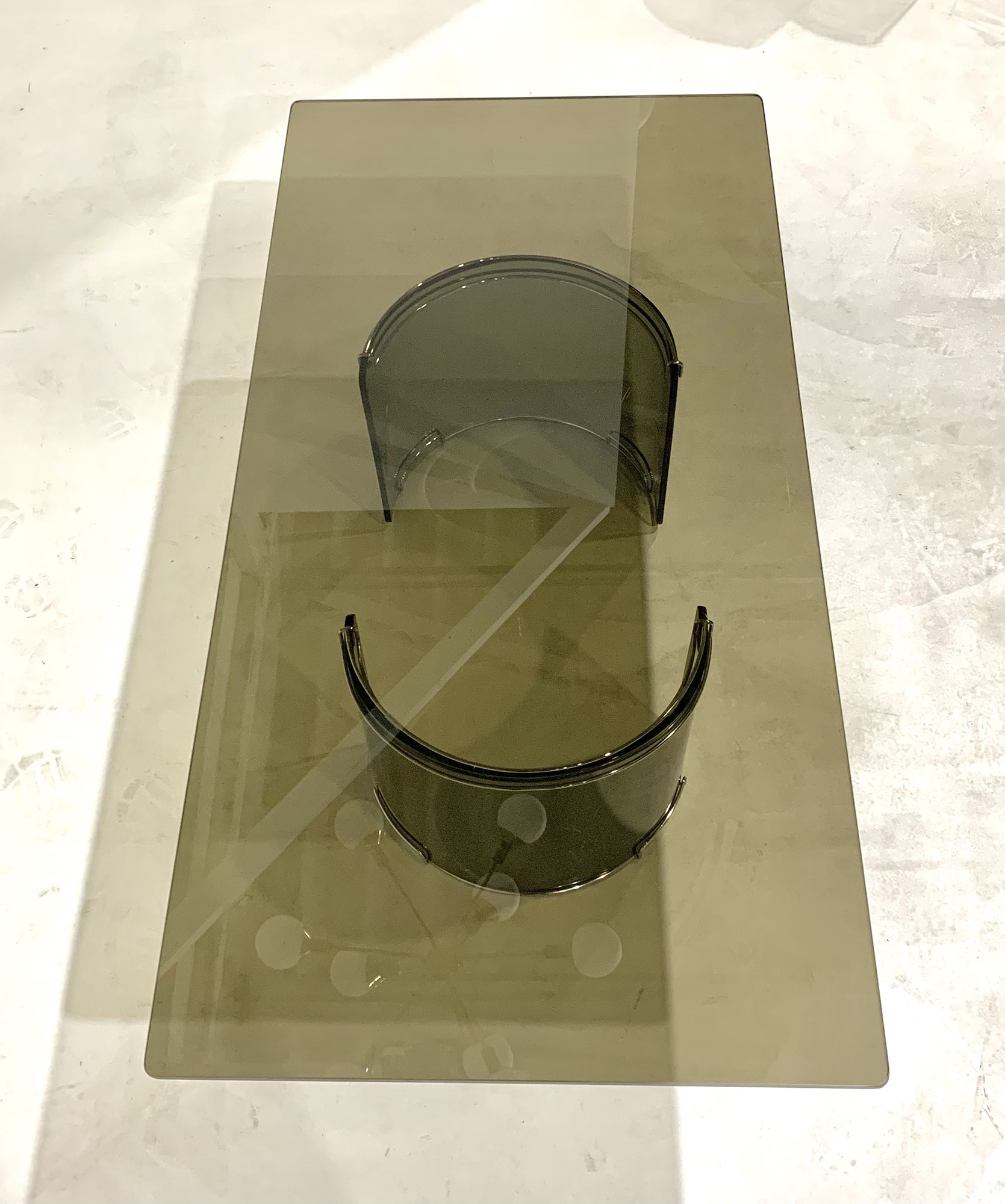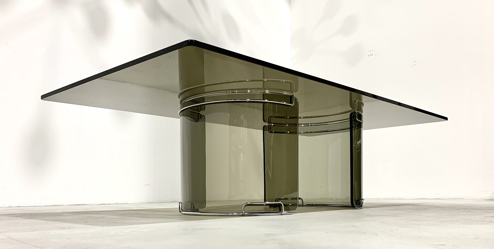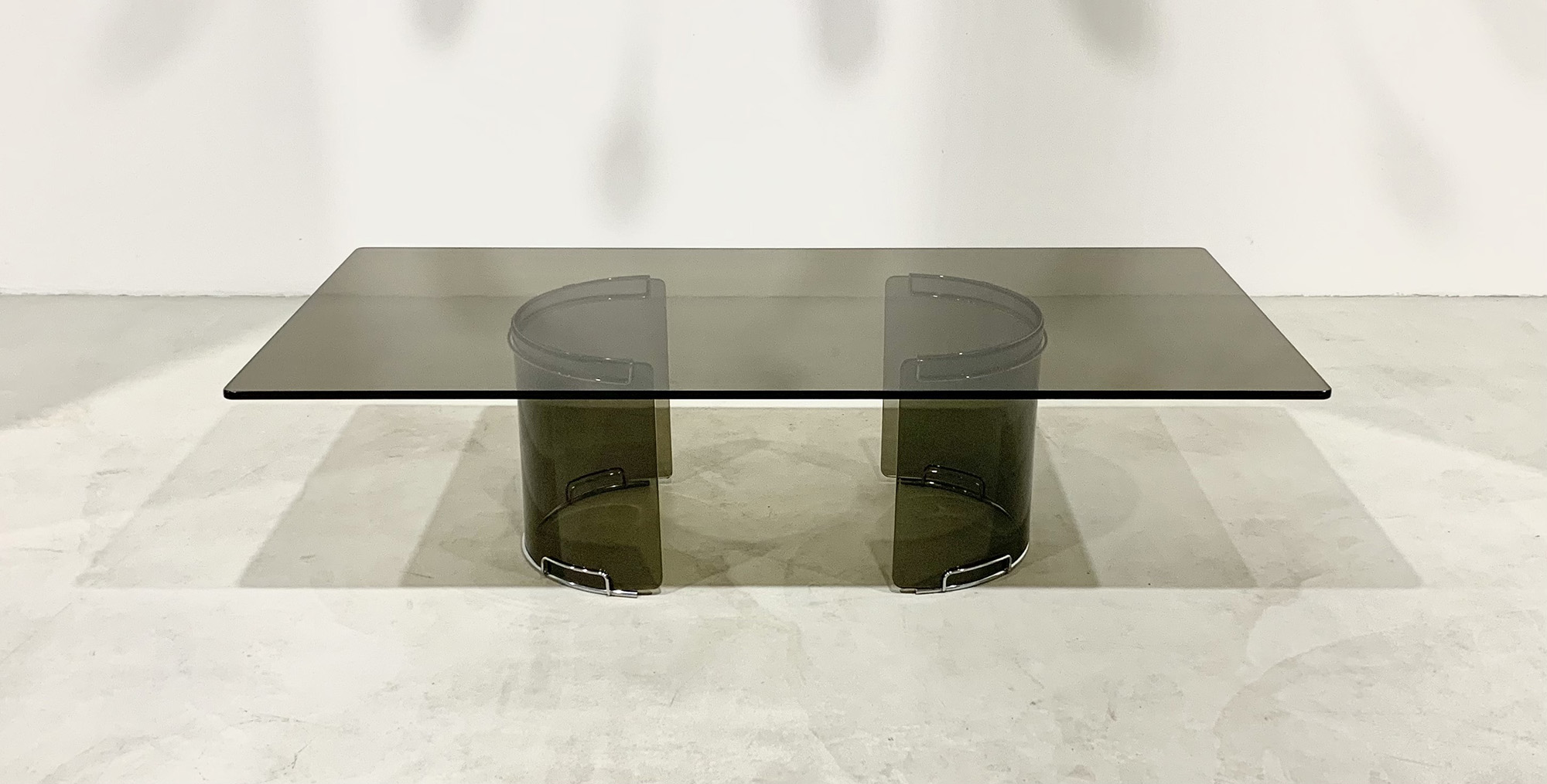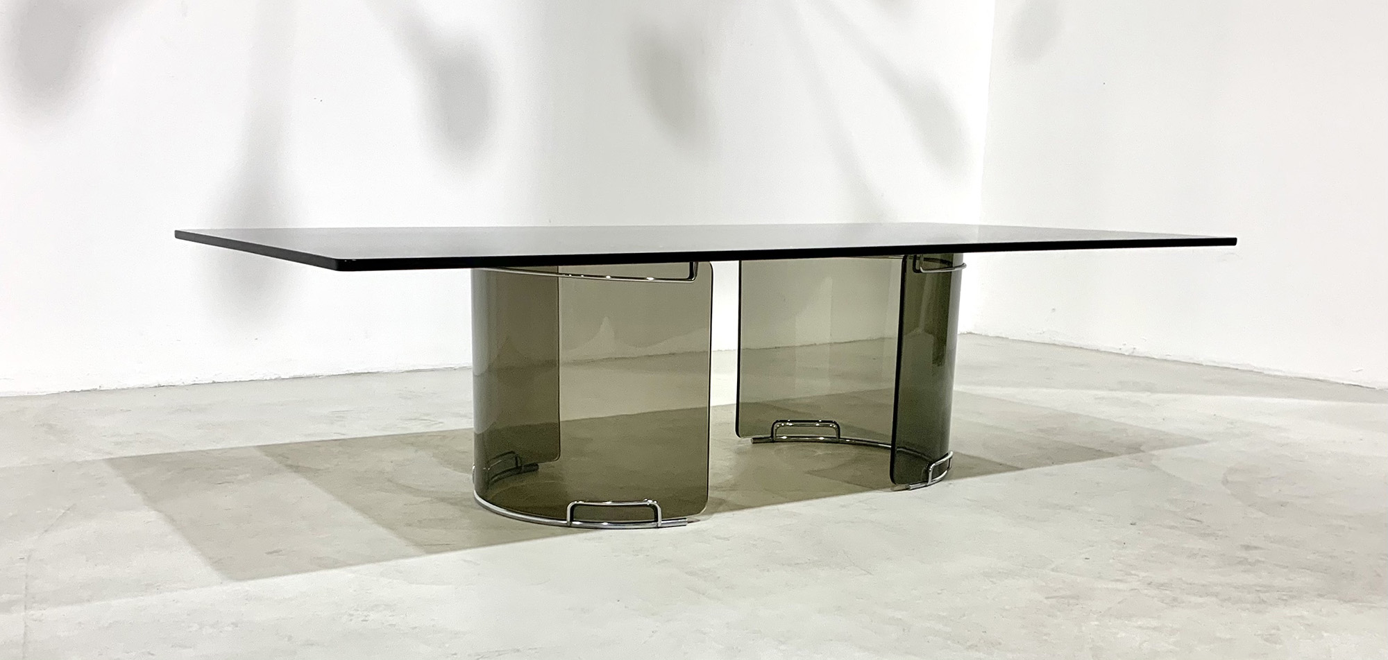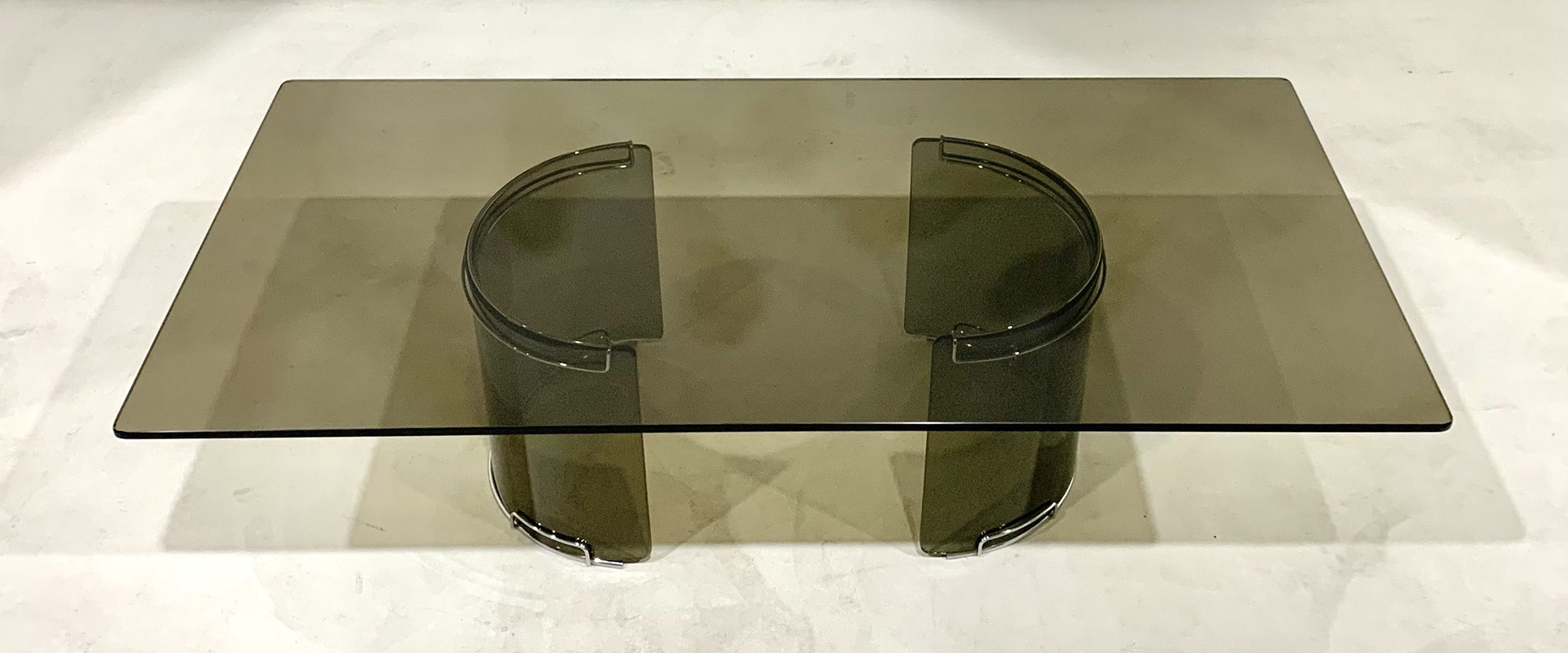 Tavolino rettangolare in vetro fumè e metallo cromato. Produzione GALLOTTI&RADICE. Anni '70 Mis. Lung. cm. 140 Alt. cm. 37 Prof. cm. 70 ca.