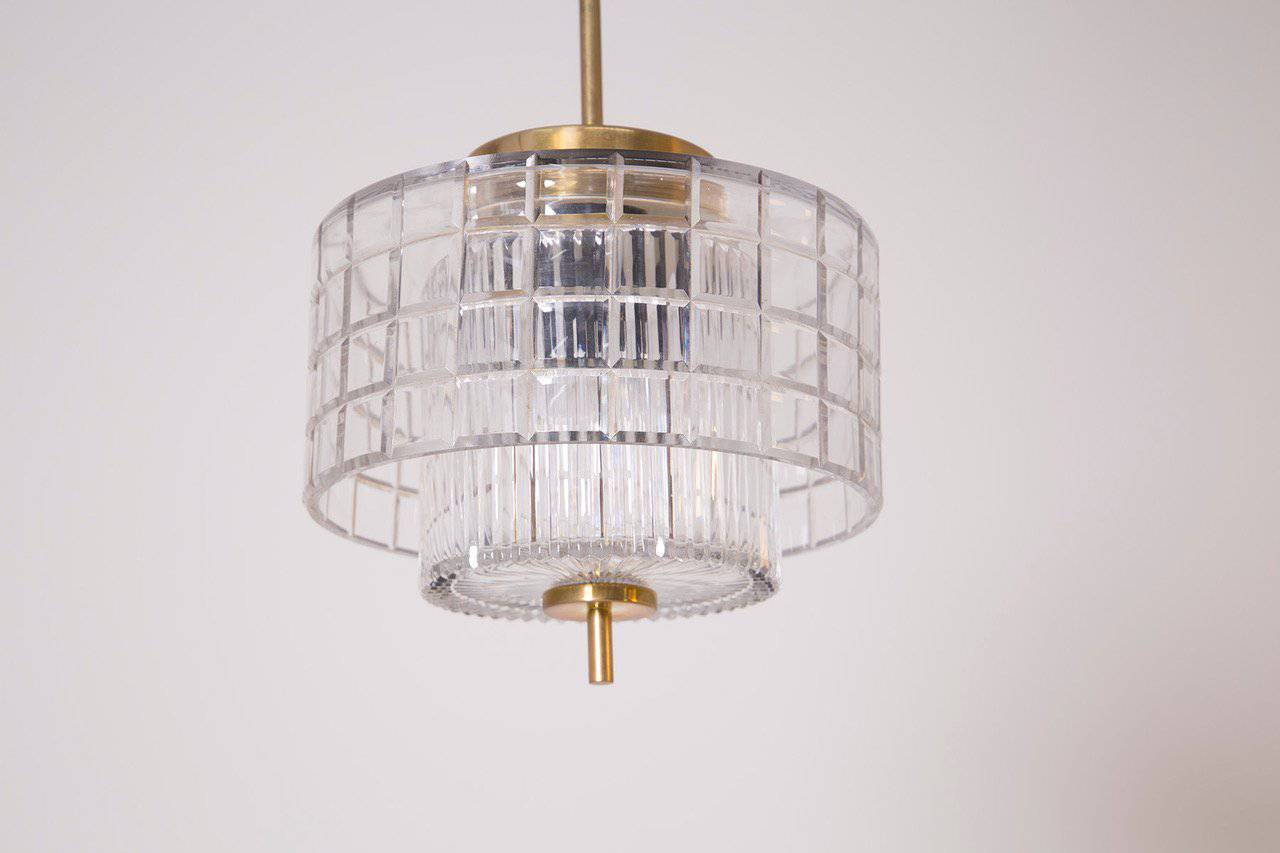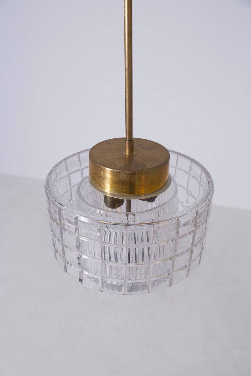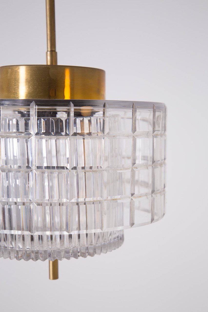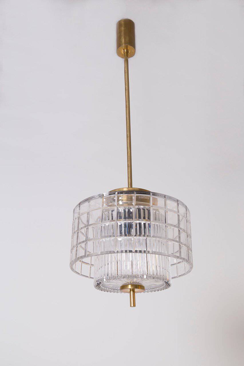 Lampadario in ottone e cristallo di Boemia. Manifattura italiana. Anni '60. Mis. Alt. cm. 95 Diam. cm. 32 ca.