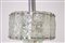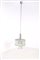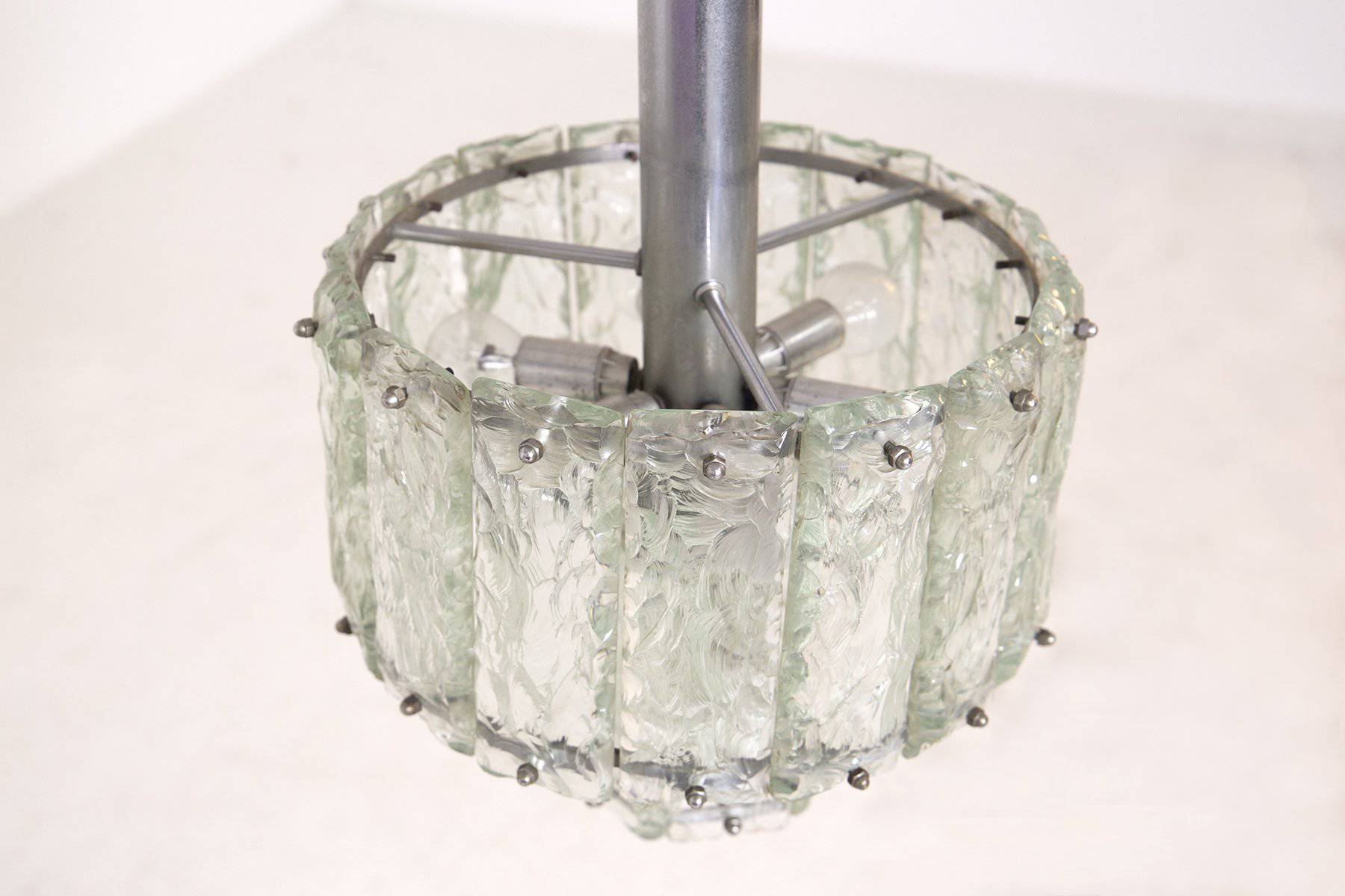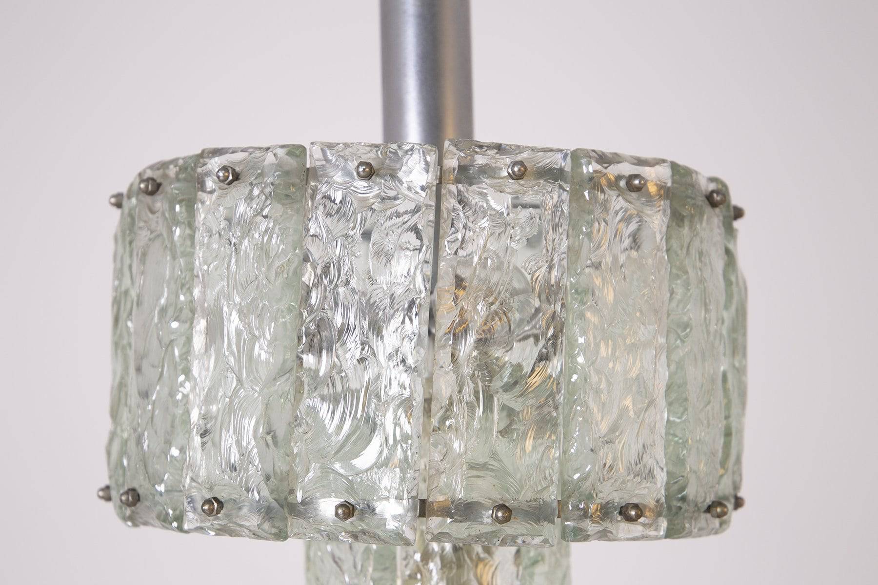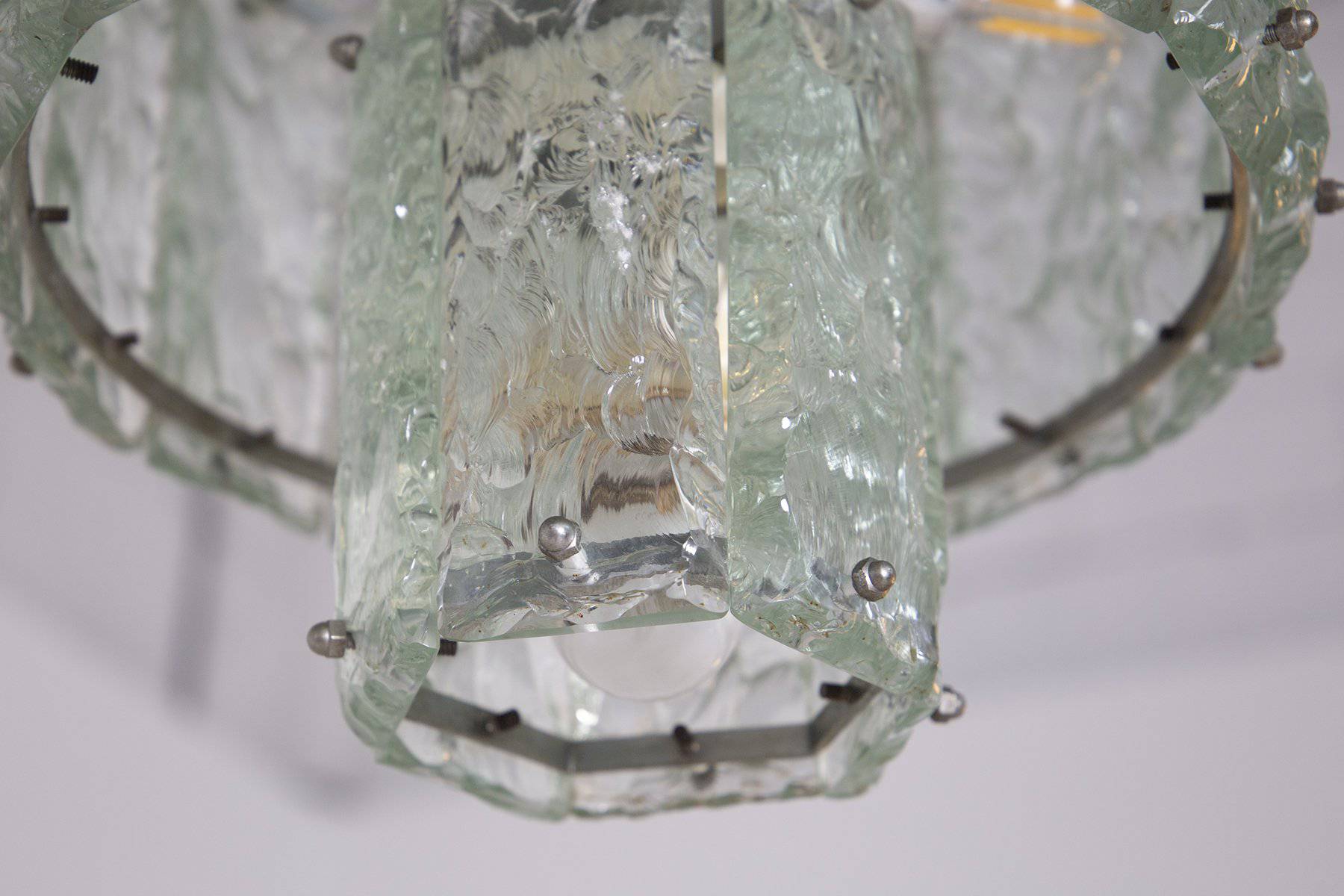 Lampadario sette luci a sospensione in ottone nichelato e vetro martellato. Anni '60. Mis. Lung. cm. 32 Alt. cm. 145 Prof. cm. 32 ca.