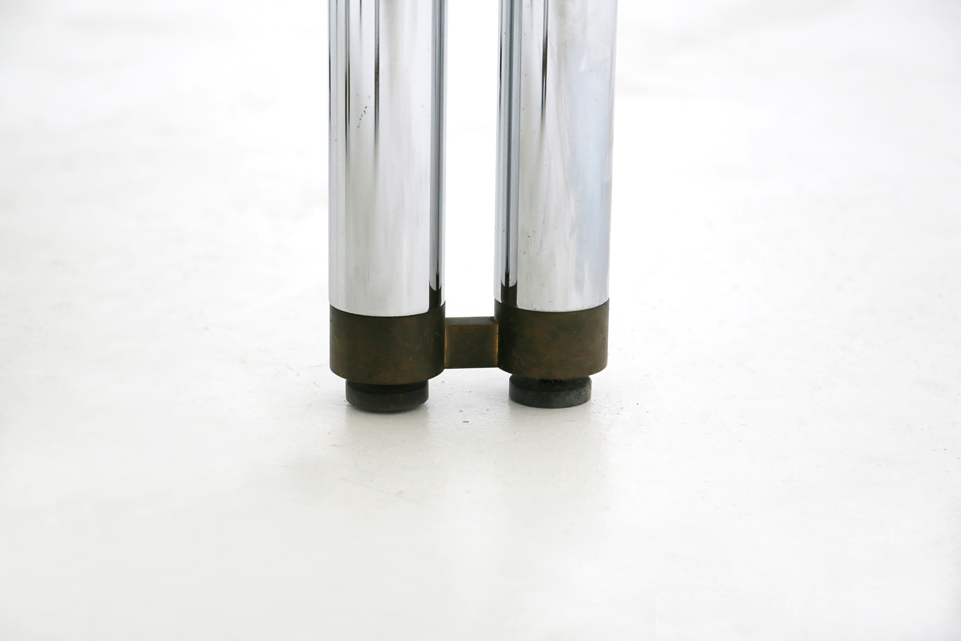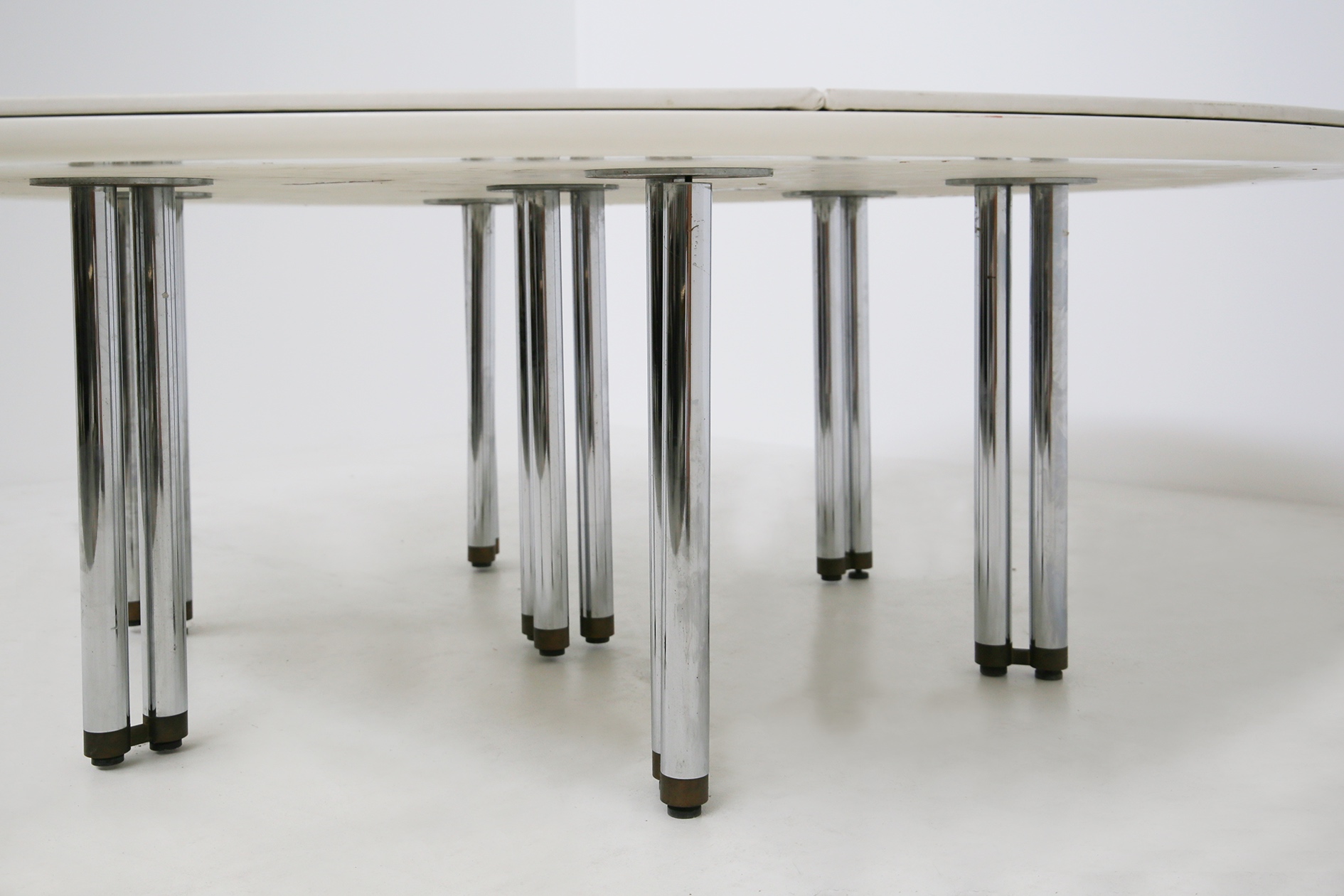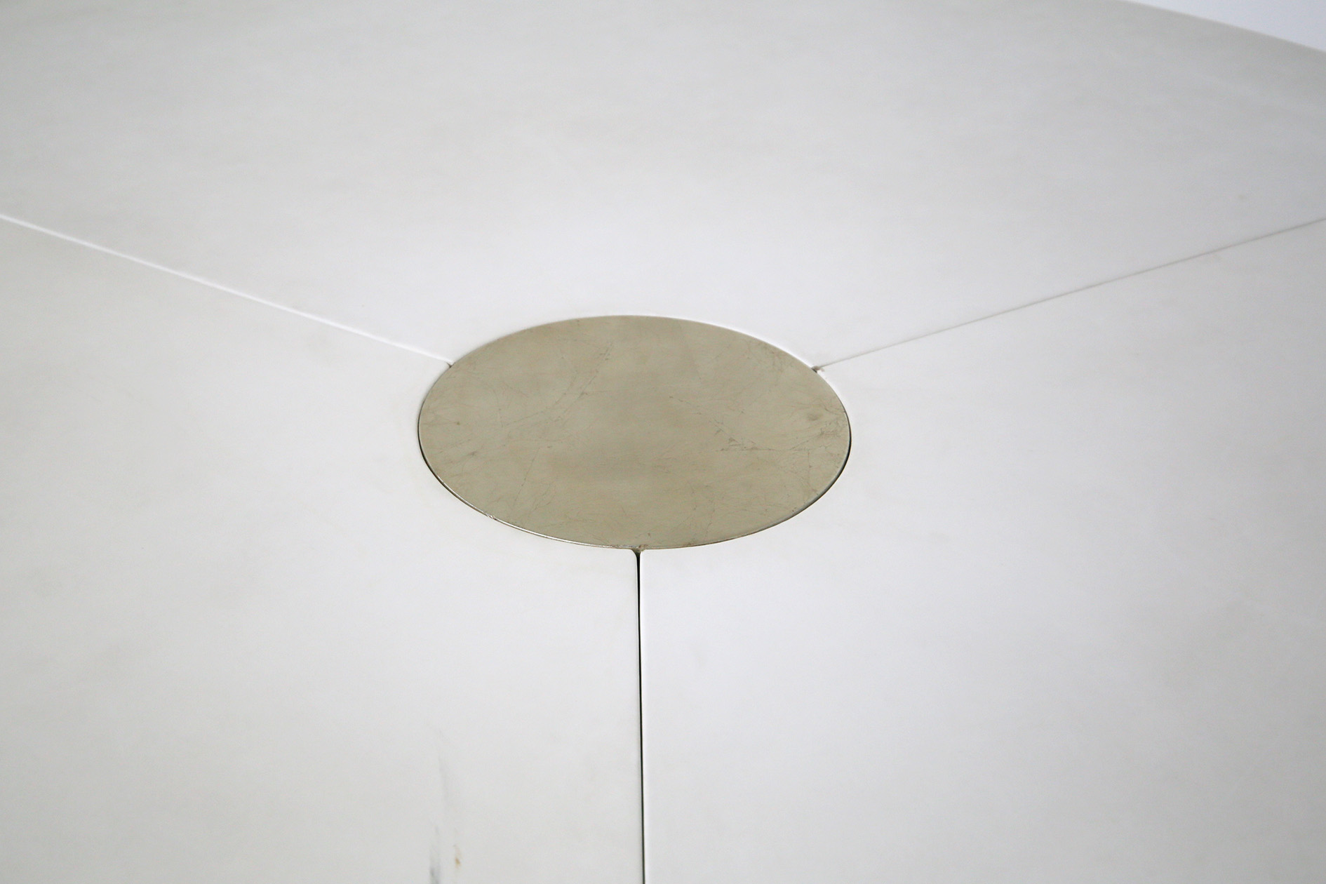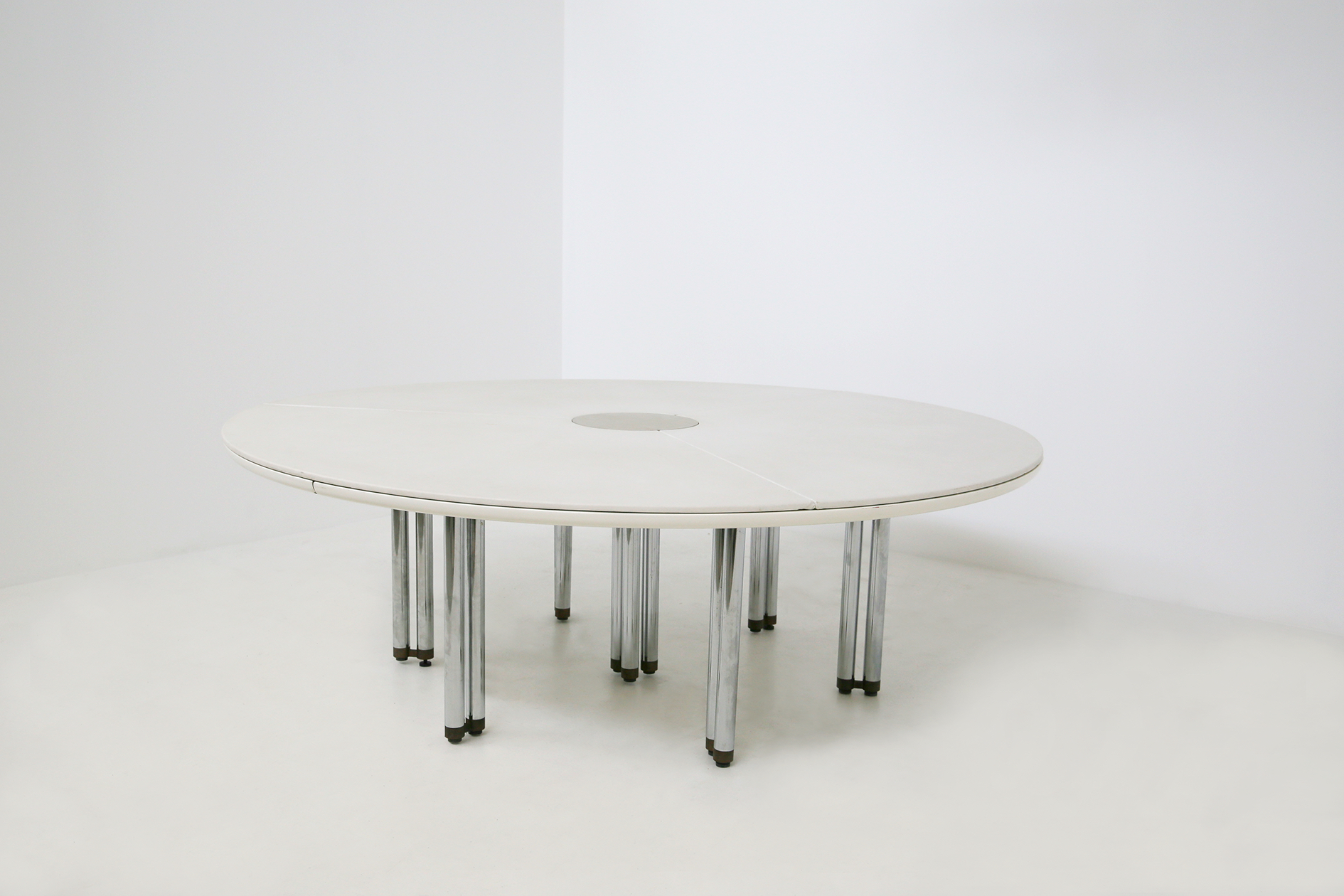 HIROYUKI TOYODA per SIMON-ULTRAMOBILE, San Lazzaro di Savena. Grande tavolo da riunione Byzantium in legno, acciaio e piedini in ottone. Piano circolare diviso in tre spicchi rivestiti in pelle bianca con un tondo centrale rivestito in foglia argento. Disegno del 1980, esemplare del 1984. Pubblicato in D. Gavina, Ultrarazionale Ultramobile, a cura di R. Orsini, Ed. Compositori, Bologna 1998, pp. 214-215. Mis. Alt. cm. 74 Diam. cm. 220 ca.