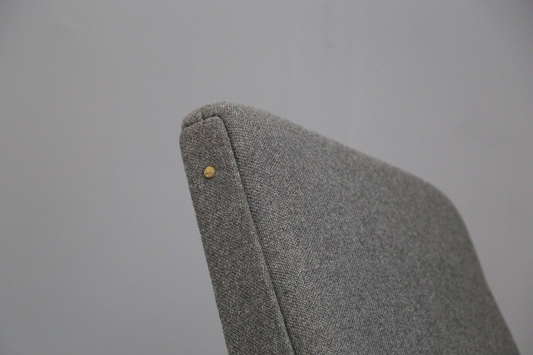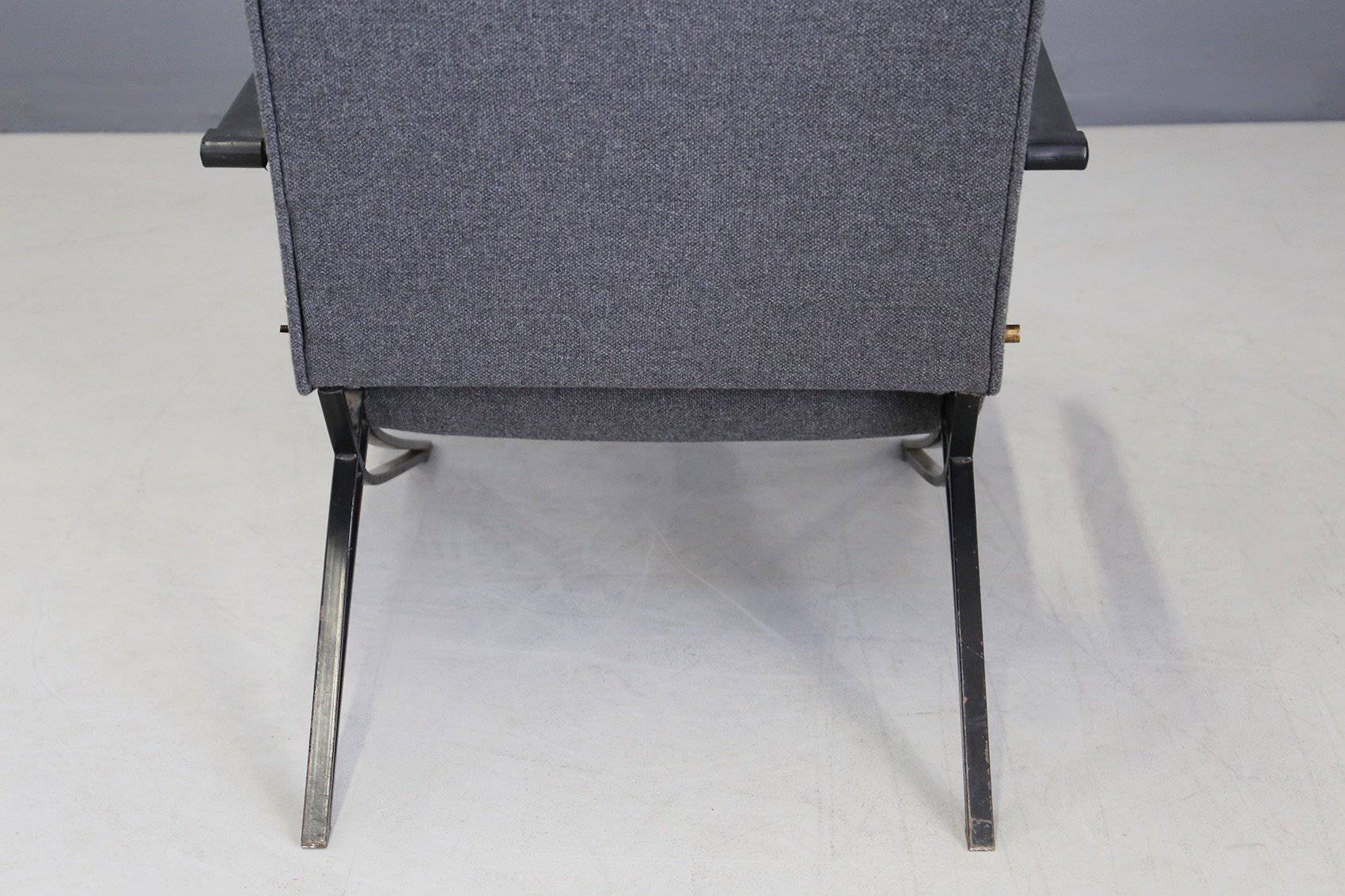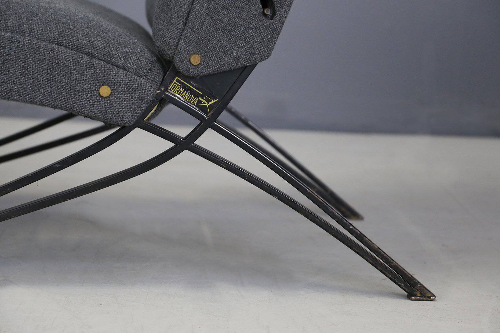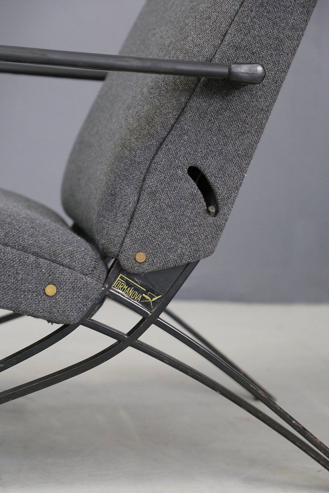 GIULIO MOSCATELLI (1917-1994) per FORMANOVA. Poltrona reclinabile in metallo cromato, bottoni in ottone, imbottitura in schiuma e rivestimento in cotone grigio. Etichetta del produttore. Anni '60. Ottime condizioni originali e meccanismo funzionante. Mis. Lung. cm. 50 Alt. cm. 95 Prof. cm. 75 ca.