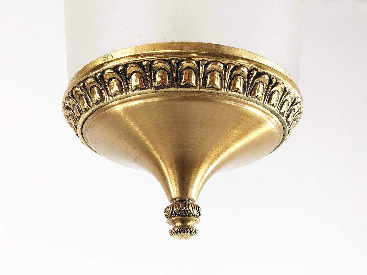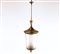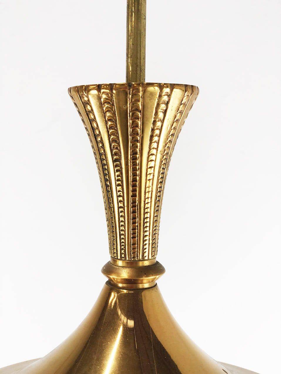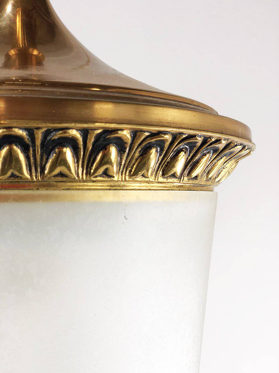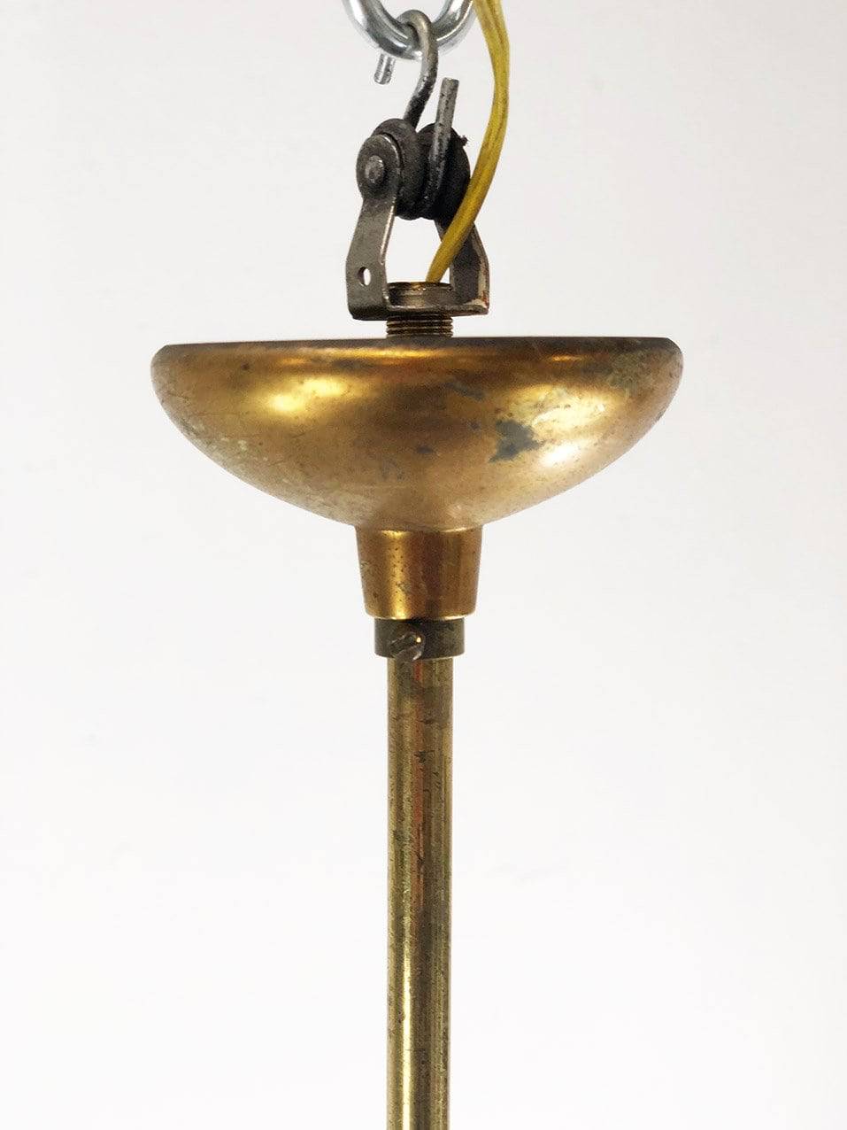OSCAR TORLASCO (Roma, 1934-2004) per LUMI. Lampadario in ottone e vetro opalino. Etichetta del produttore. 1950. Mis. Alt. cm. 90 Diam. cm. 37 ca.