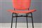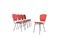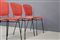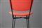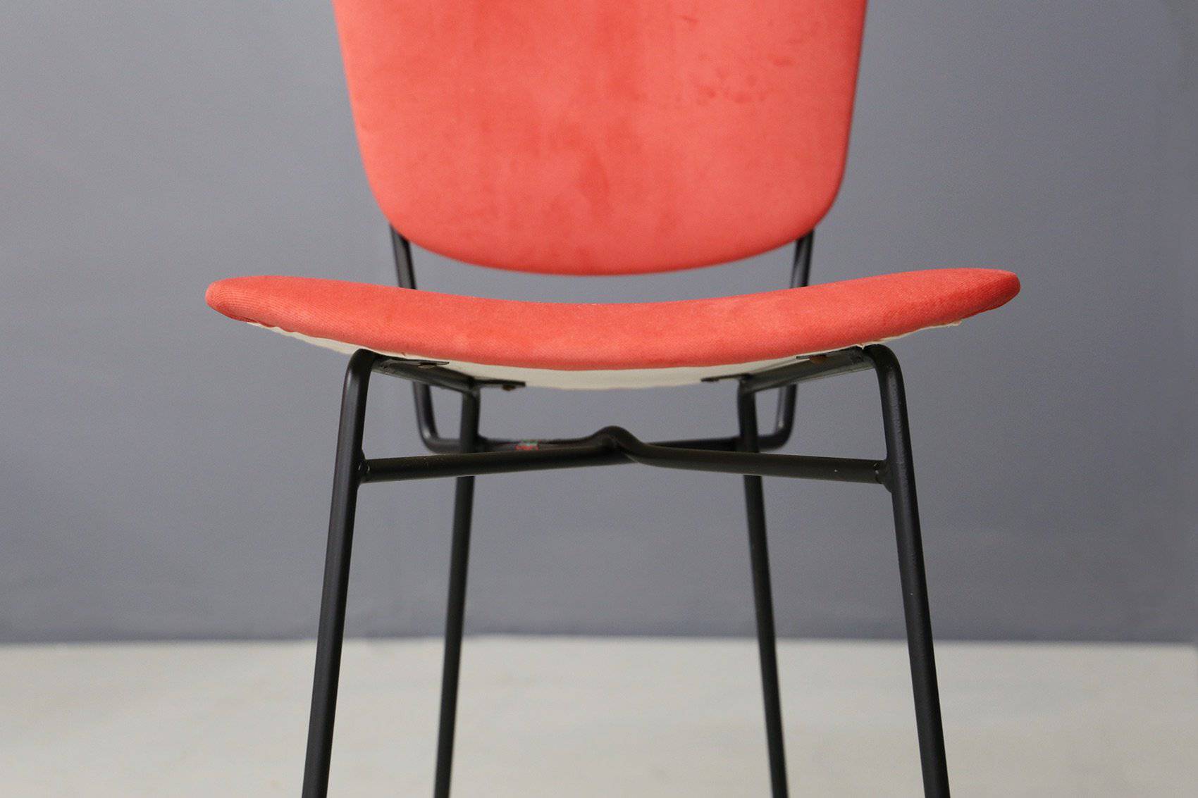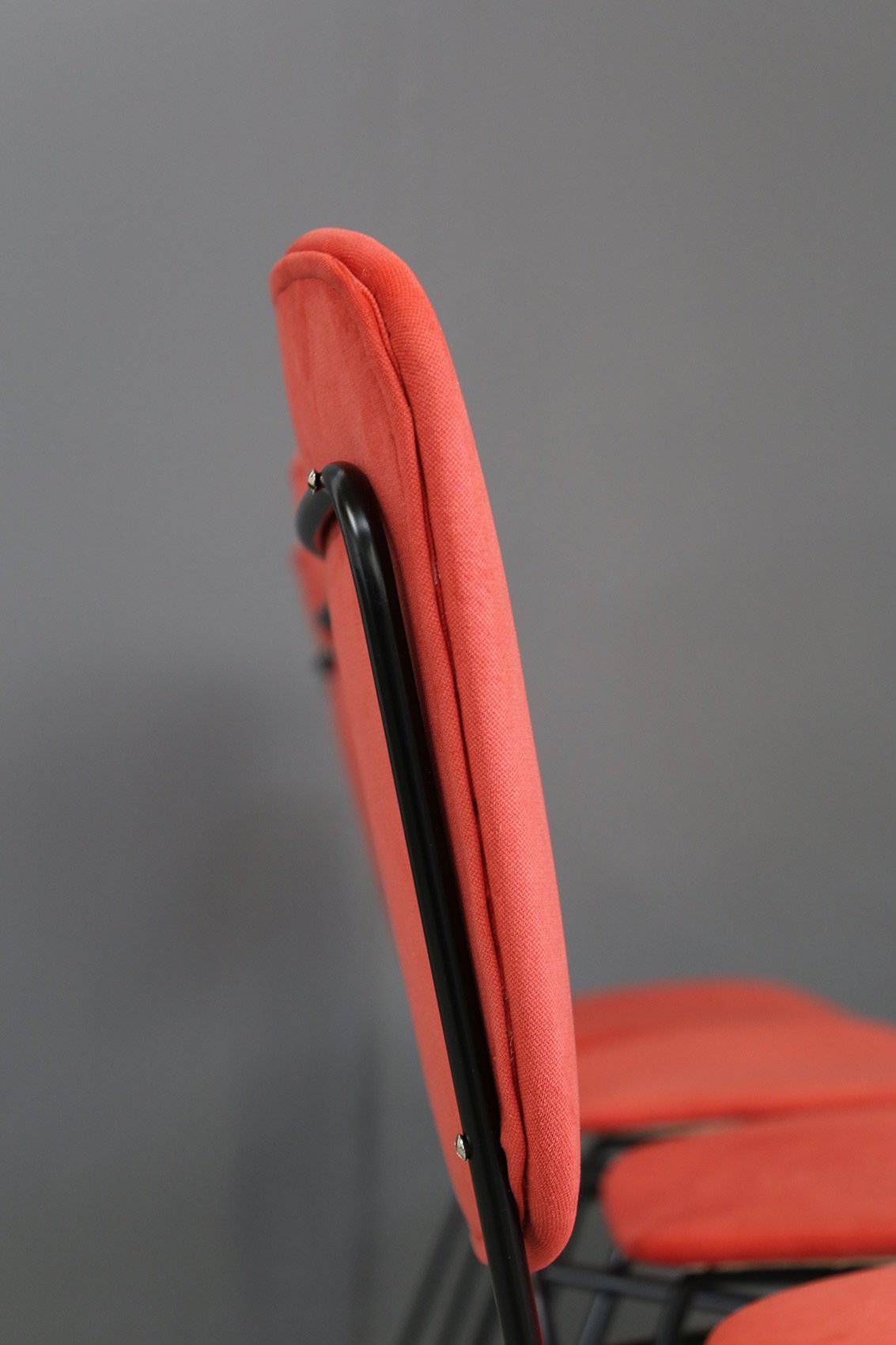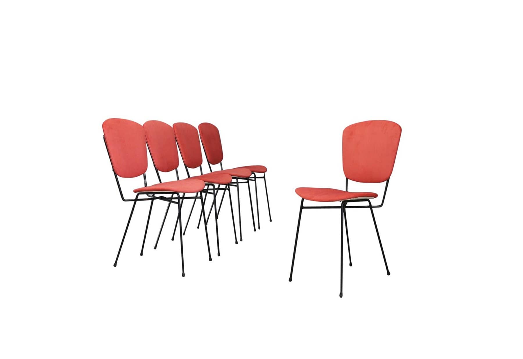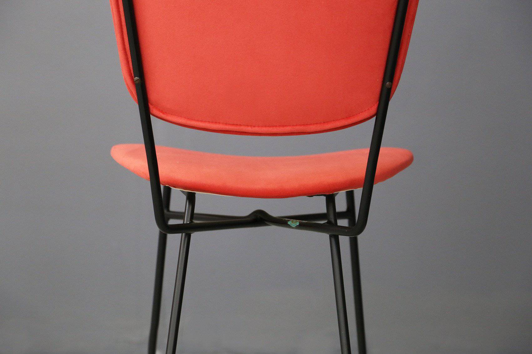 Cinque sedie con gambe in tondino di ferro verniciato nero e seduta e schienale in legno curvato foderato con tessuto rosso. Produzione DORO CUNEO. Etichetta del produttore. Anni '60. Restaurate. Mis. Lung. cm. 42 Alt. cm. 80 Prof. cm. 50 ca.