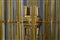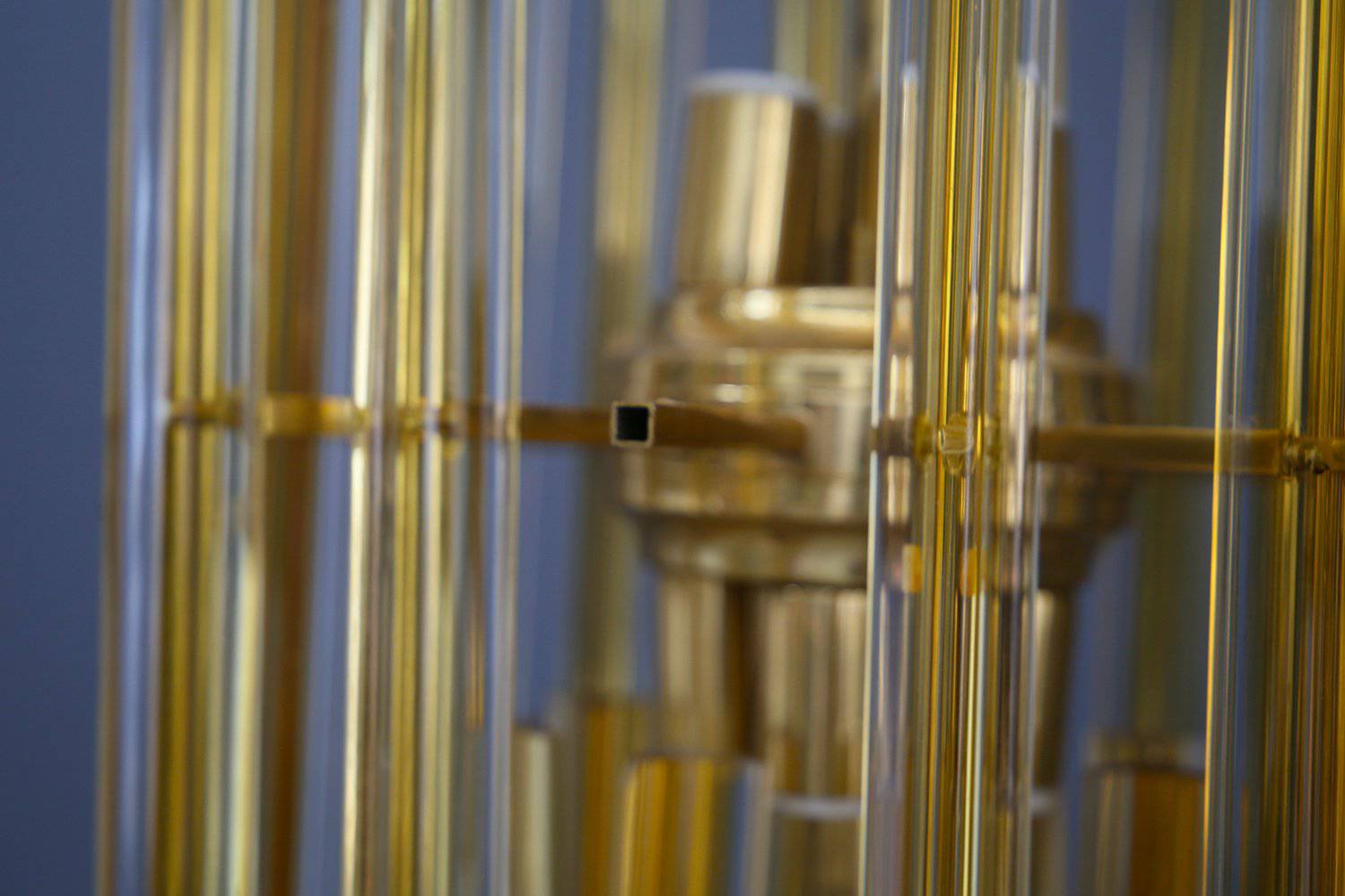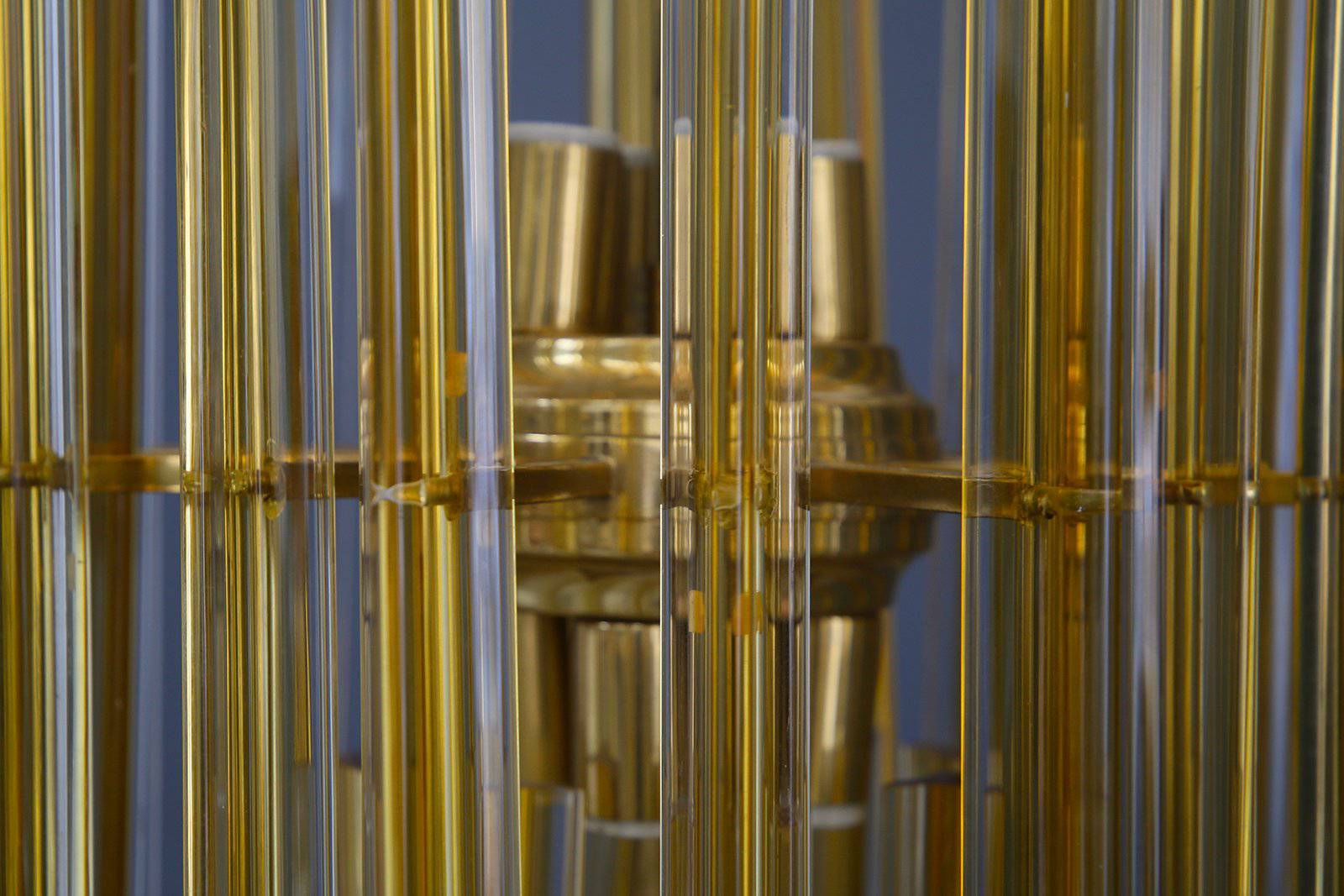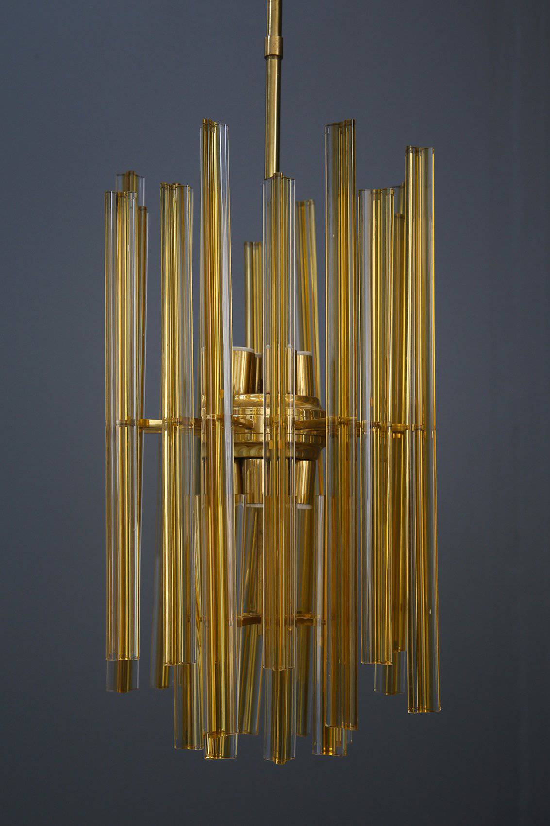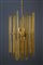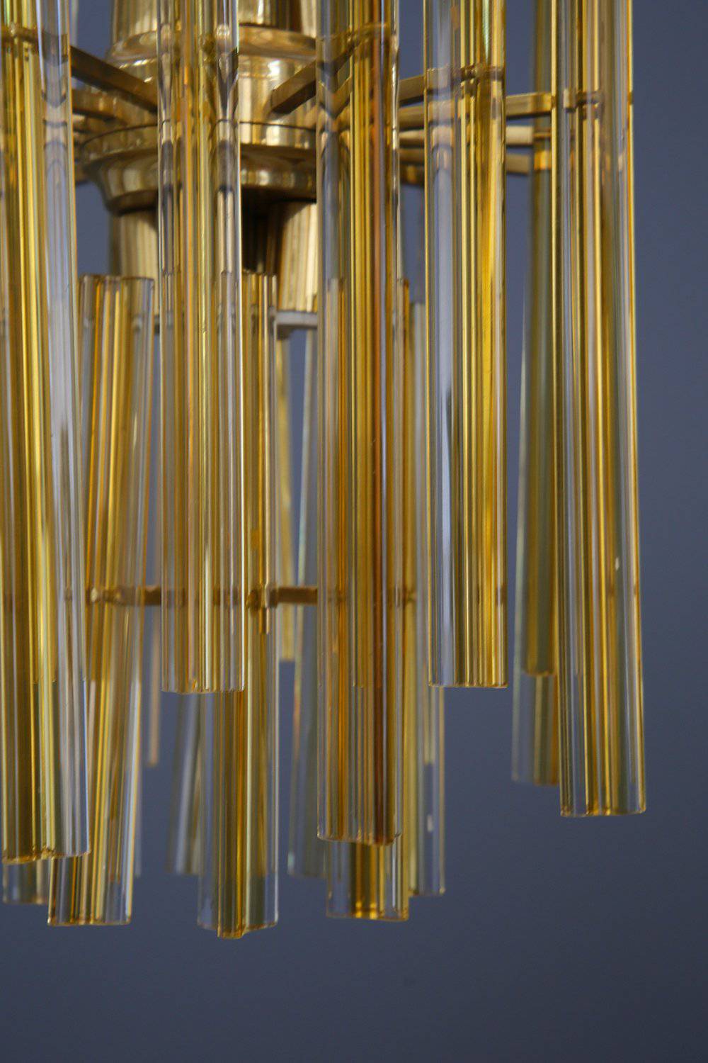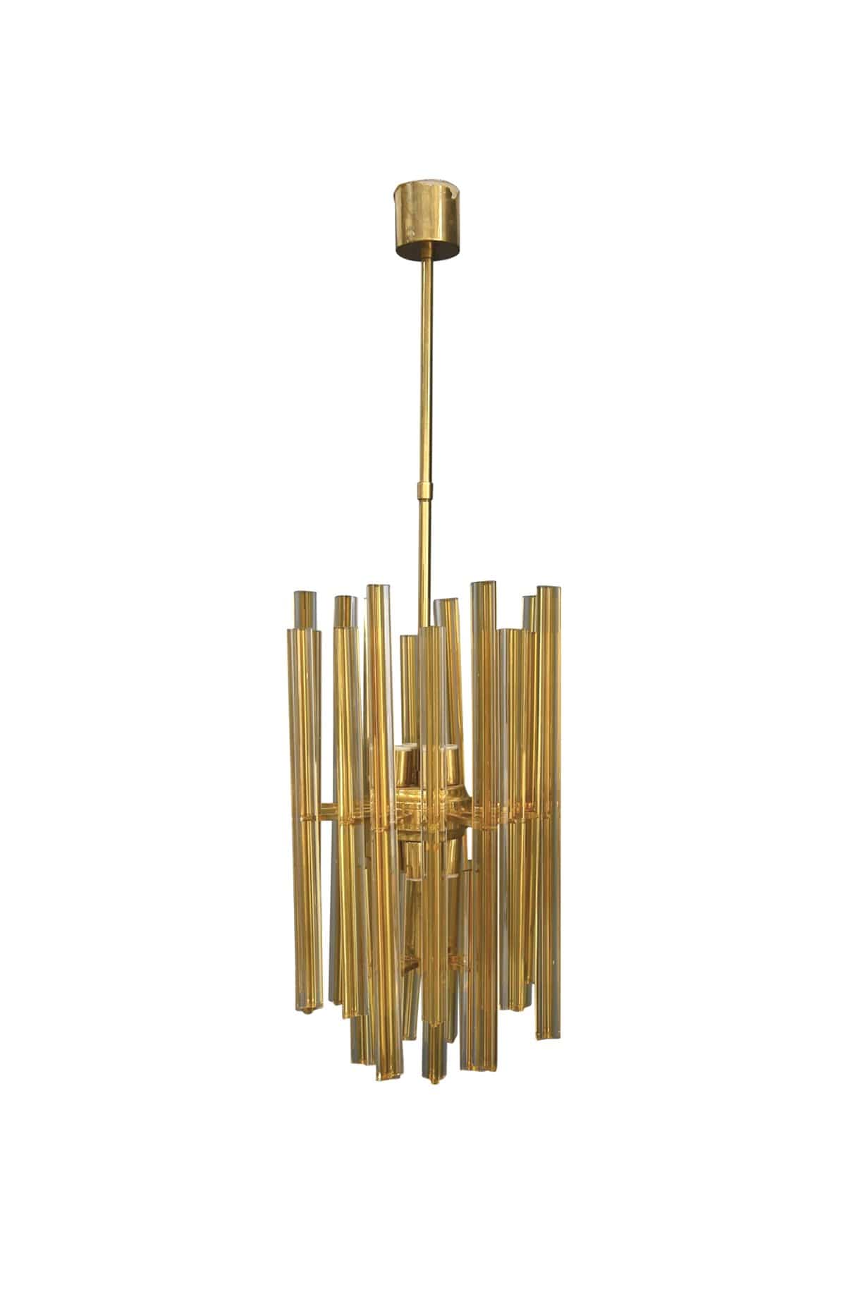 Lampadario in vetro massiccio dorato e ottone. Produzione VENINI. Anni '50. Mis. Alt. cm. 100 Diam. cm. 35 ca.
