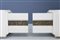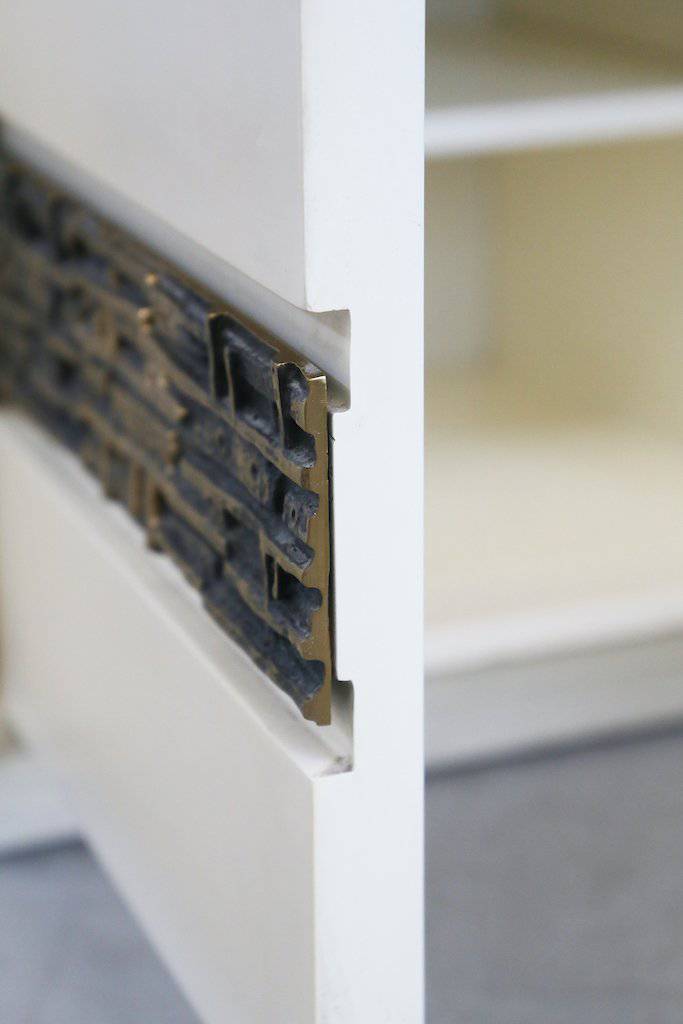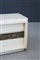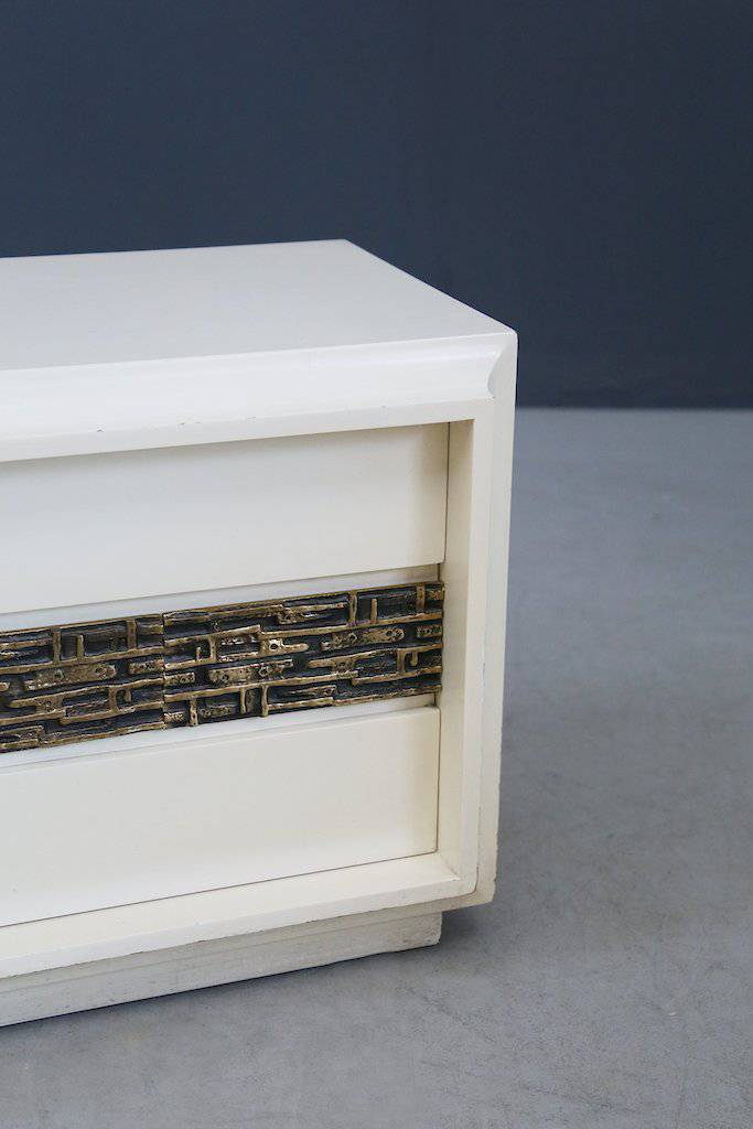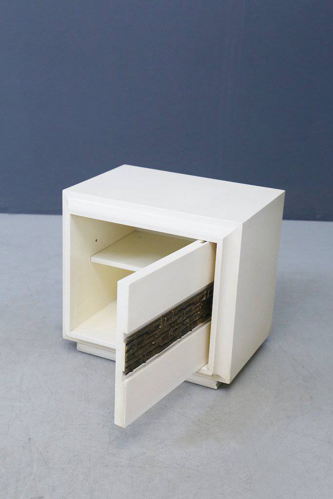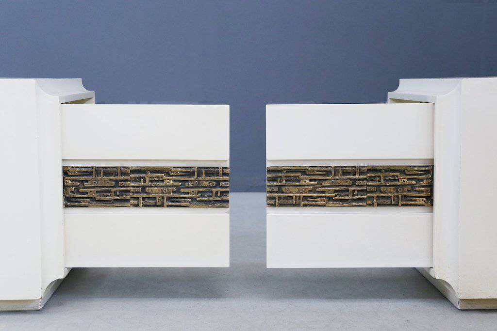 LUCIANO FRIGERIO (Desio, 1928 - Sanremo, 1999). Coppia di comodini in legno laccati e decorati con un fregio-scultura. Produzione FRIGERIO DI DESIO. Anni '70. Mis. Lung. cm. 54 Alt. cm. 50 Prof. cm. 40 ca.