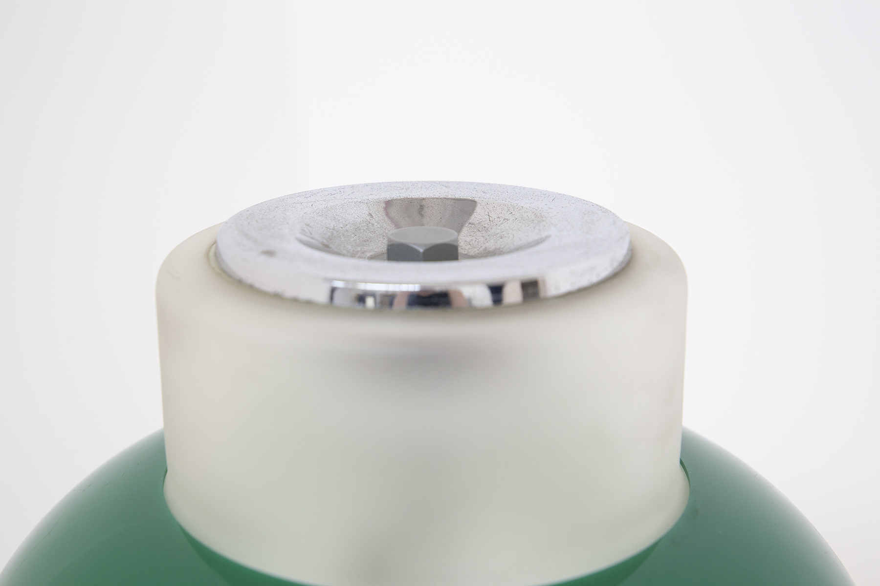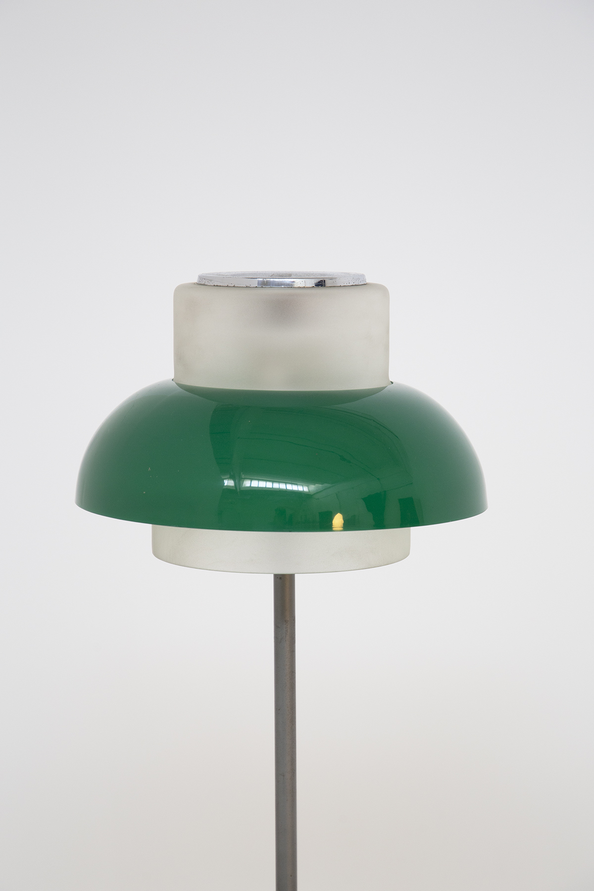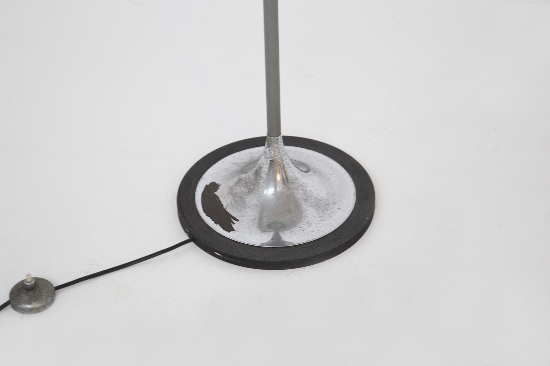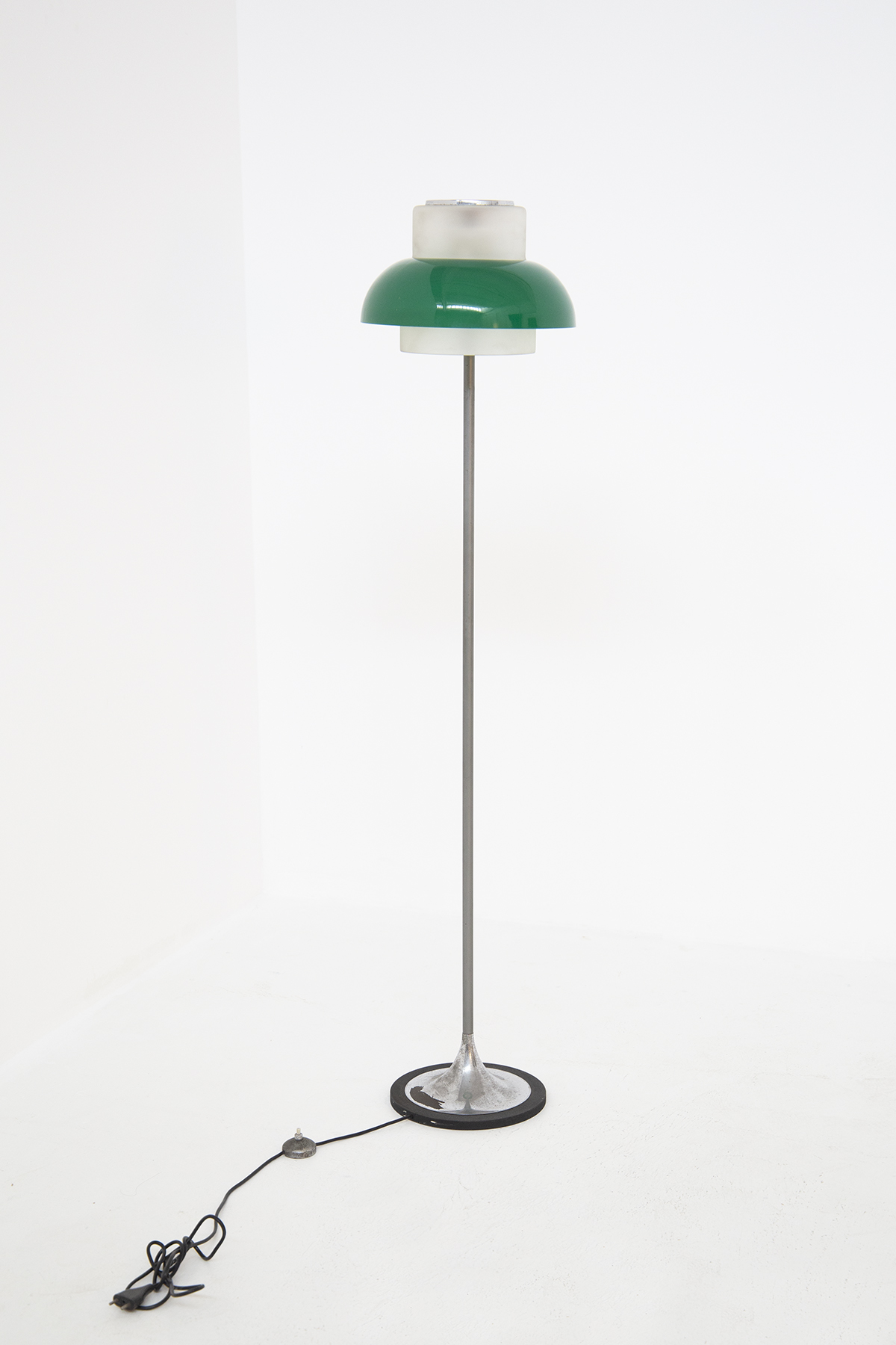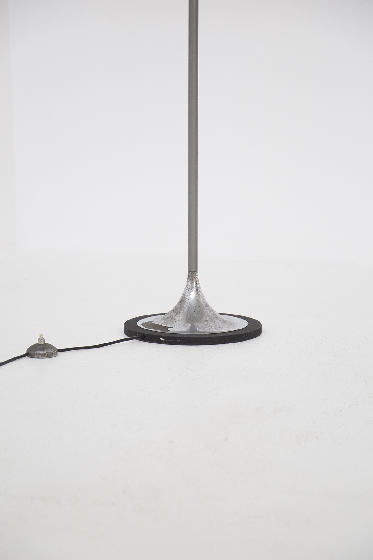 Lampada da terra in vetro nichelato, ottone e plexiglass. Produzione STILNOVO. Anni '60 Mis. Alt. cm. 140 Diam. cm. 30 ca.