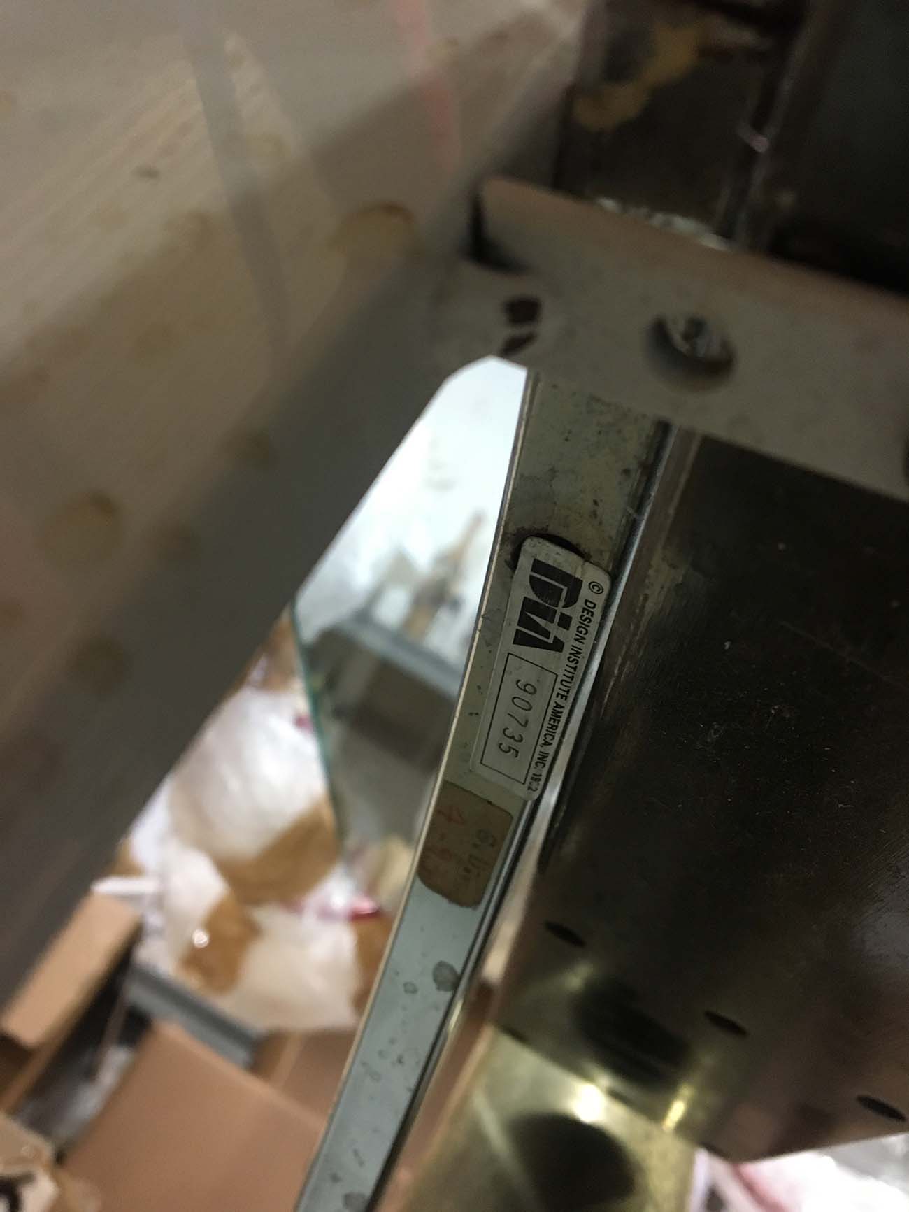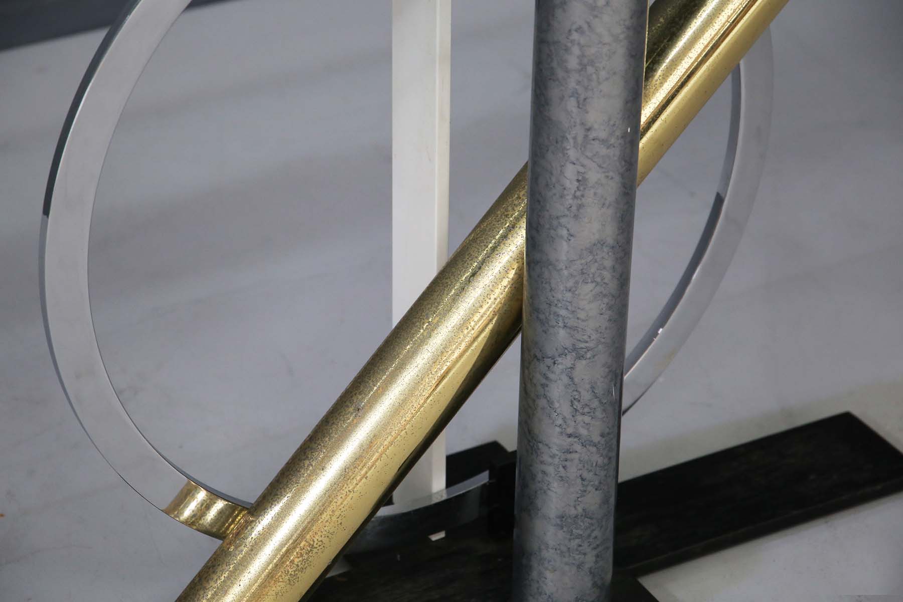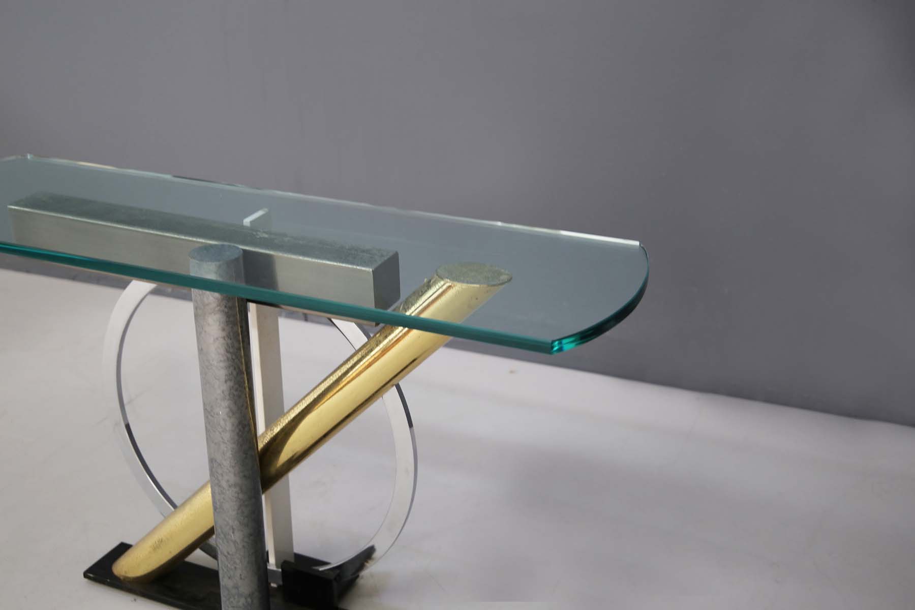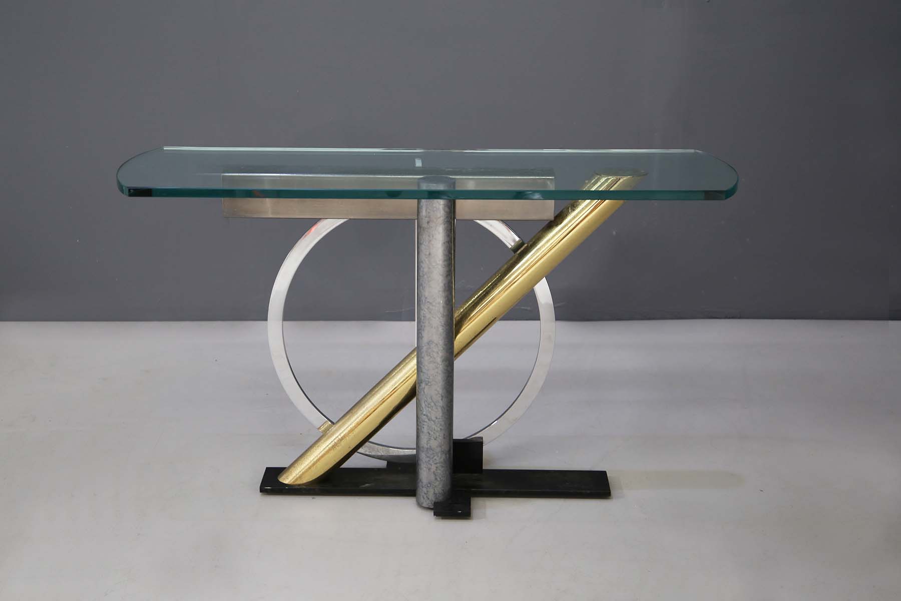 Elegante consolle in vetro, ottone, acciaio e ferro. Produzione DIA (Design Institute America). Con etichetta del produttore. Anni '60.