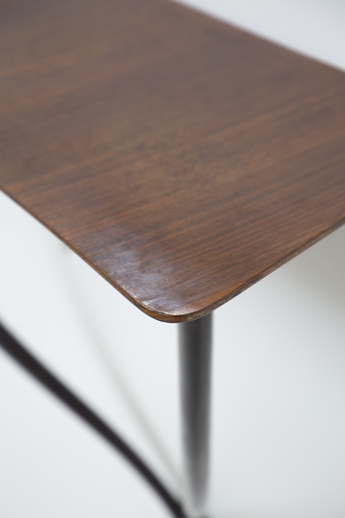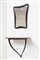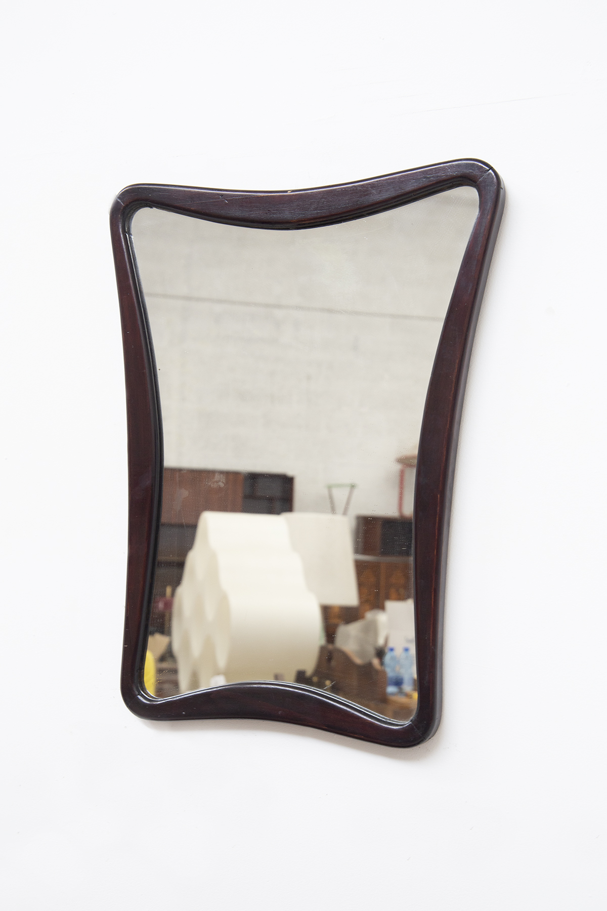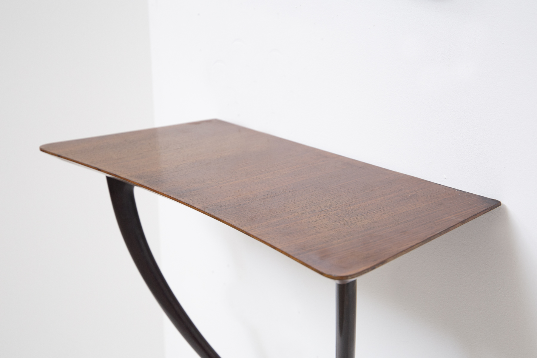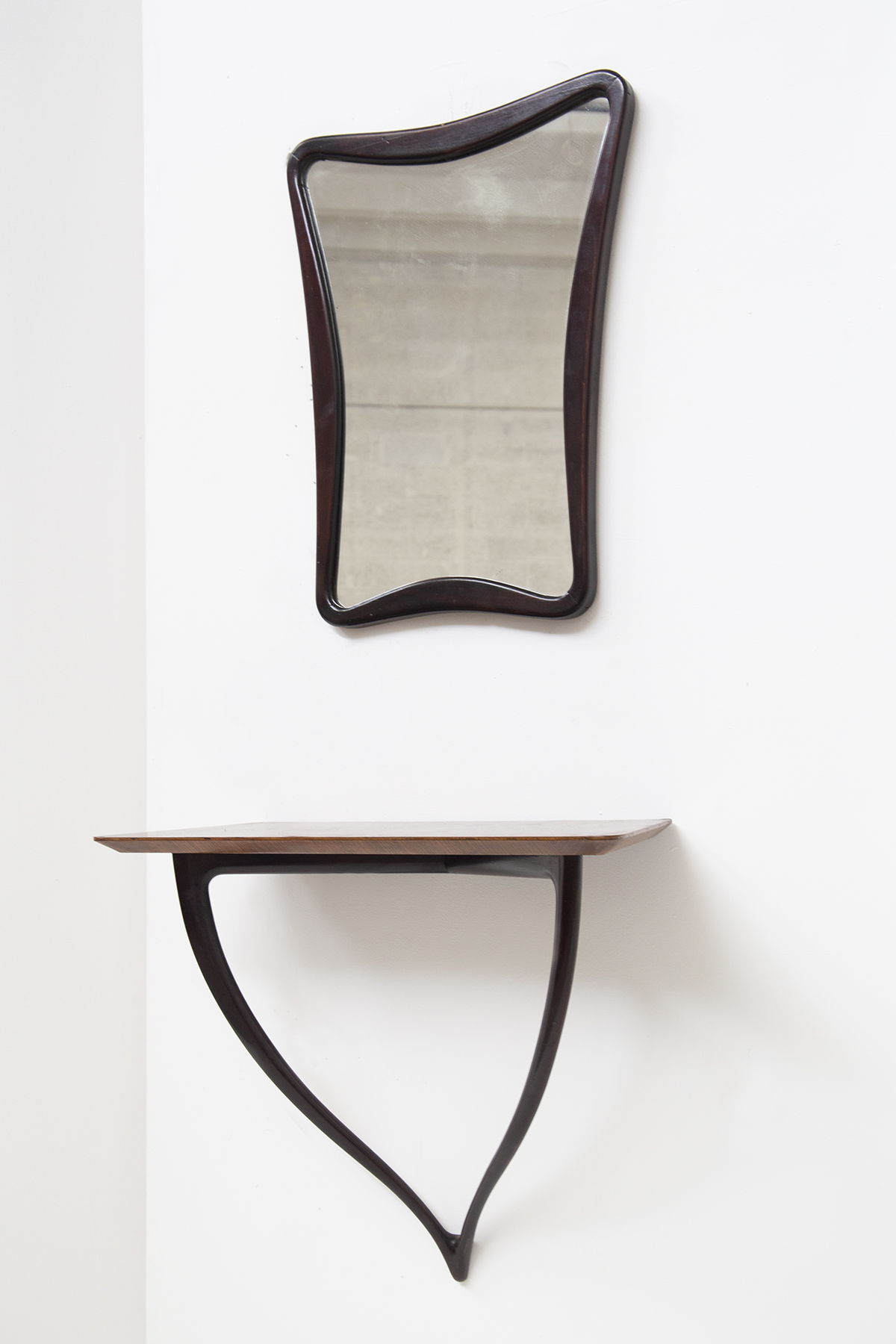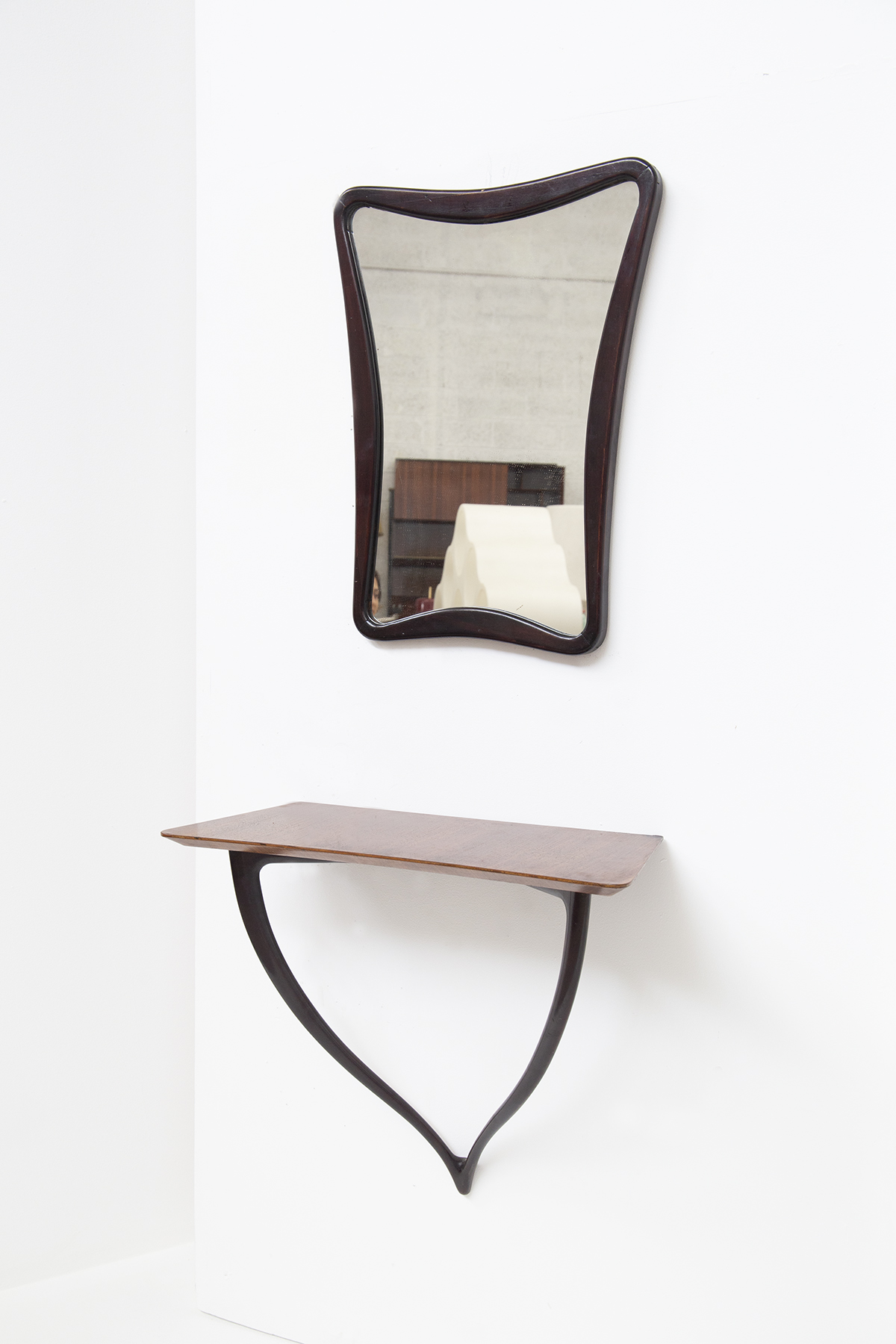 CESARE LACCA (Napoli, 1929). Consolle sospesa in legno e specchiera. Anni '50. Mis. consolle cm. 61x74x30 ca. Mis. specchio cm. 70x54x3 ca.