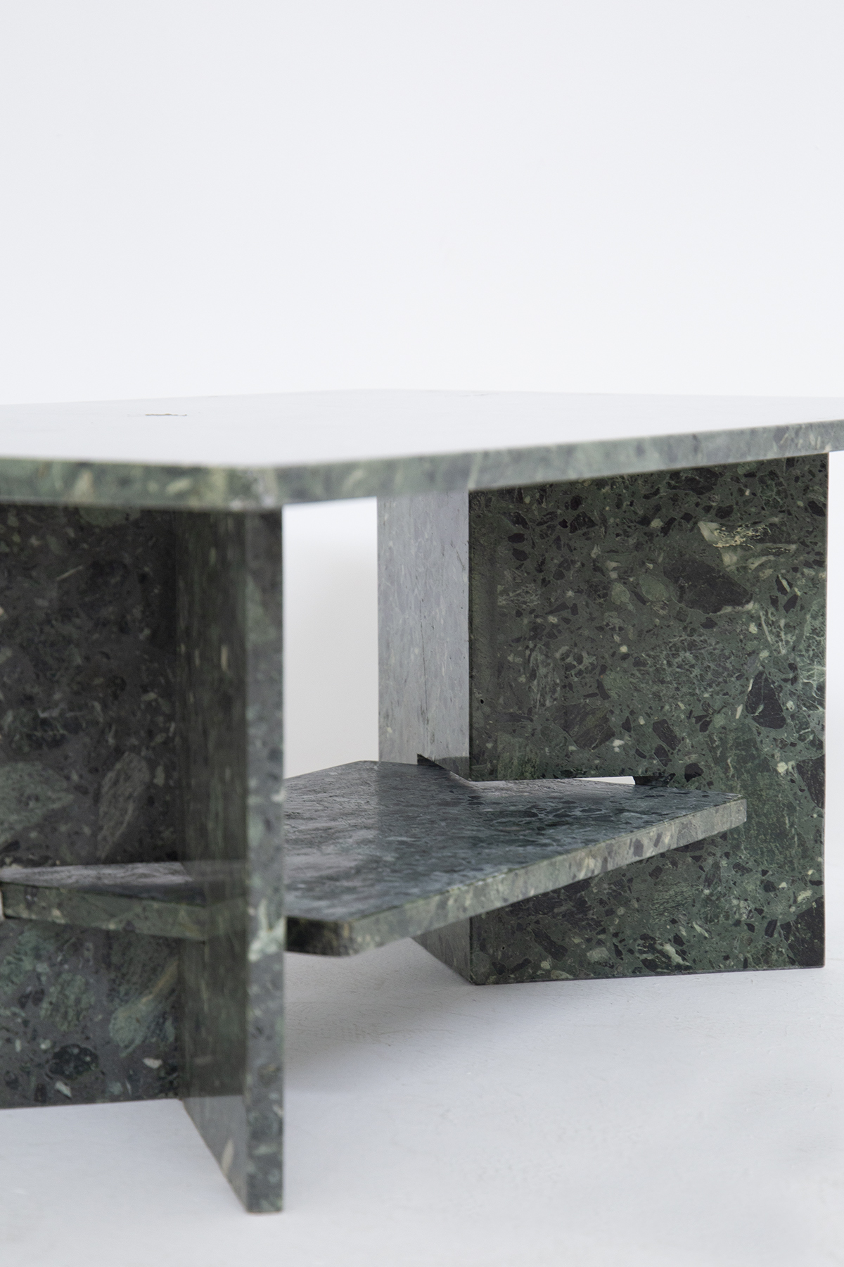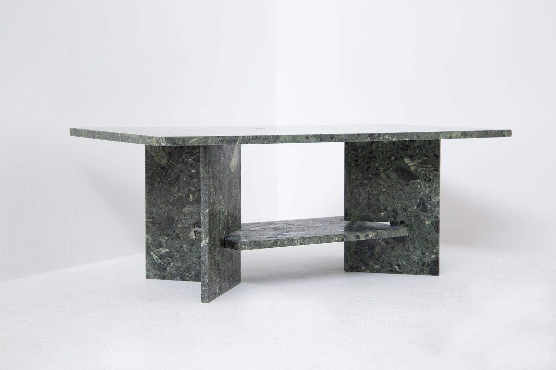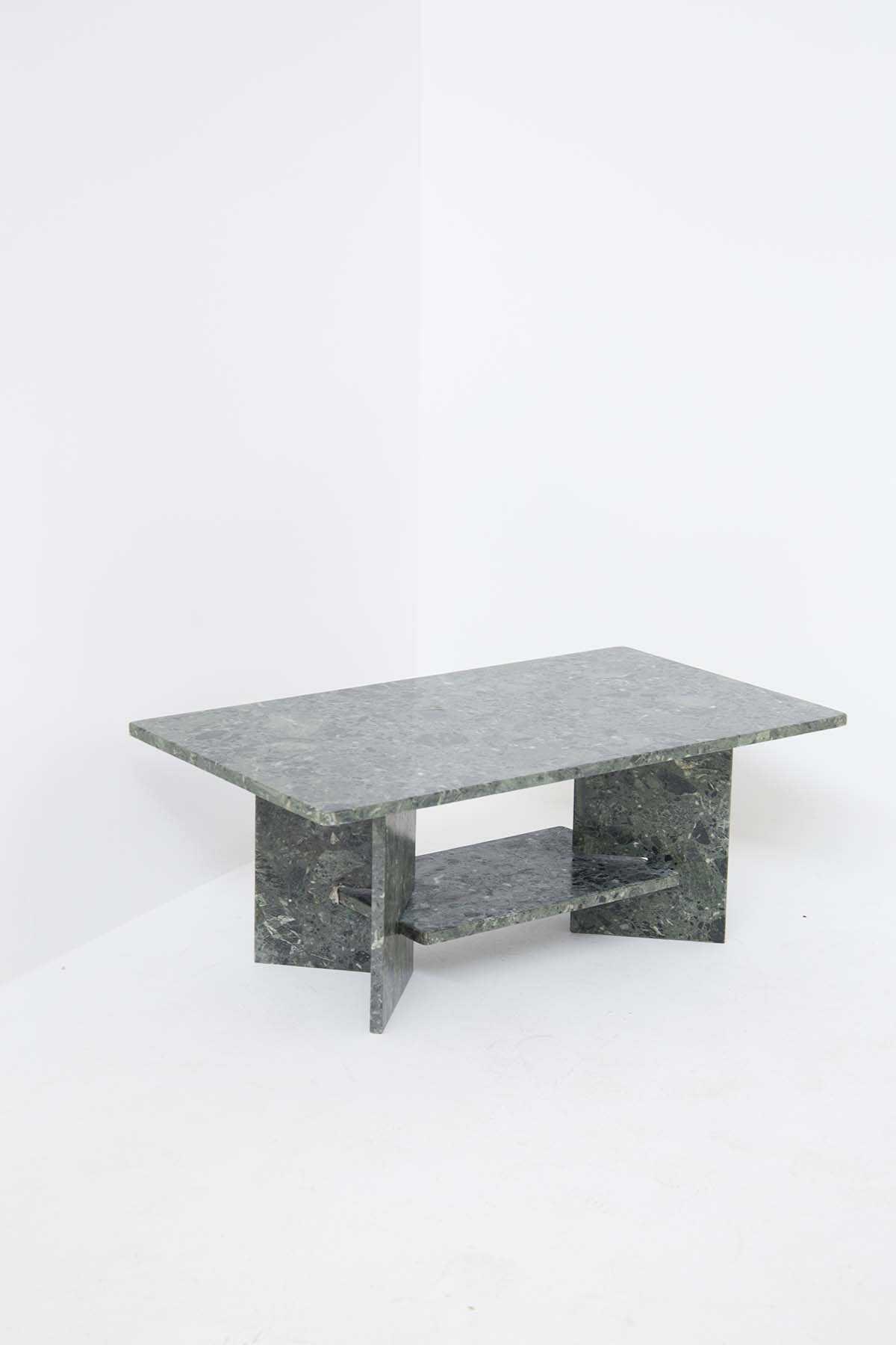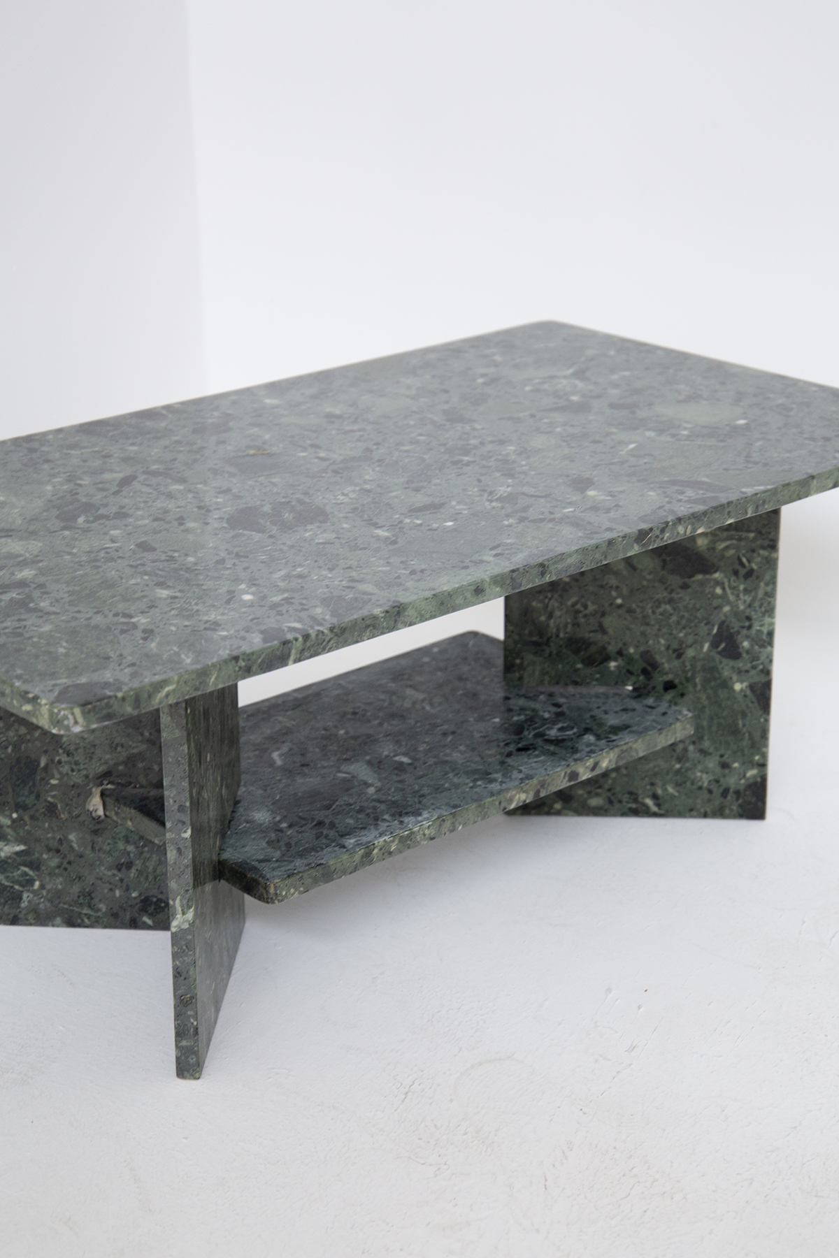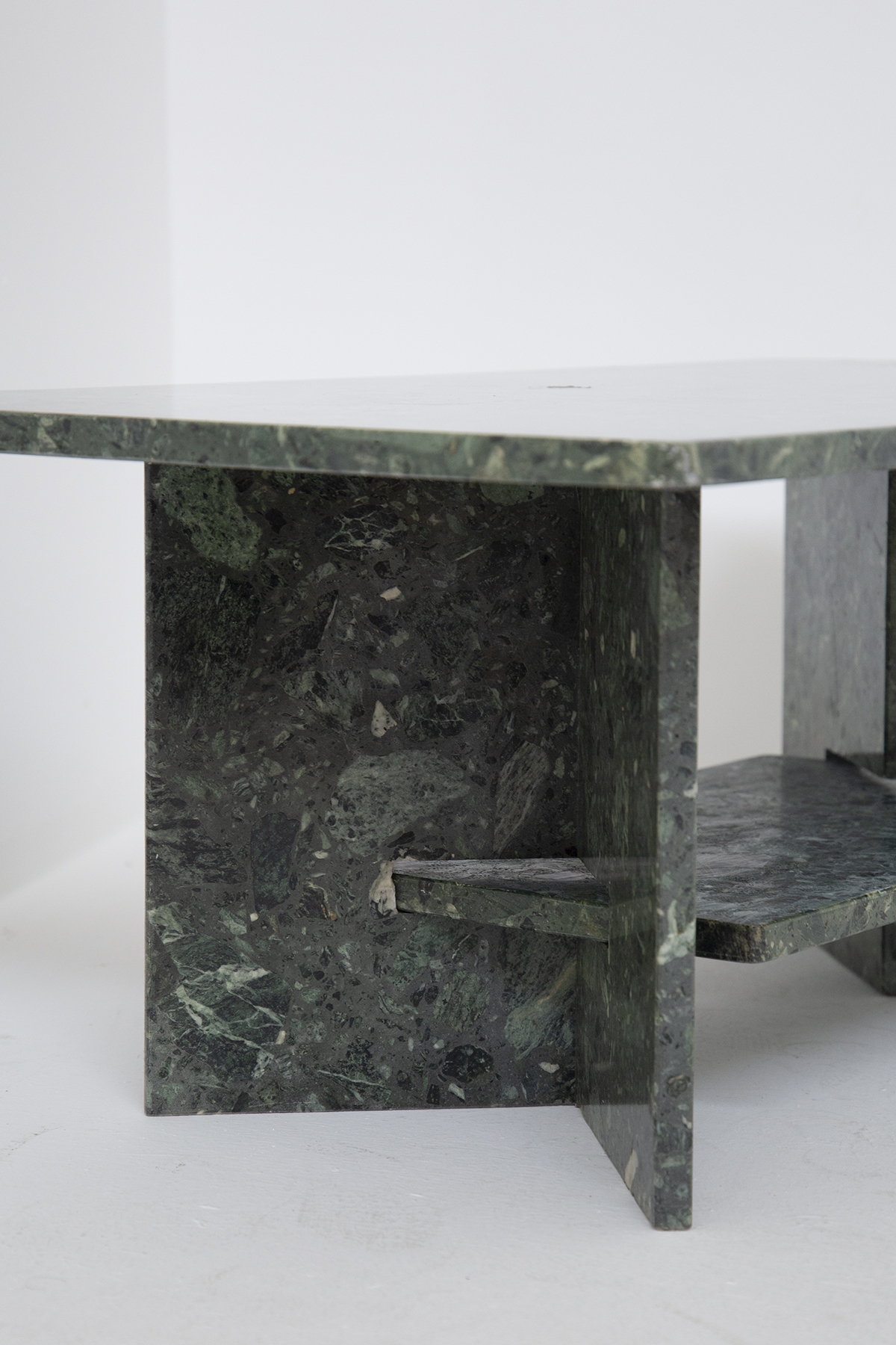 Tavolino in marmo verde Alpi. Manifattura italiana. Anni '70. Mis. Lung. cm. 99 Alt. cm. 39 Prof. cm. 55 ca.