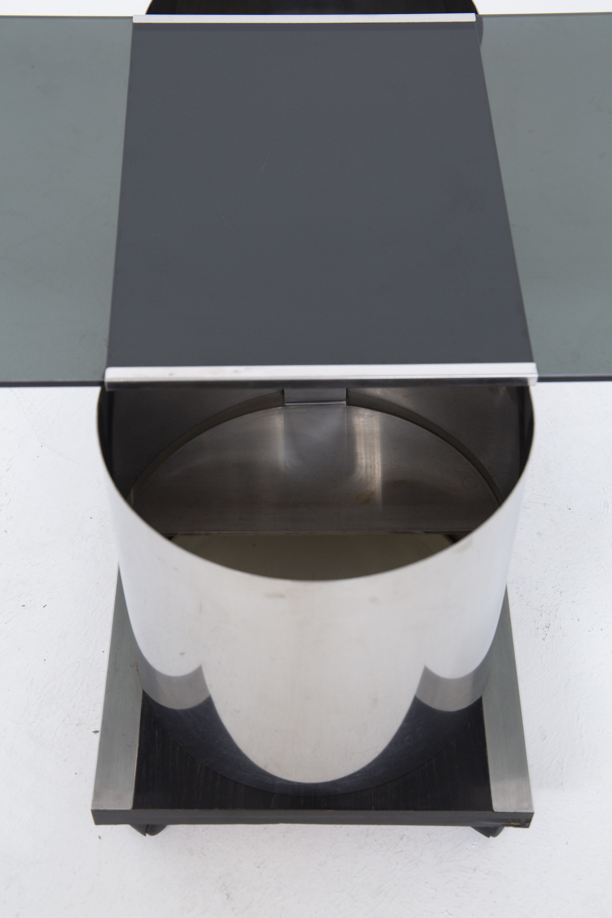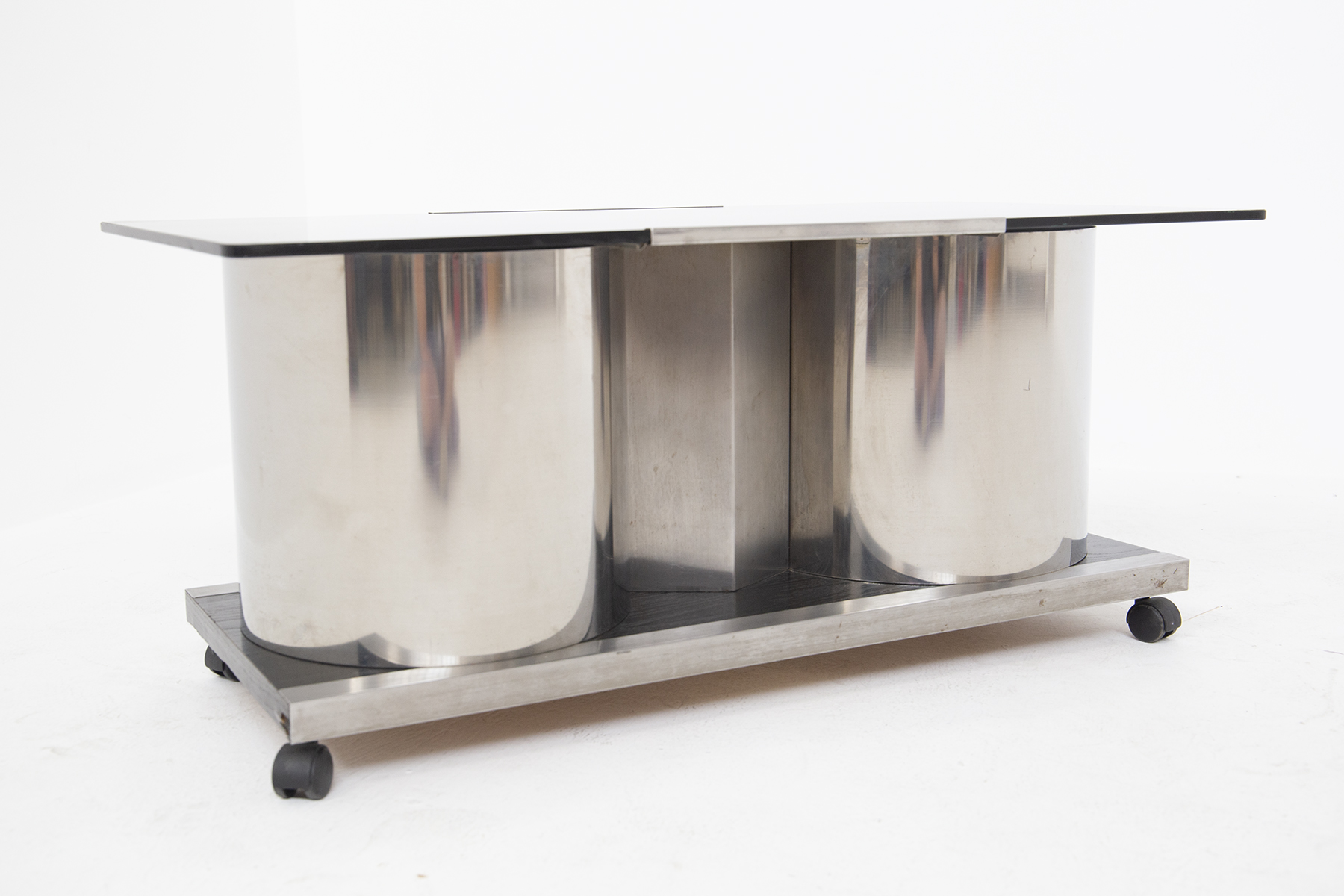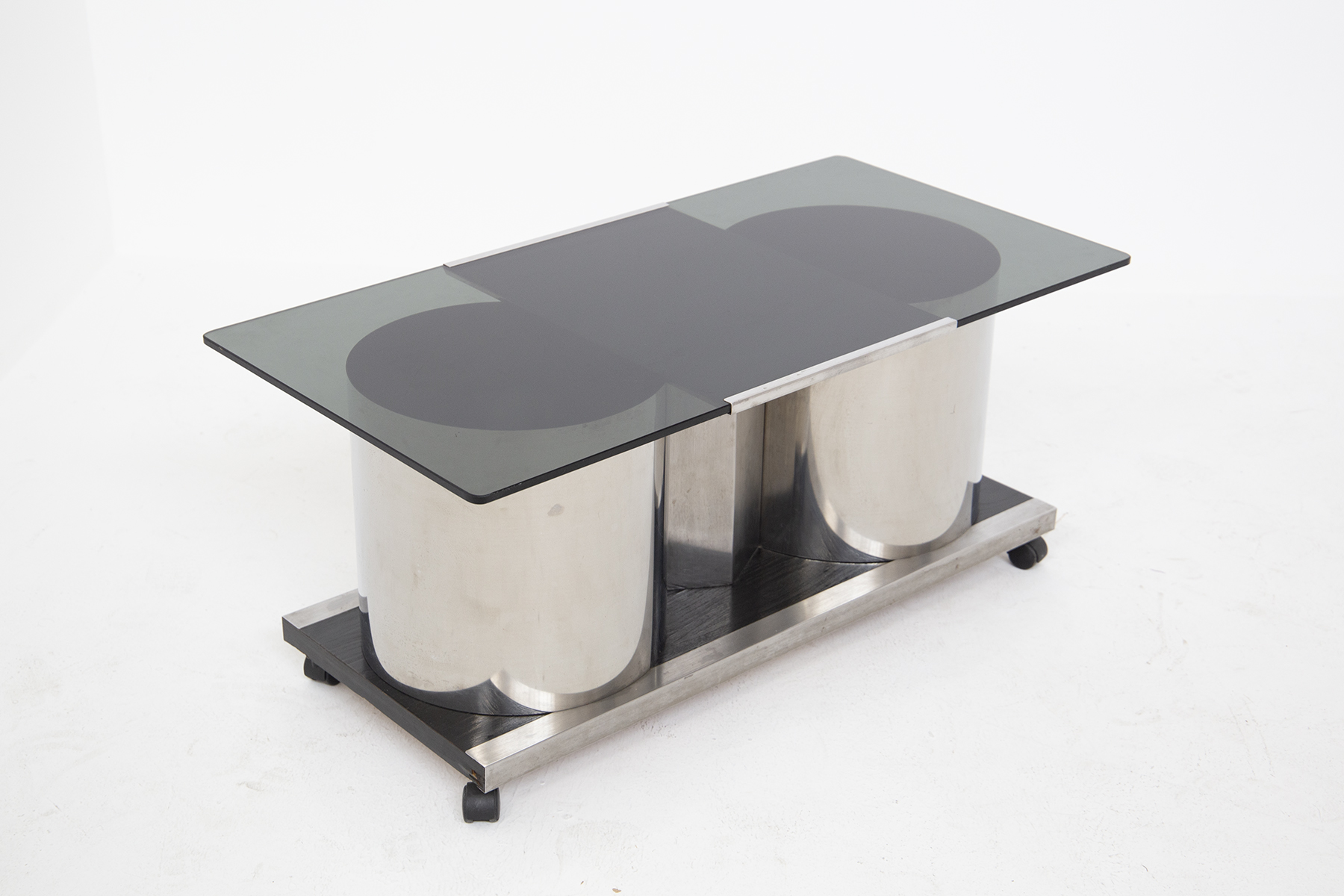 LODOVICO ACERBIS (Albino, 1939 - 2021) per ACERBIS. Tavolino in metallo con piano in vetro a remuovibile. Anni '70. Mis. Lung. cm. 100 Alt. cm. 44 Prof. cm. 50 ca.