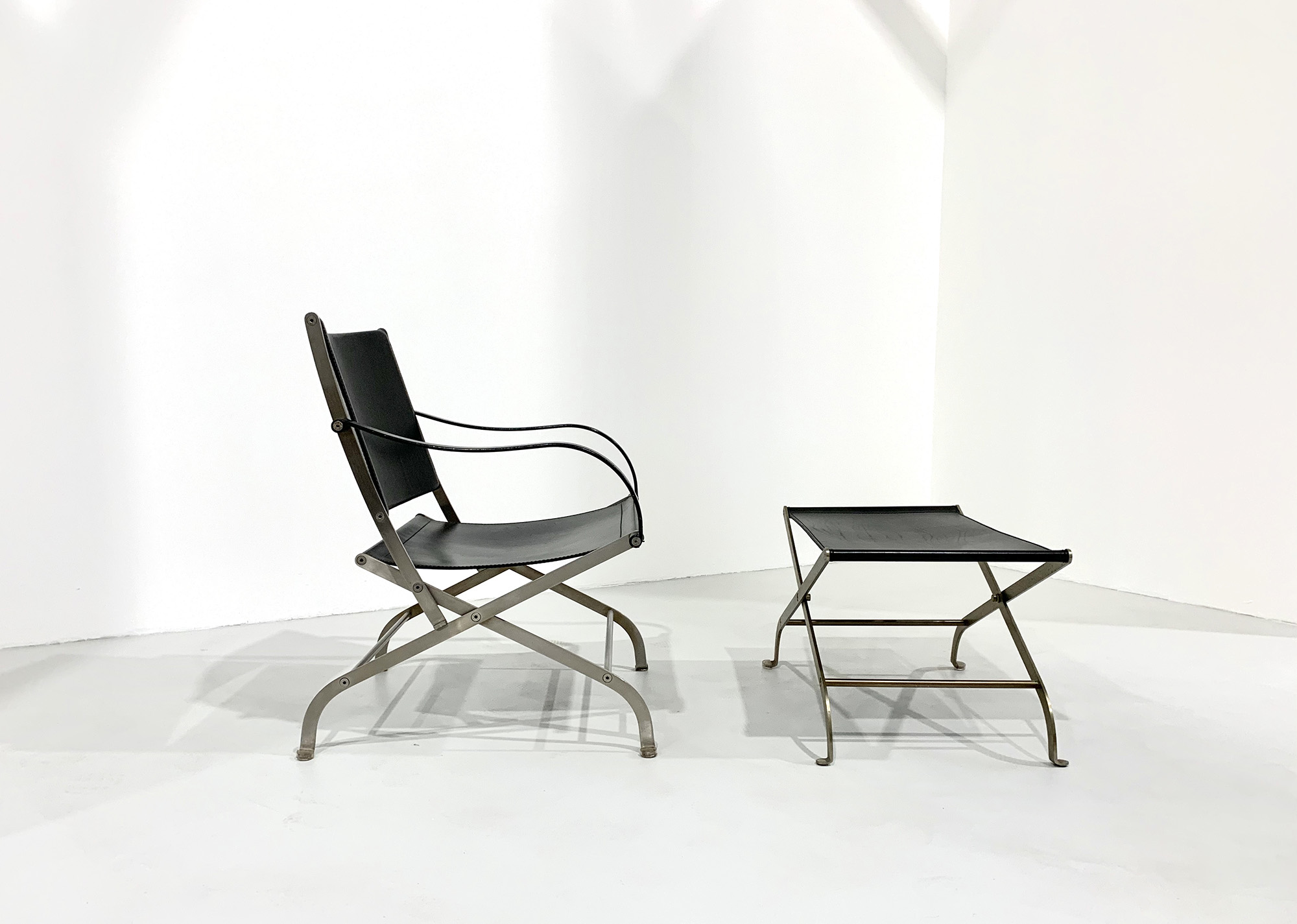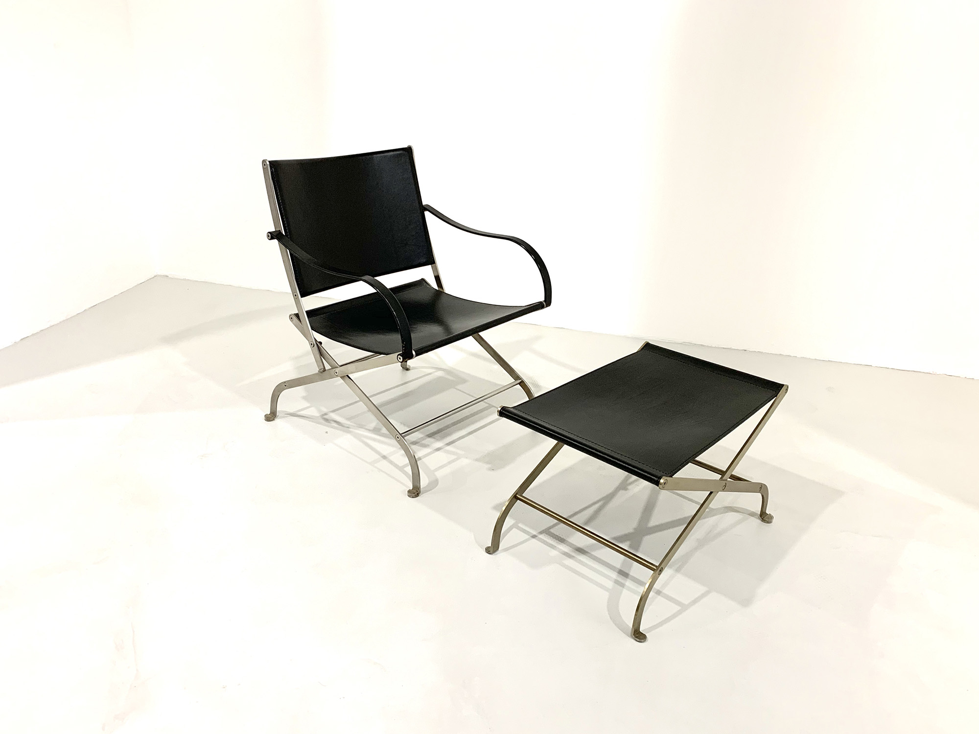 ANTONIO CITTERIO (Meda, 1951)per FLEXFORM. Sedia con pouf in pelle nera e acciaio. Anni '70. Misure sedia: Alt. 77 cm Larg. 59 Prof. 55 cm ca Misure pouf: Alt. 40 cm Larg. 59 Prof. 36 cm ca