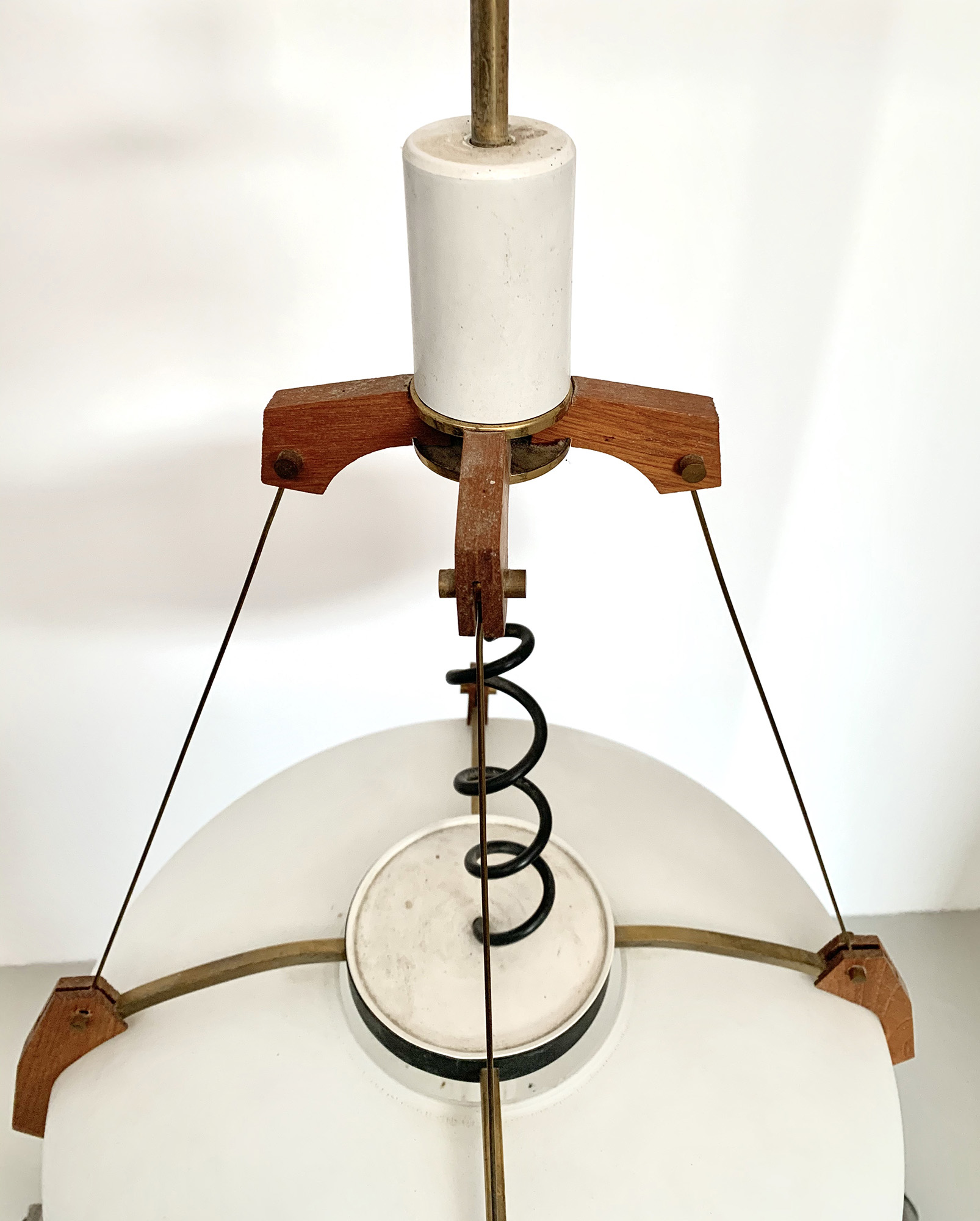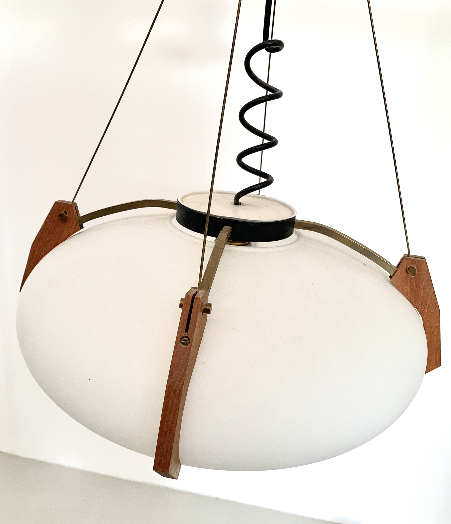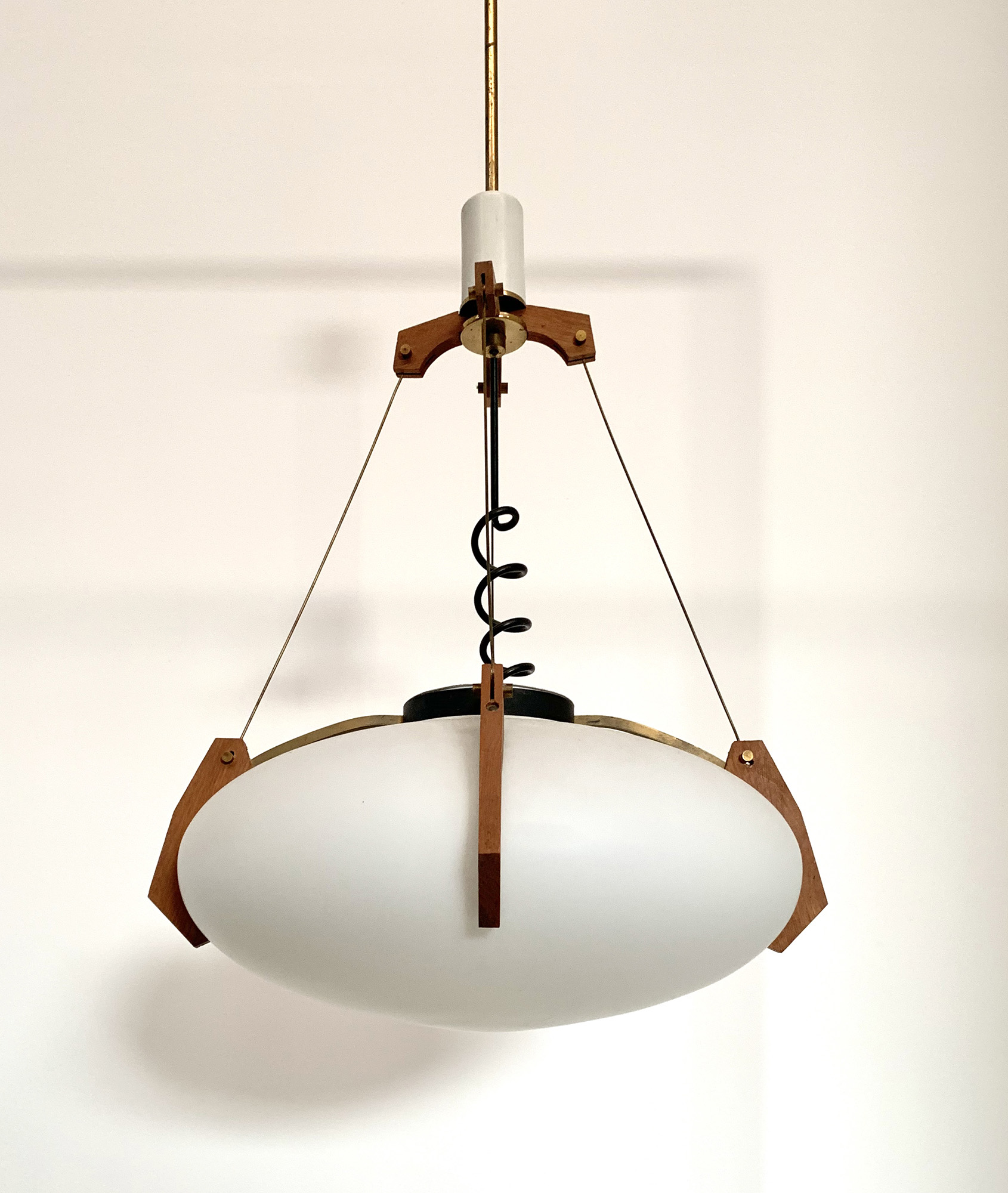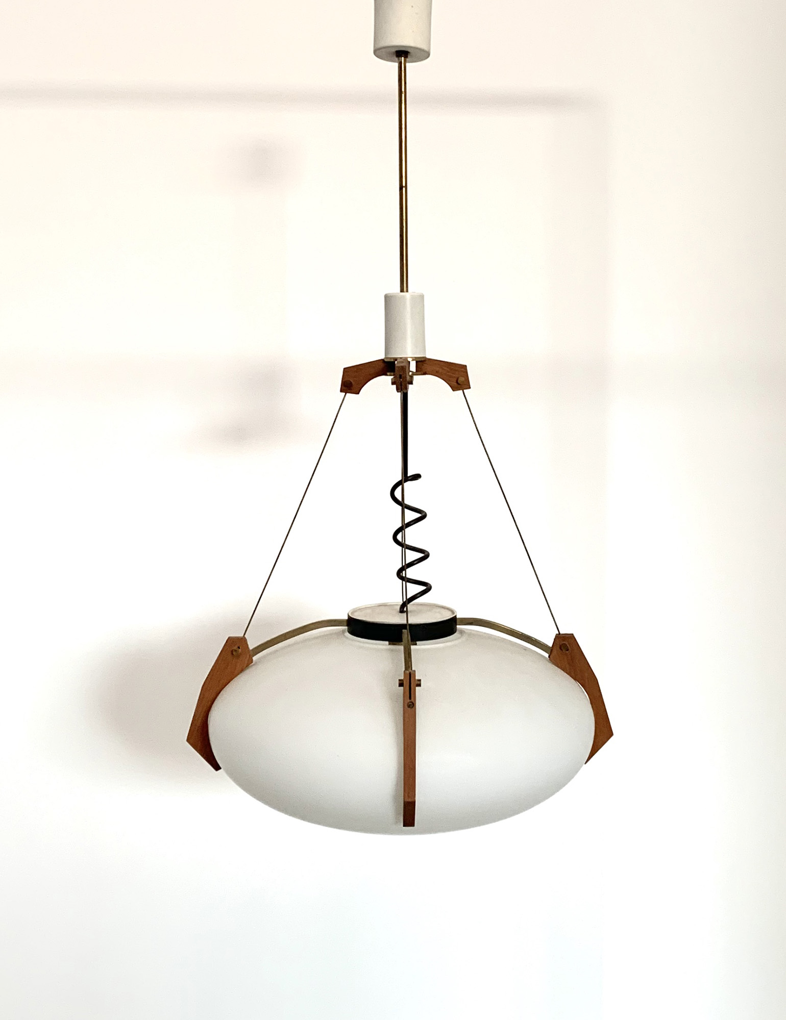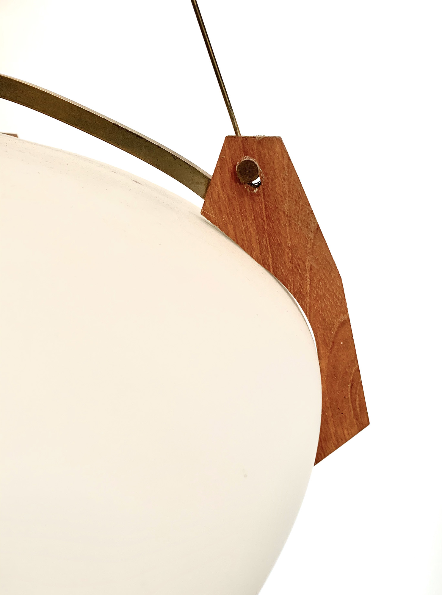 BRUNO CHIARINI. Lampadario in vetro opalino, metallo e legno. Anni '60. Mis. Alt. cm. 95 Diam. cm. 50 ca.